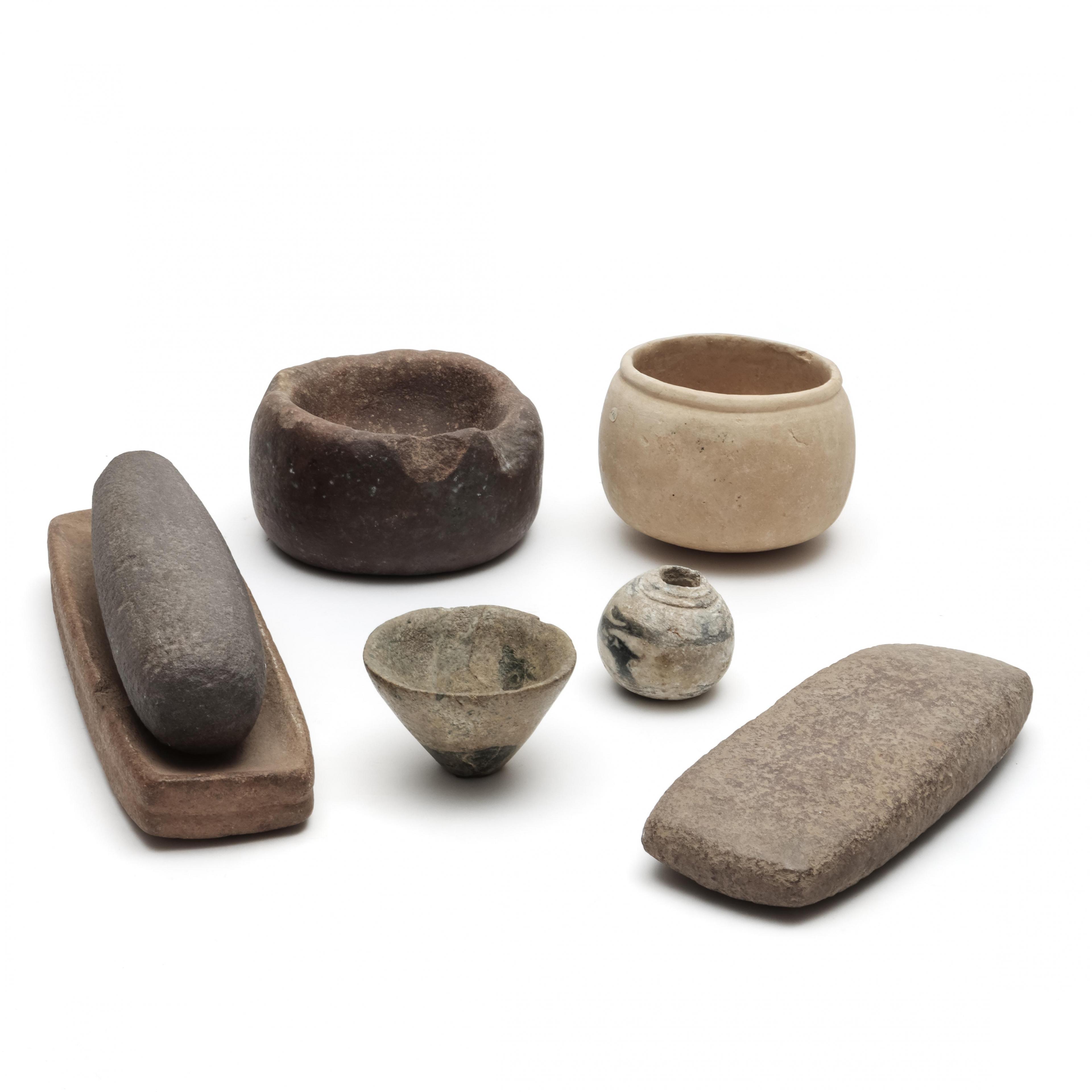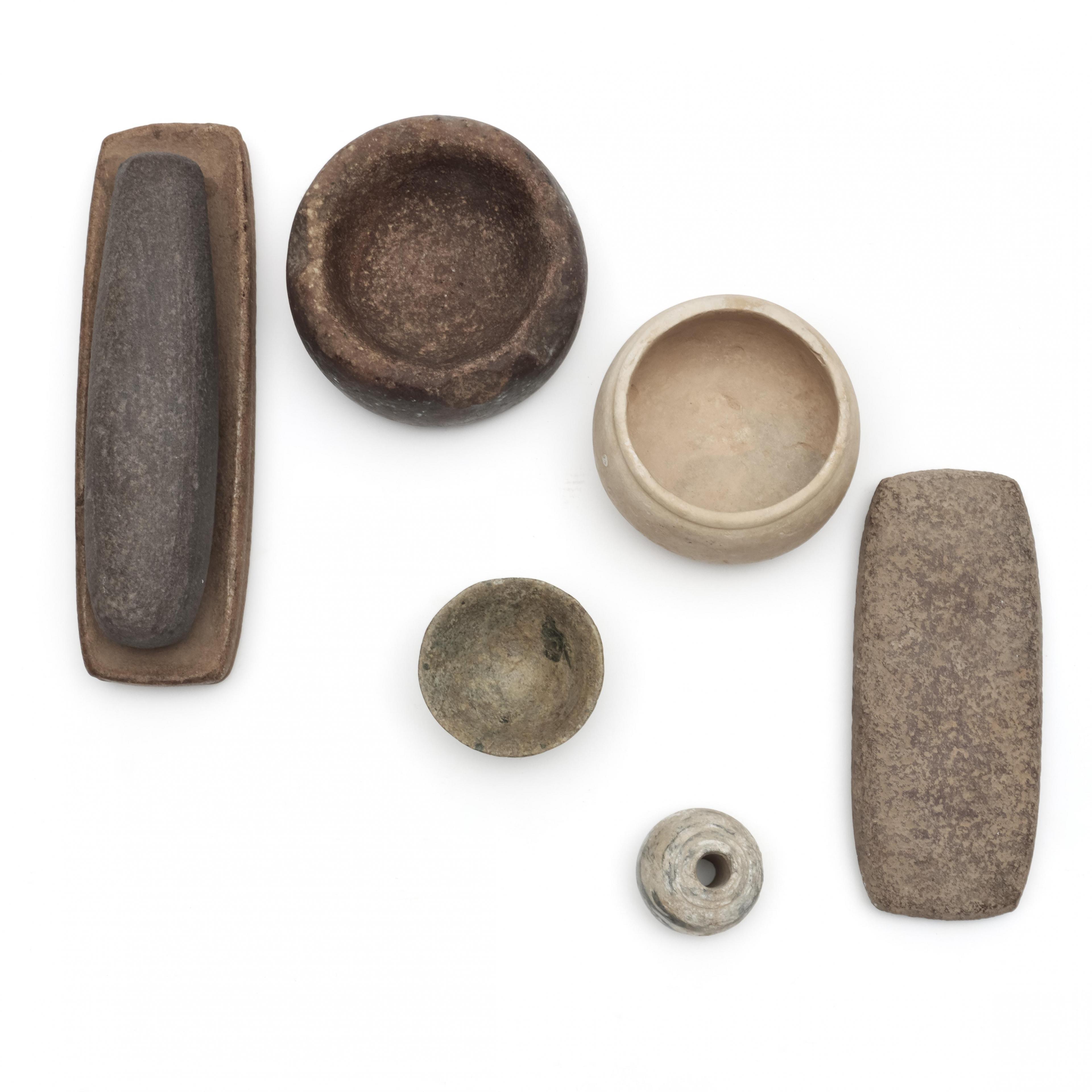 a alabaster deep cut bowl, a cylindrical stone pestle and a stone rectangular mortar, a stone mortar, a flat stone and a marble large bead-shaped object.