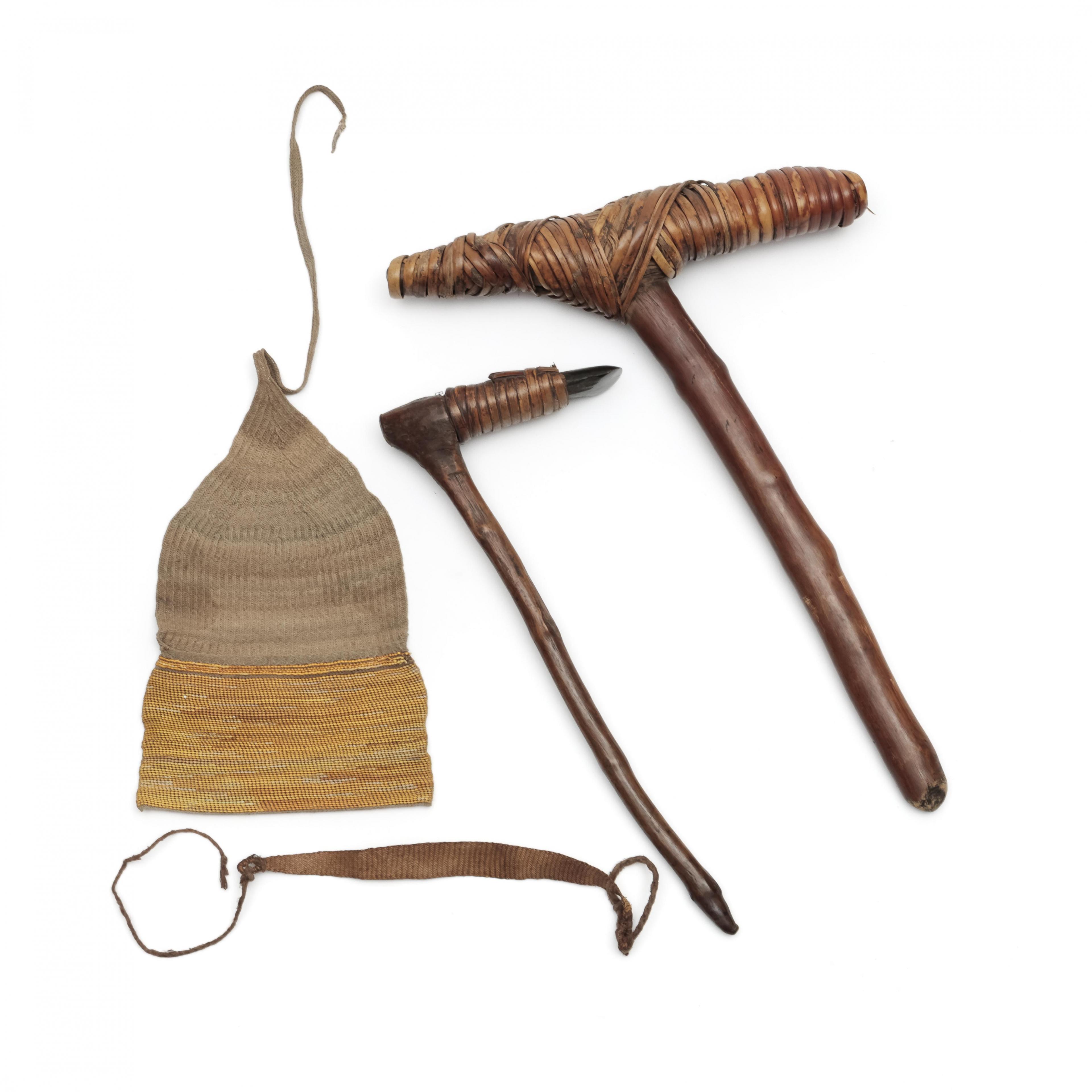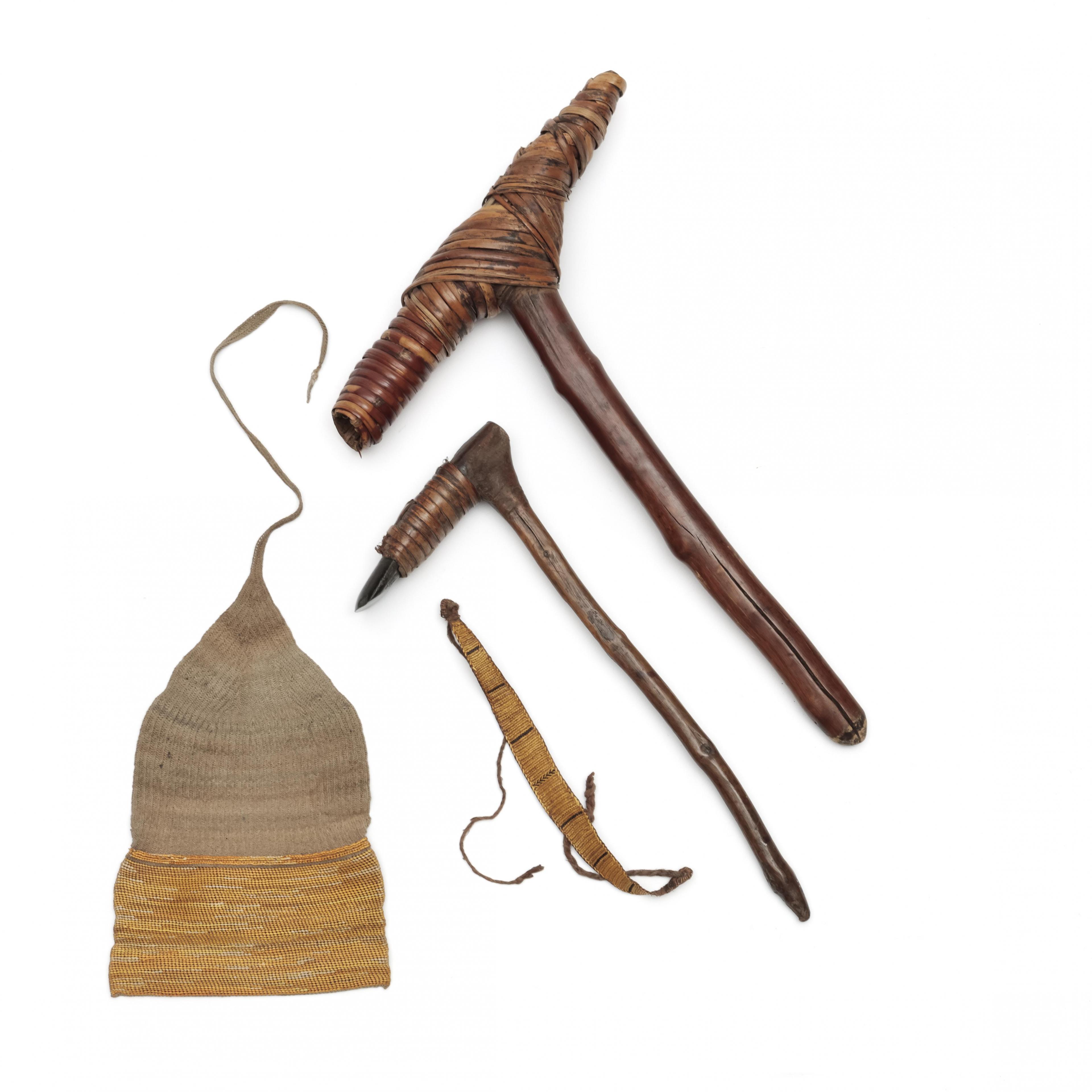 Papua, Asmat, two adze, and P.N. Guinea, a plant fiber bag and bracelet,