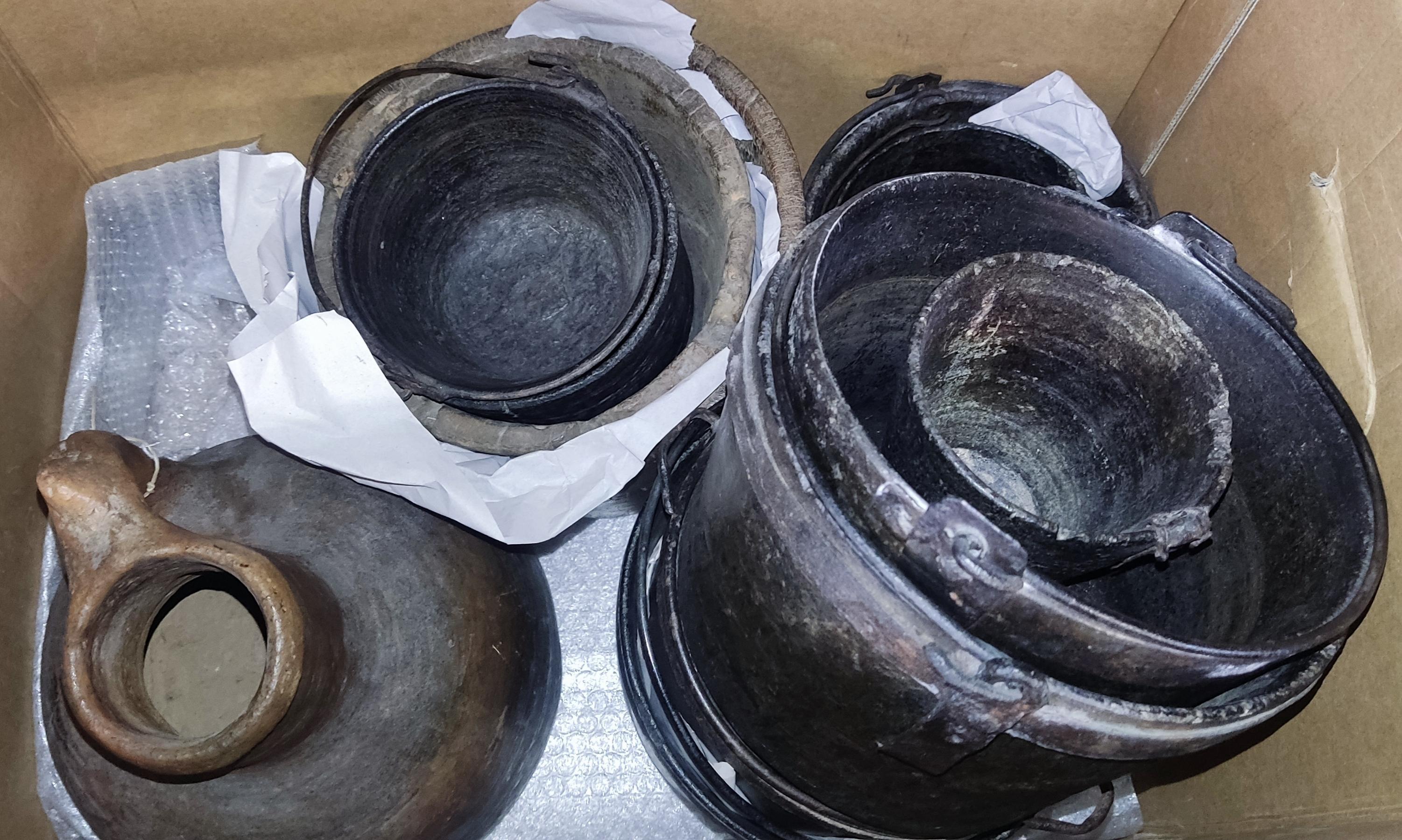Lot met diverse antieke kookpotten