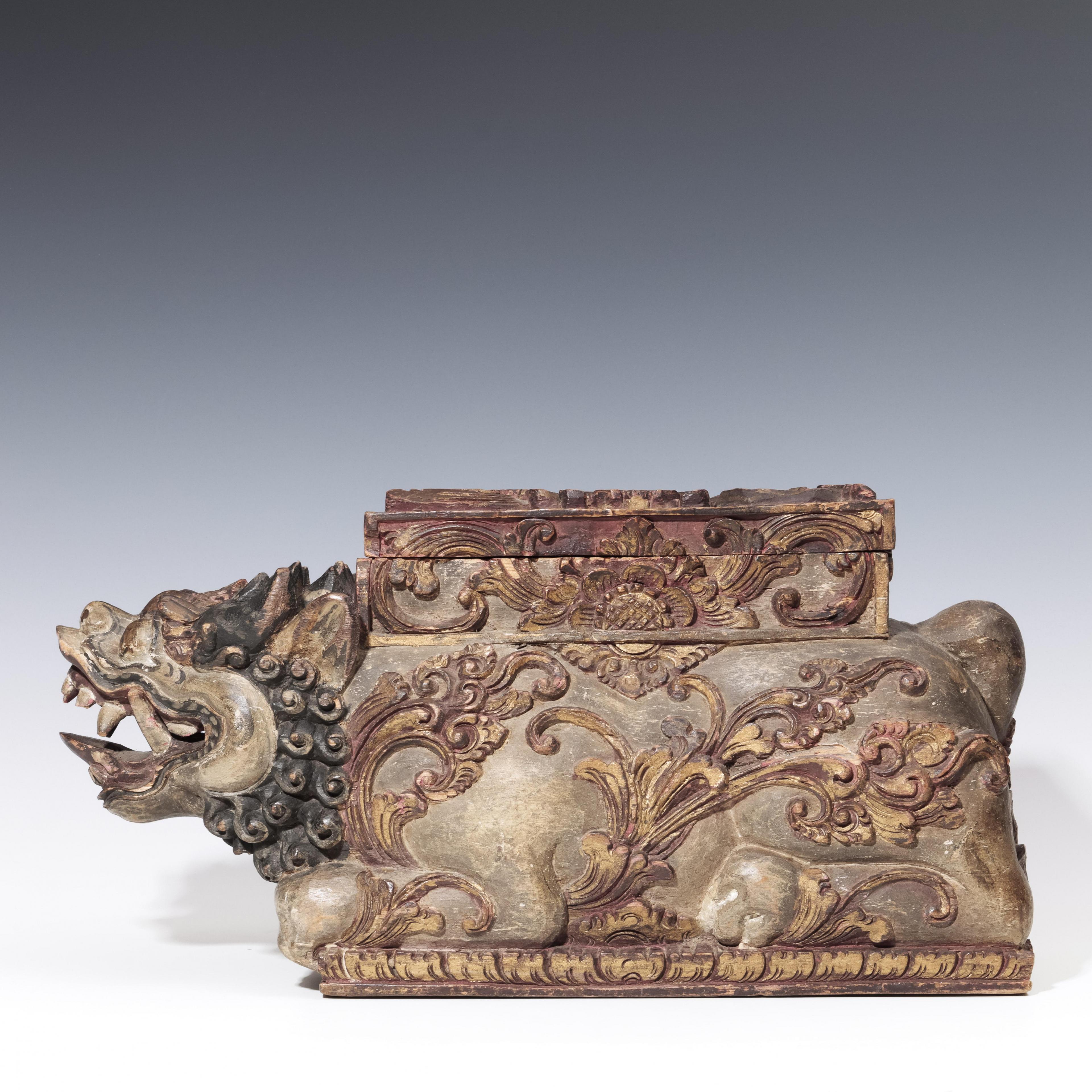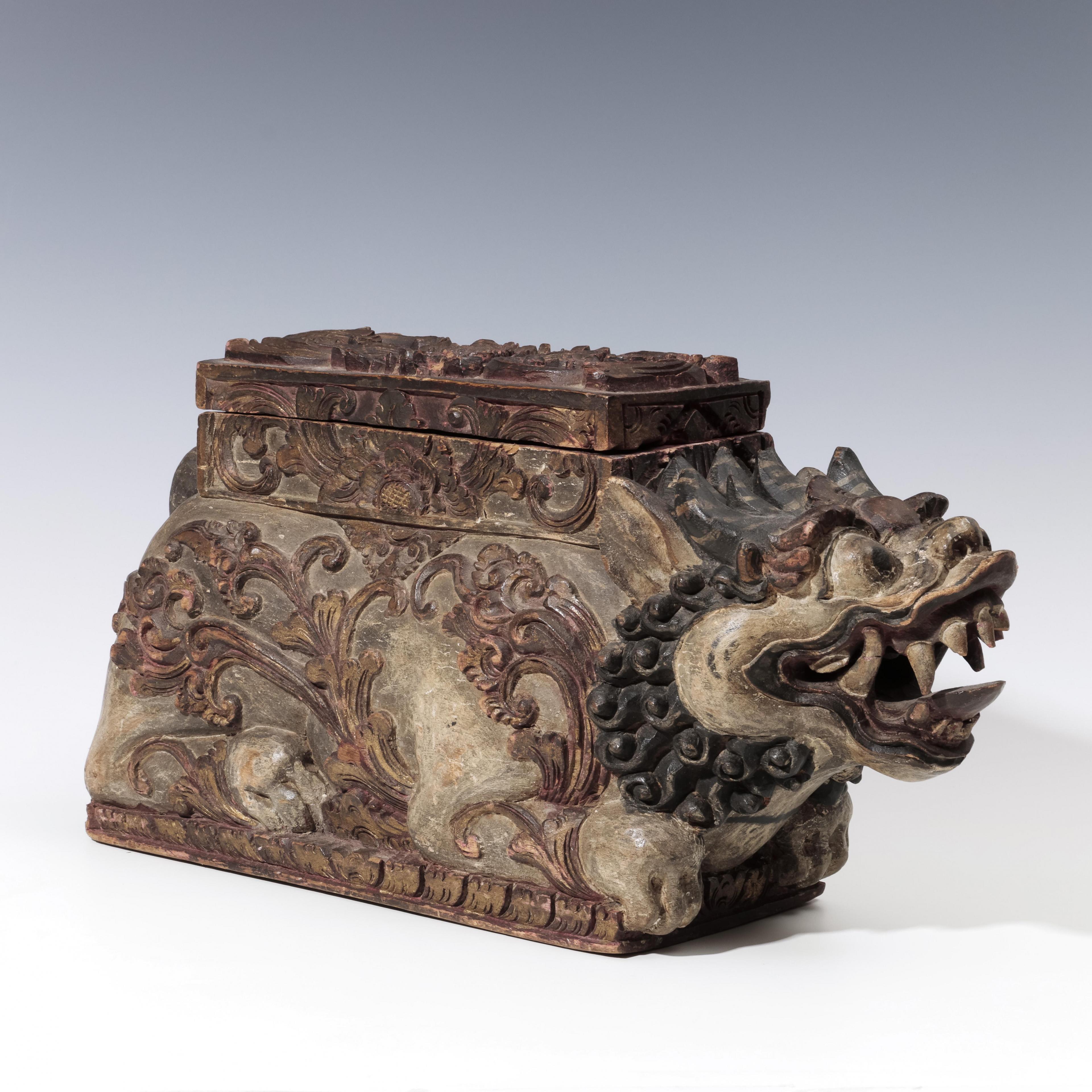 shaped as a barong figure, the top of the box decorated with floral patterns. With polychrome- and gold paint.