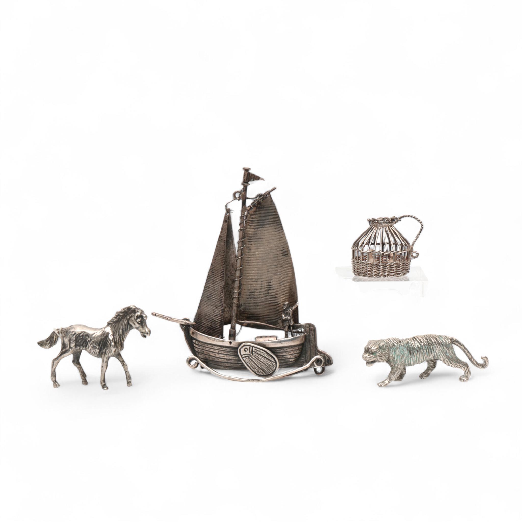 Miniatuur van zeilschip, vogelkooi en twee dierfiguren, 20e eeuw,