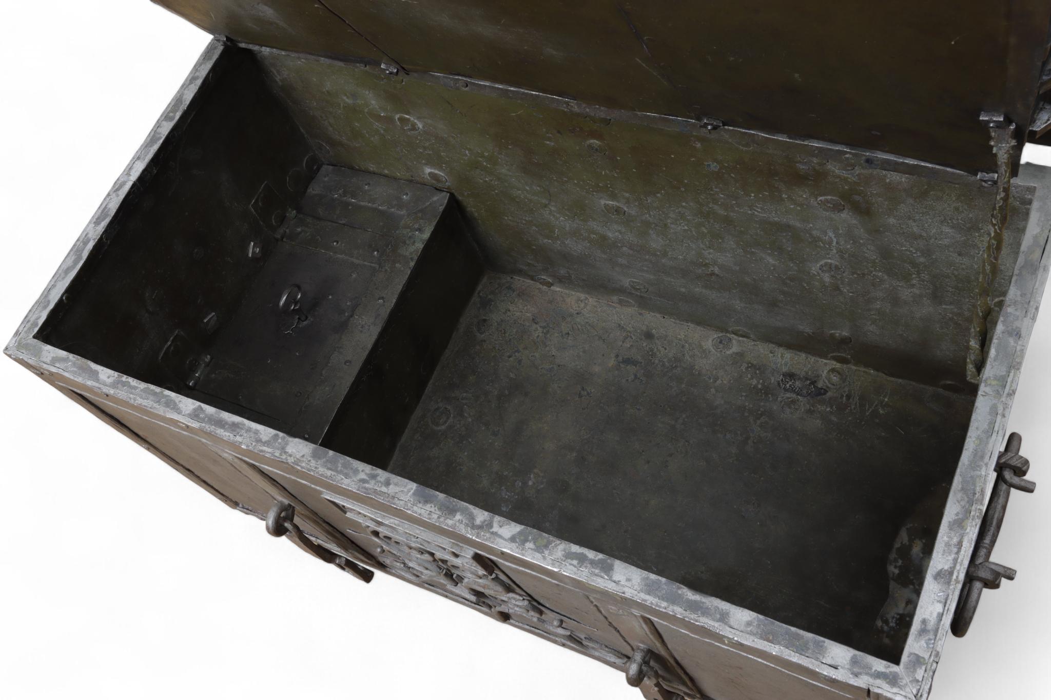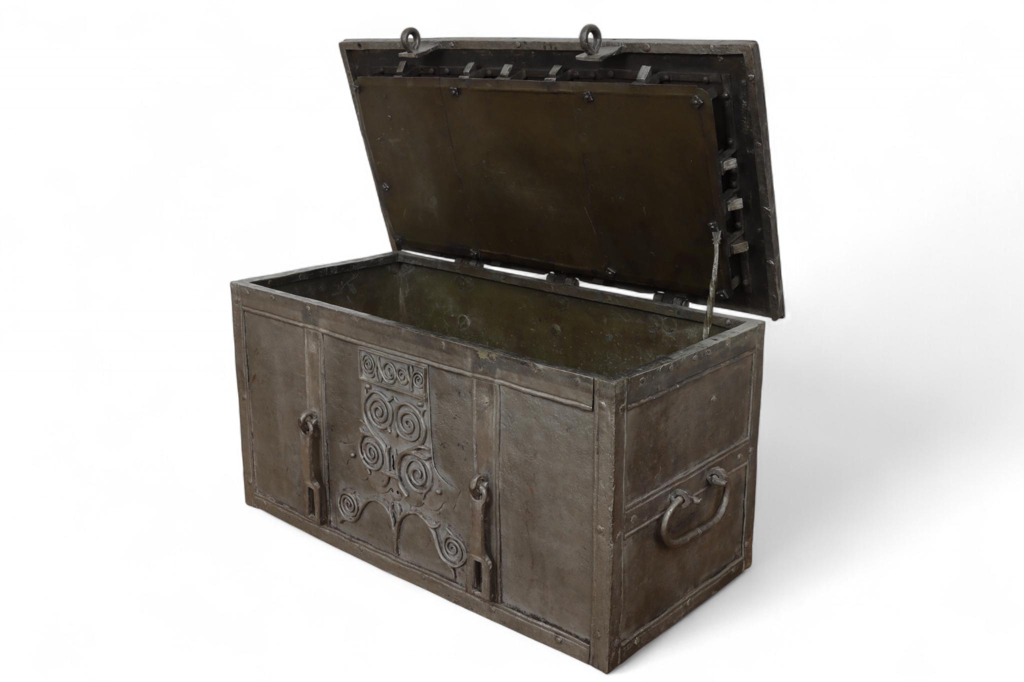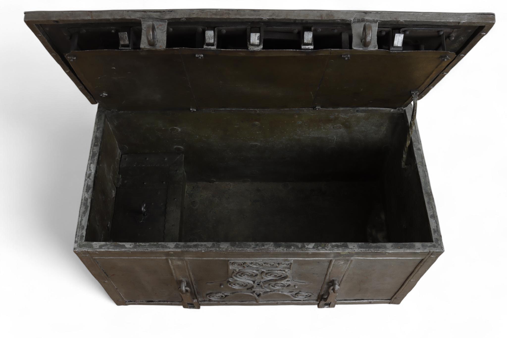 Uitgevoerd met ijzeren banden en stervormige nagels. Het slot op de deksel met geheim entree. Interieur met opengewerkt slot, elf schoten. Afsluitbaar compartiment. Twee handvaten. Compleet met sleutel en entreeopener.