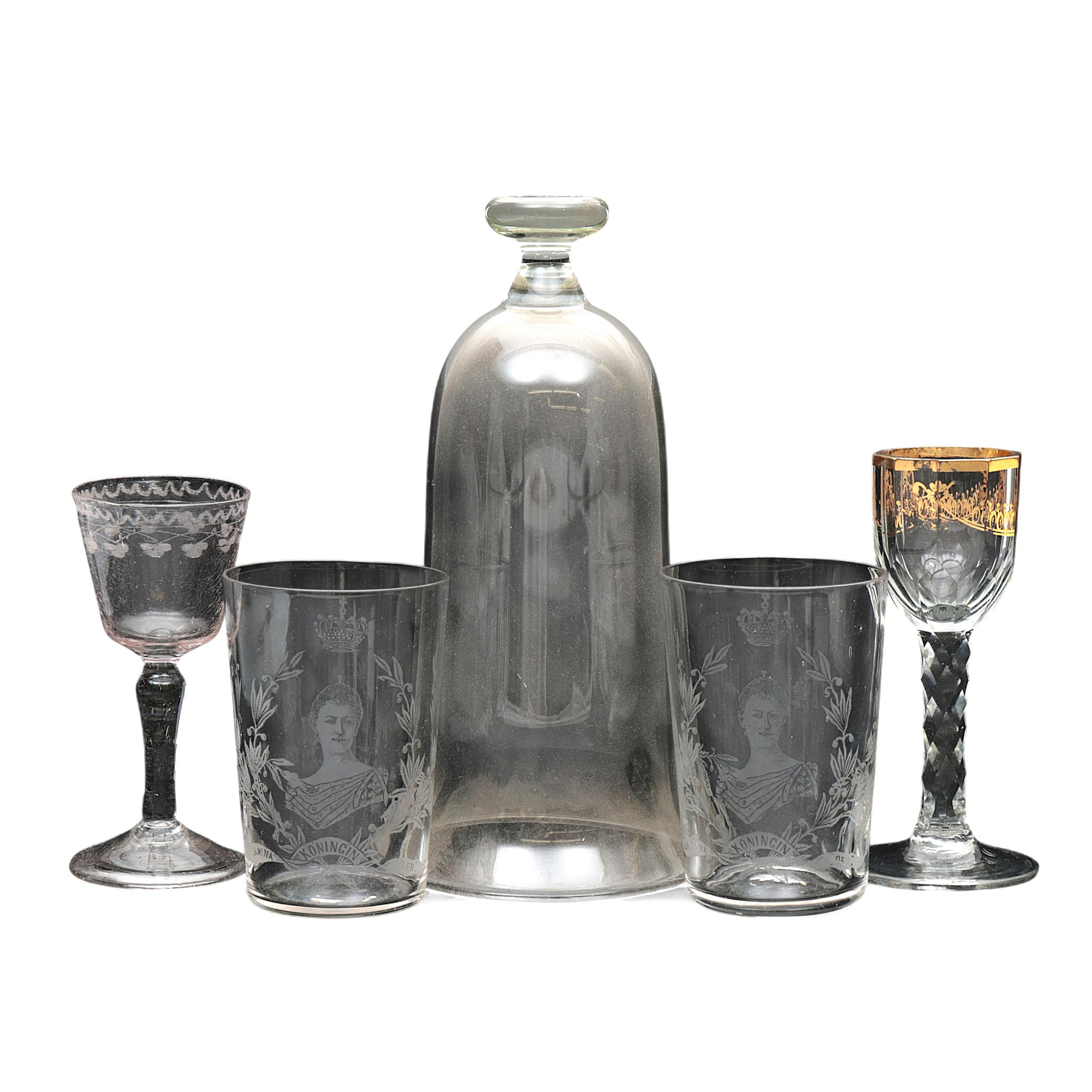 w.o. likeurglas met rad gegraveerde decoratie op de kelk en twee glazen bekers met beeltenis van Wilhelmina. Hierbij glazen vonkenvanger.