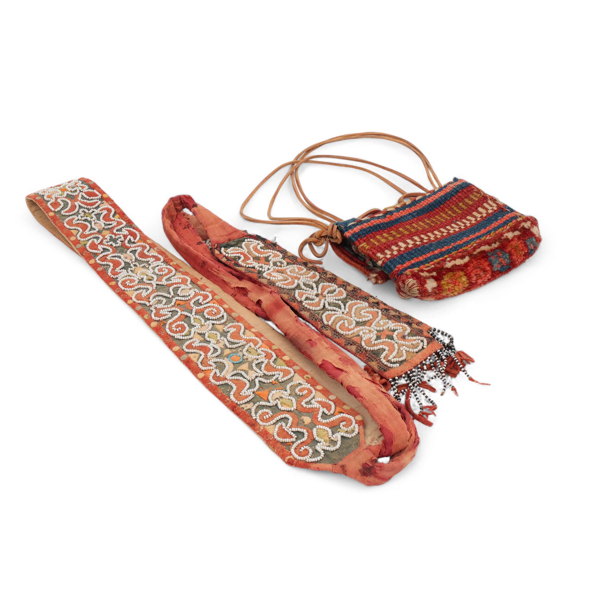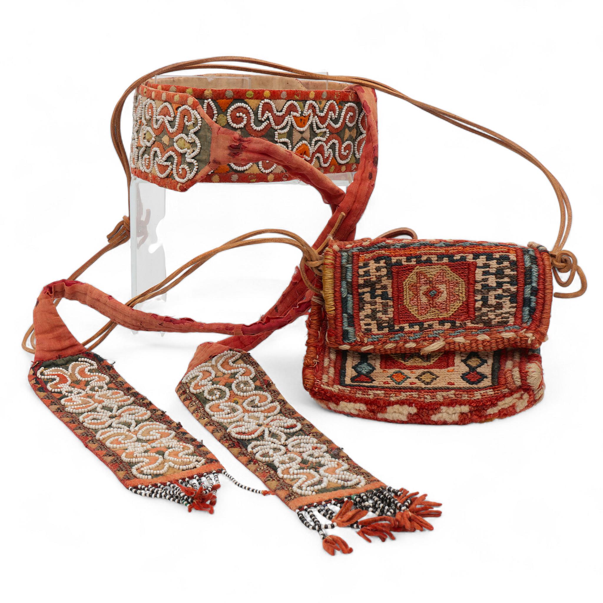 Indonesia, a textile panel-cord decorated with various forms in colloured textile and white beaded lining.