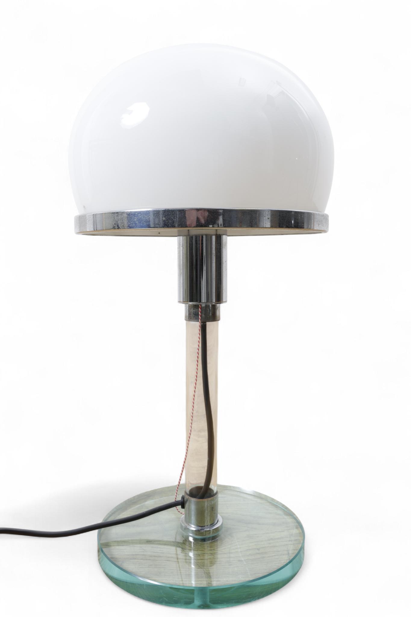 met melkglazen kap, op ronde glazen voet. Naar 'WG 24' lamp van Wilhelm Wagenfeld, Bauhaus