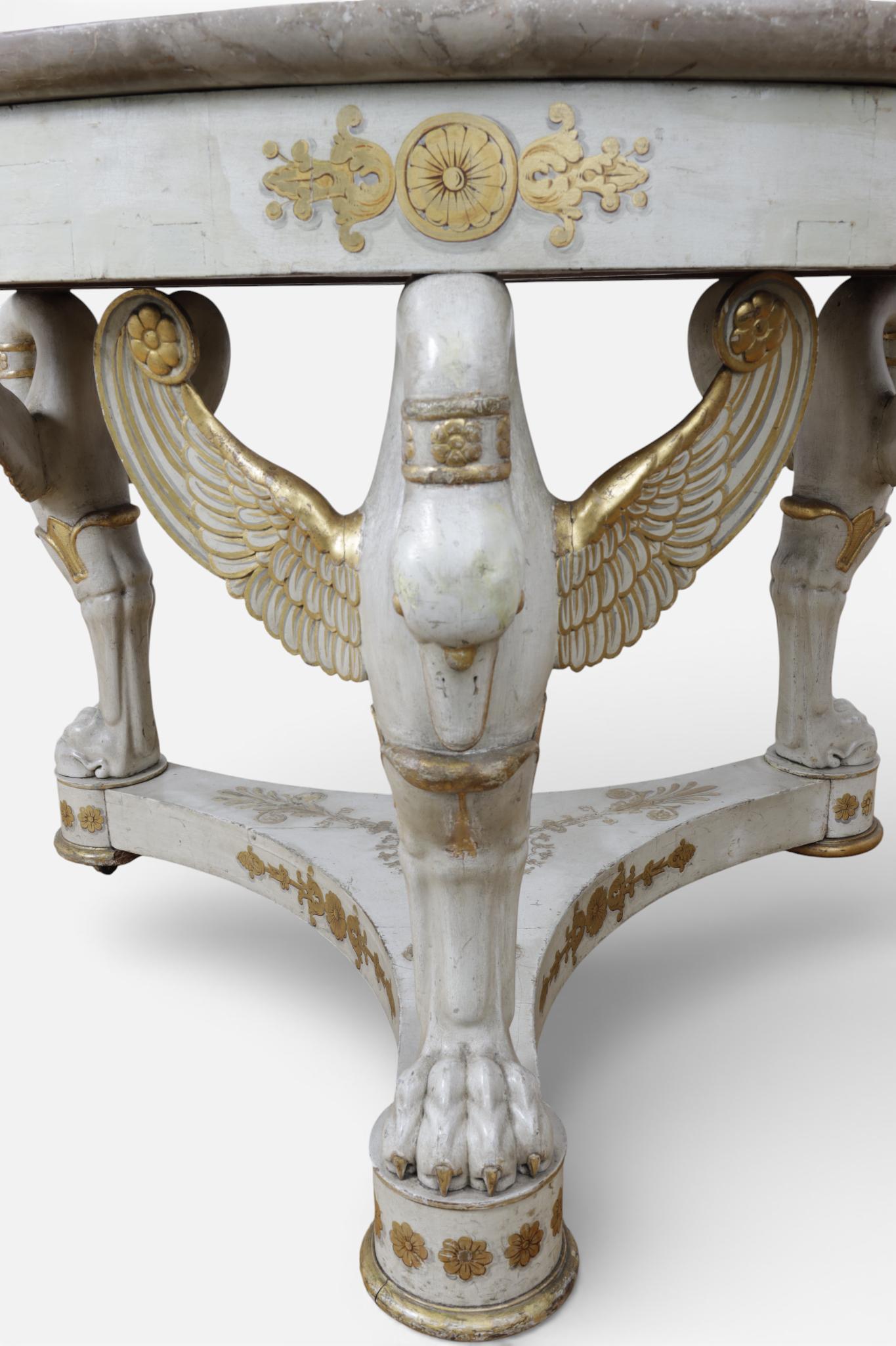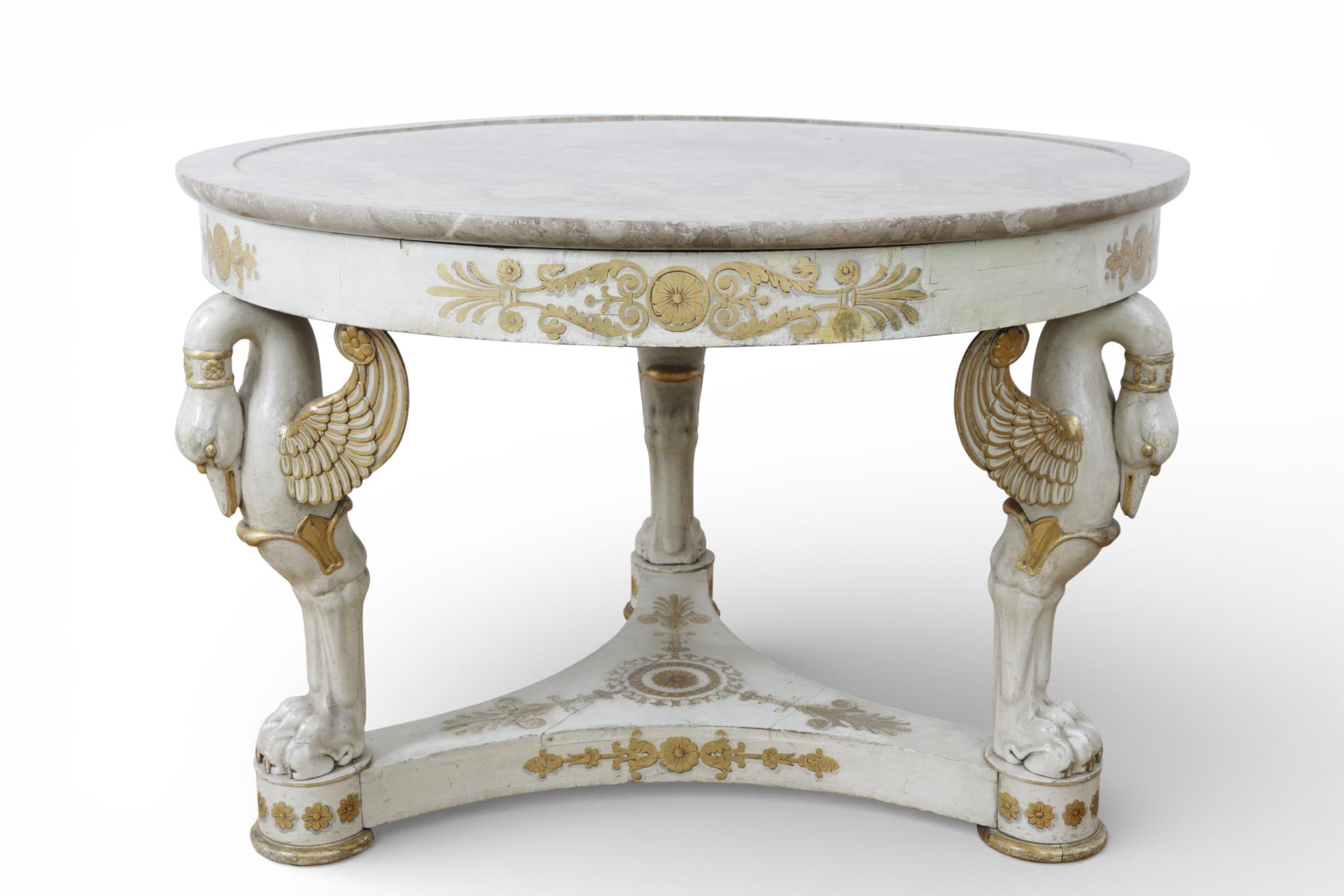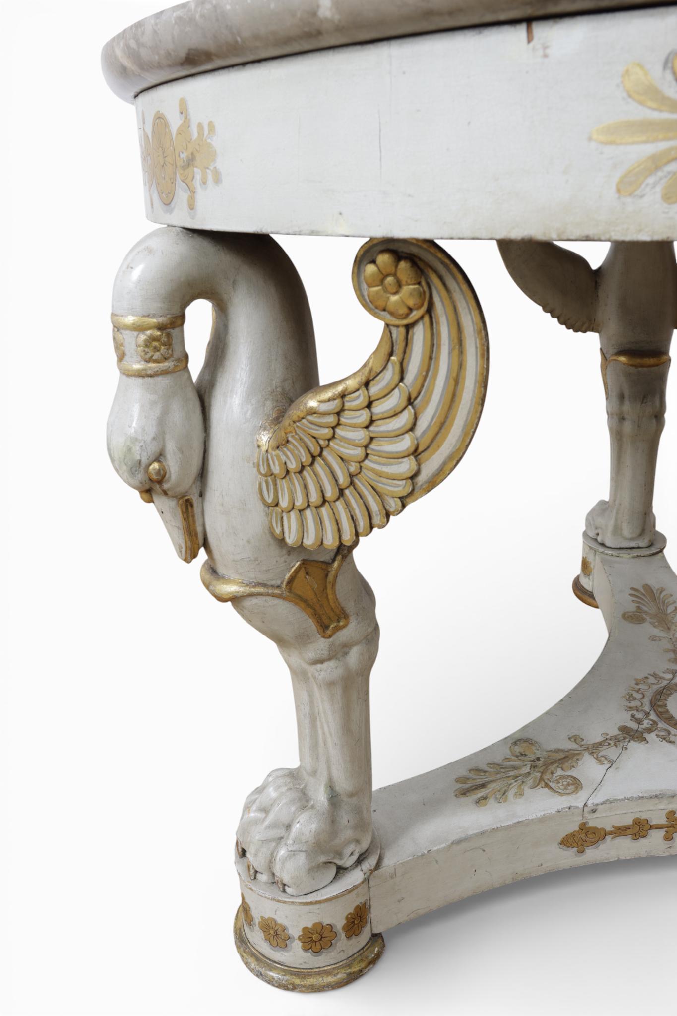 met marmeren blad. Op drie gebogen poten met gestoken zwanen en -klauwpoten. Op messing zwenkwieltjes. Hierbij drie wit en verguld laqué beukenhouten stoelen, Empire, met blauwe velours stoffering
