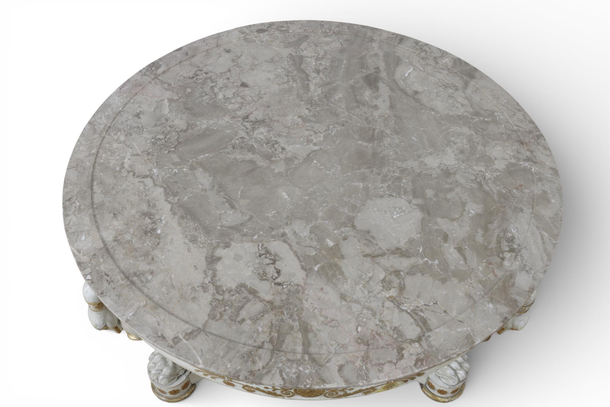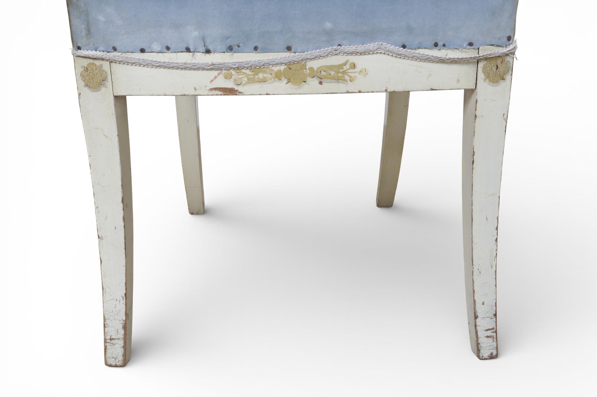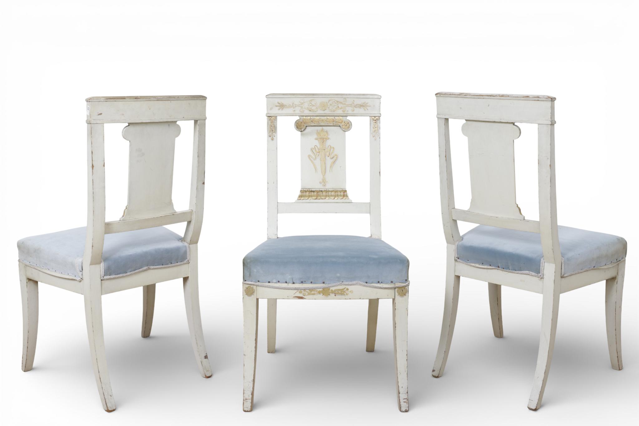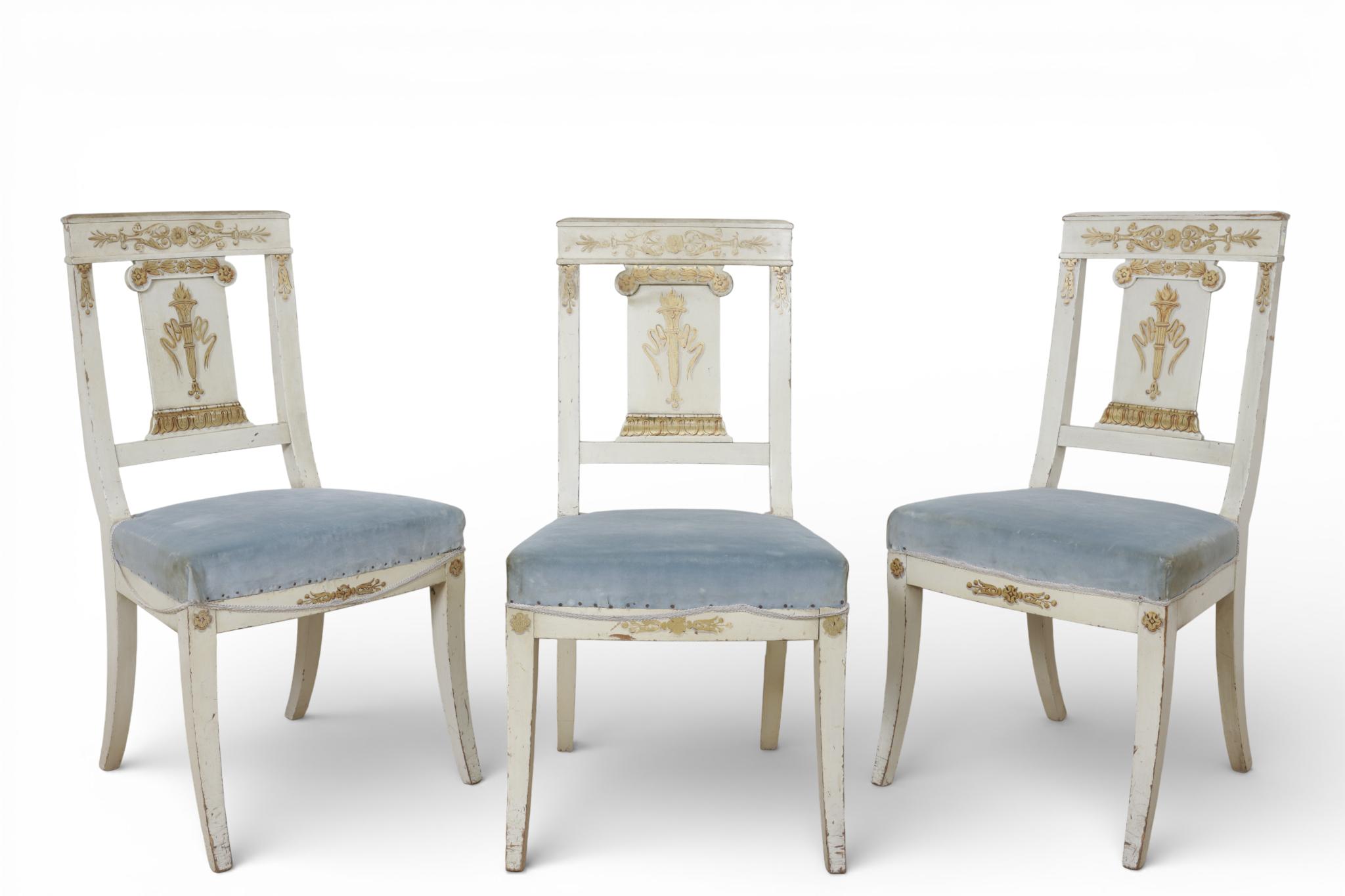 met marmeren blad. Op drie gebogen poten met gestoken zwanen en -klauwpoten. Op messing zwenkwieltjes. Hierbij drie wit en verguld laqué beukenhouten stoelen, Empire, met blauwe velours stoffering
