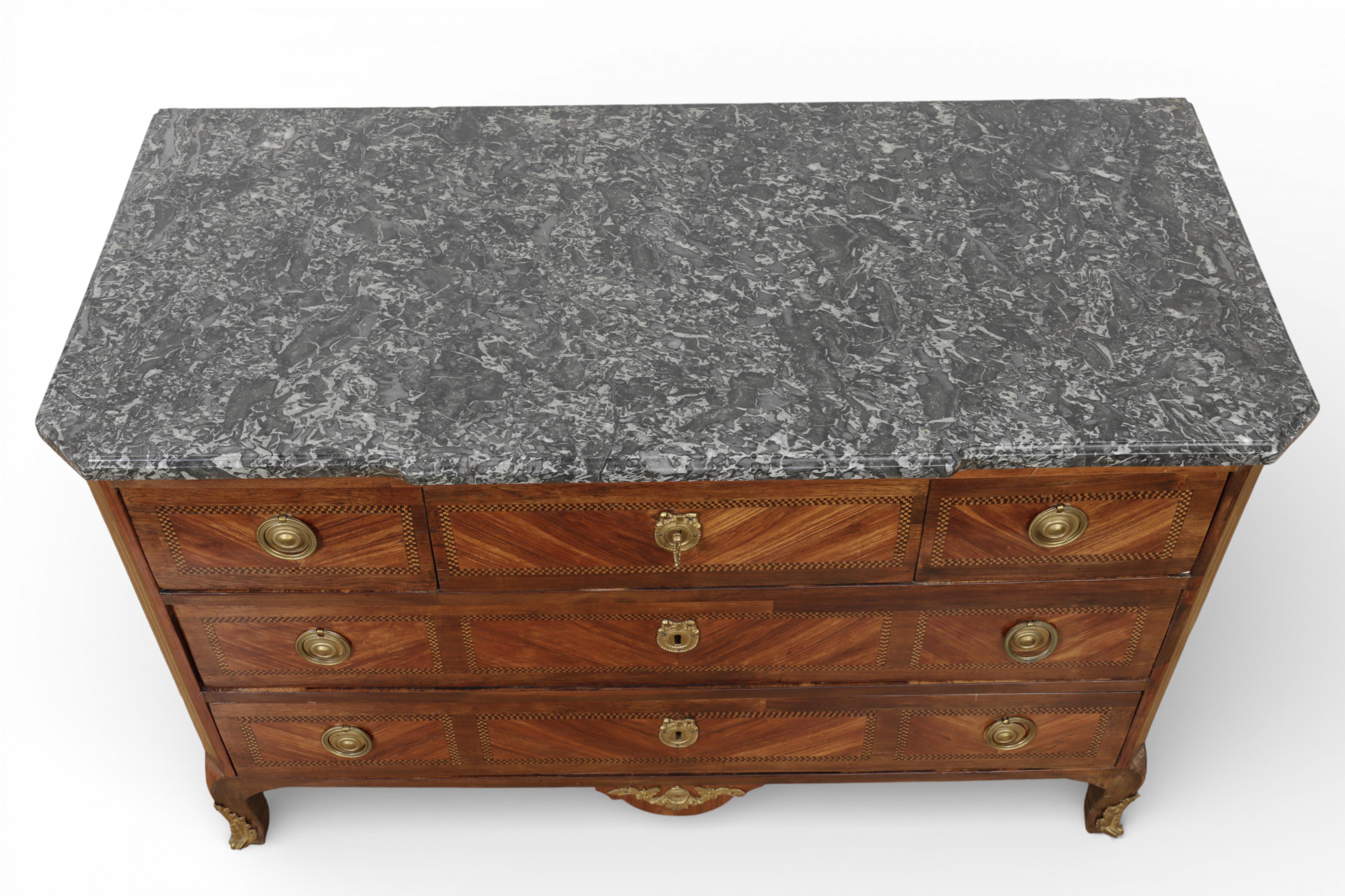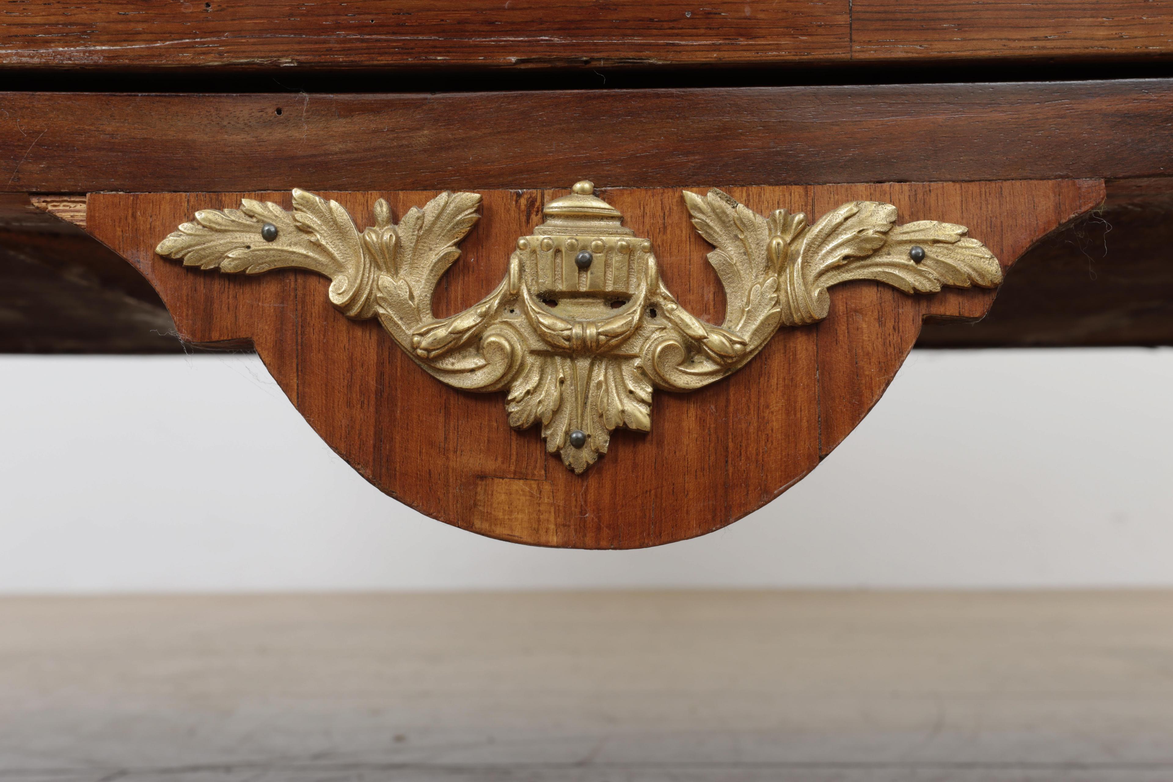 met grijs marmeren blad en vijf laden. Het geheel versierd met verguld bronzen ornamenten en bieswerk