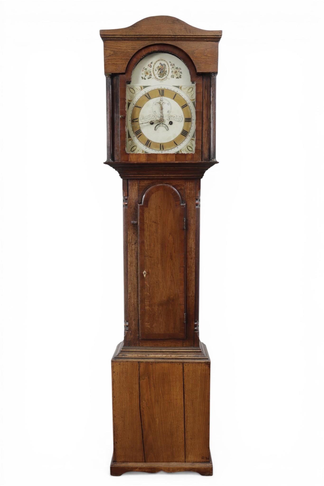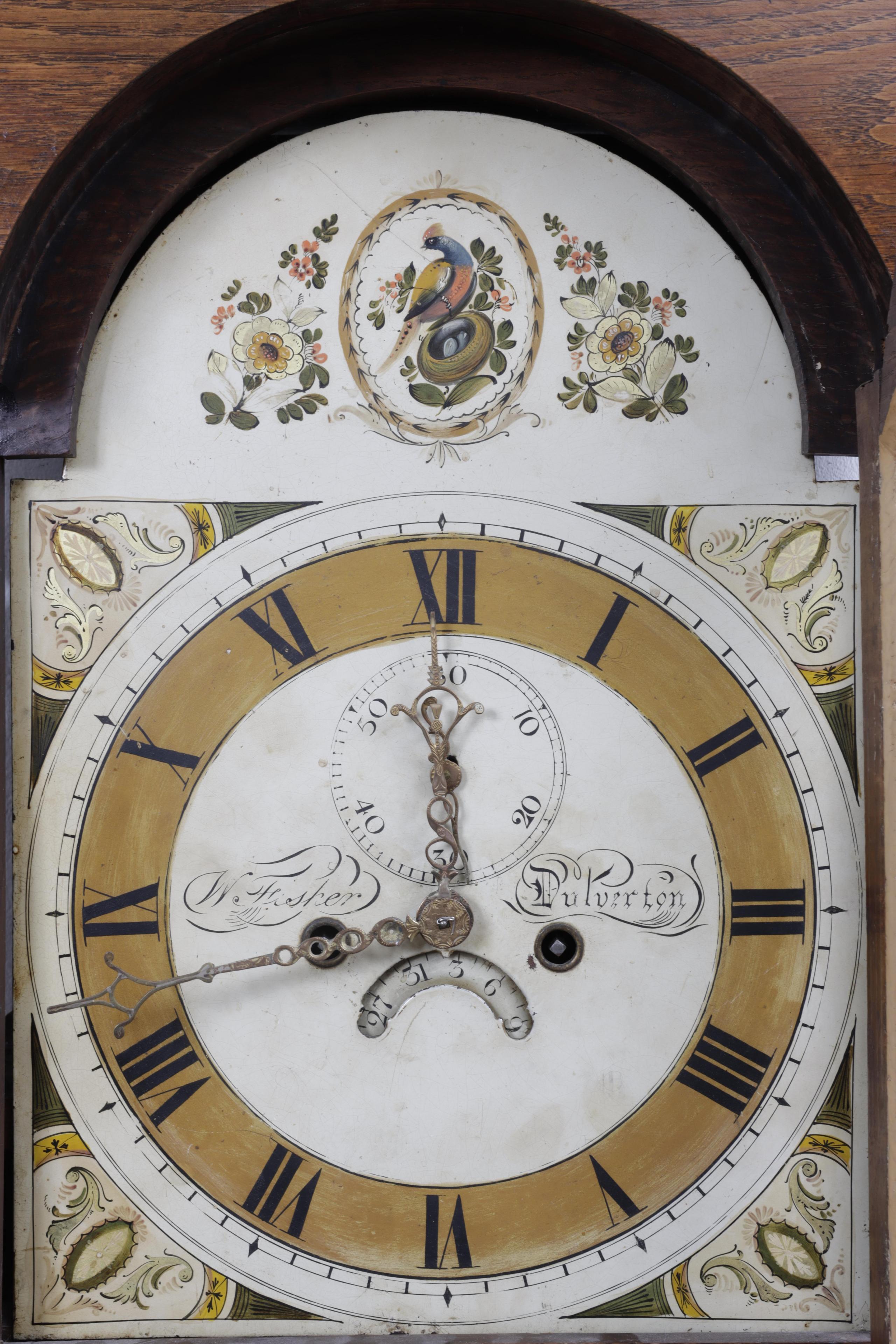 met beschilderde wijzerplaat en aanwijzing van uren, minuten, seconden en datum. In eikenhouten kast. Compleet met slinger en twee gewichten (wijzer los)