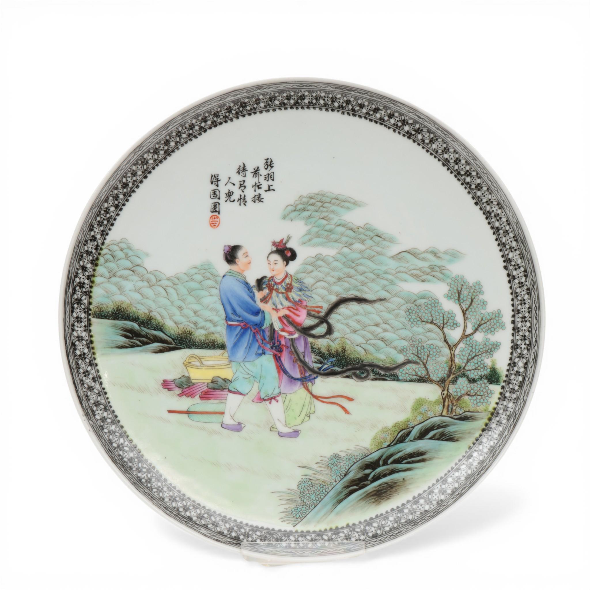 painted with a dancing couple, with seal and calligraphy, the base with stamped mark