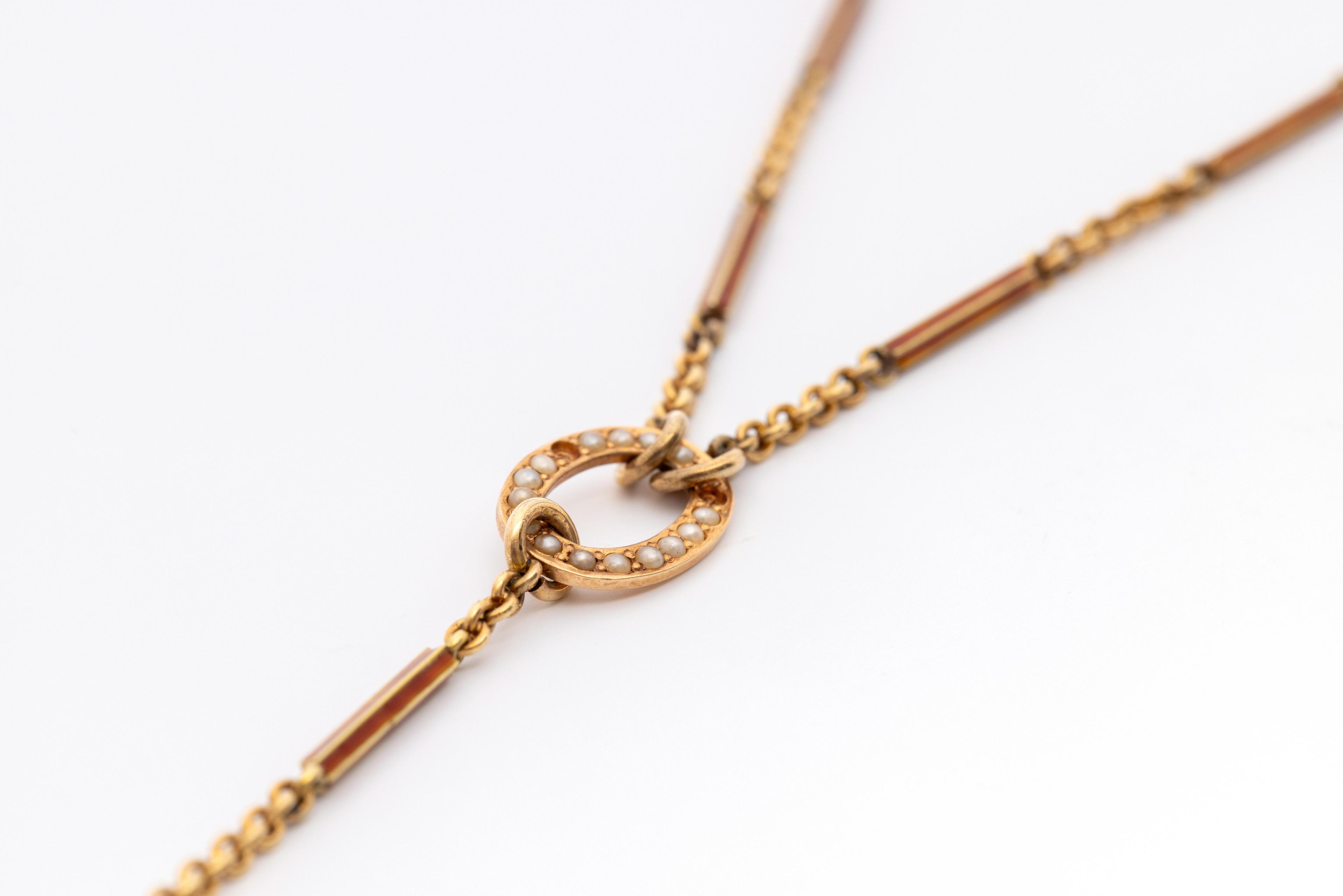 Made up of alternating red enameled bars and cable links terminating in an oval set with split pearls