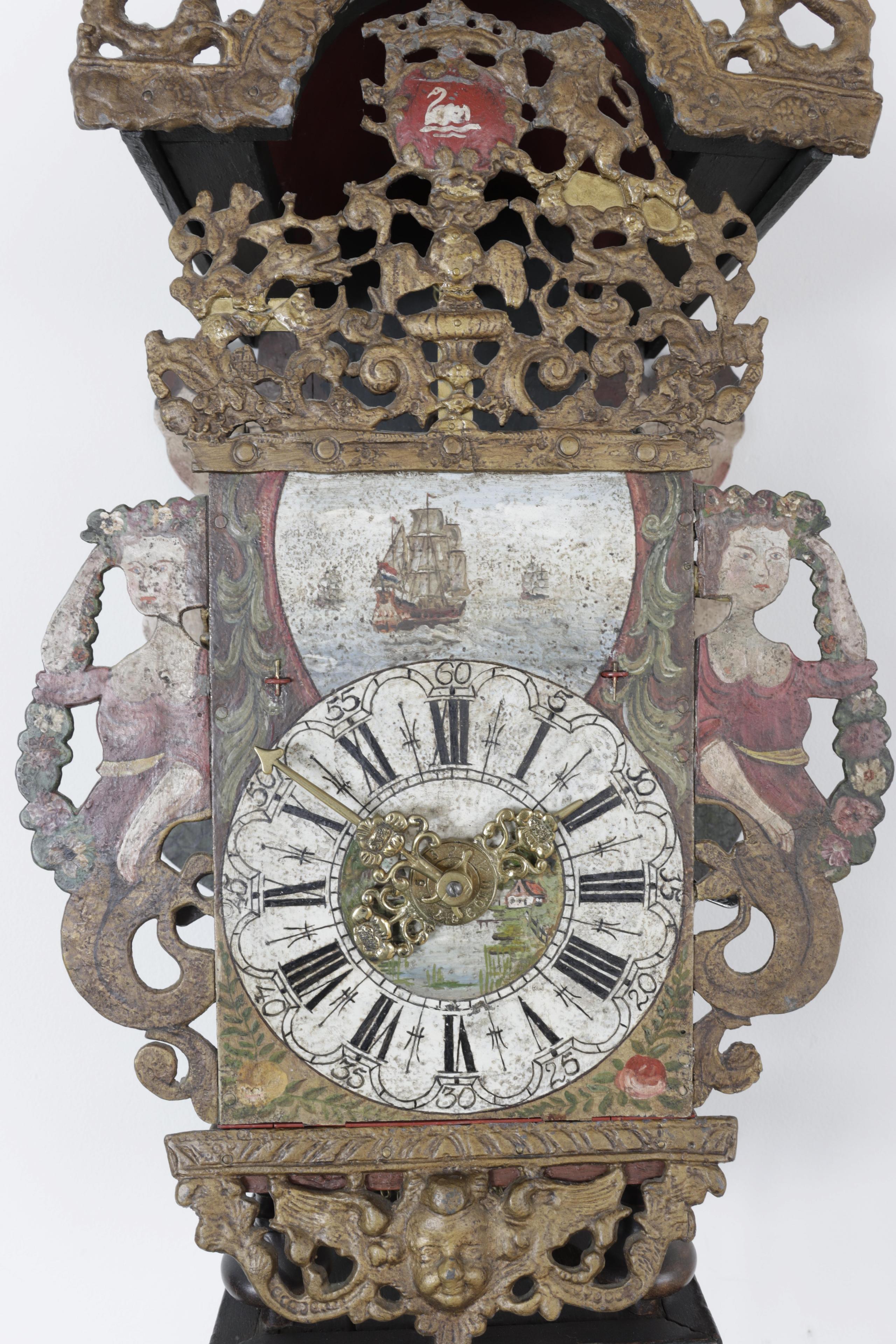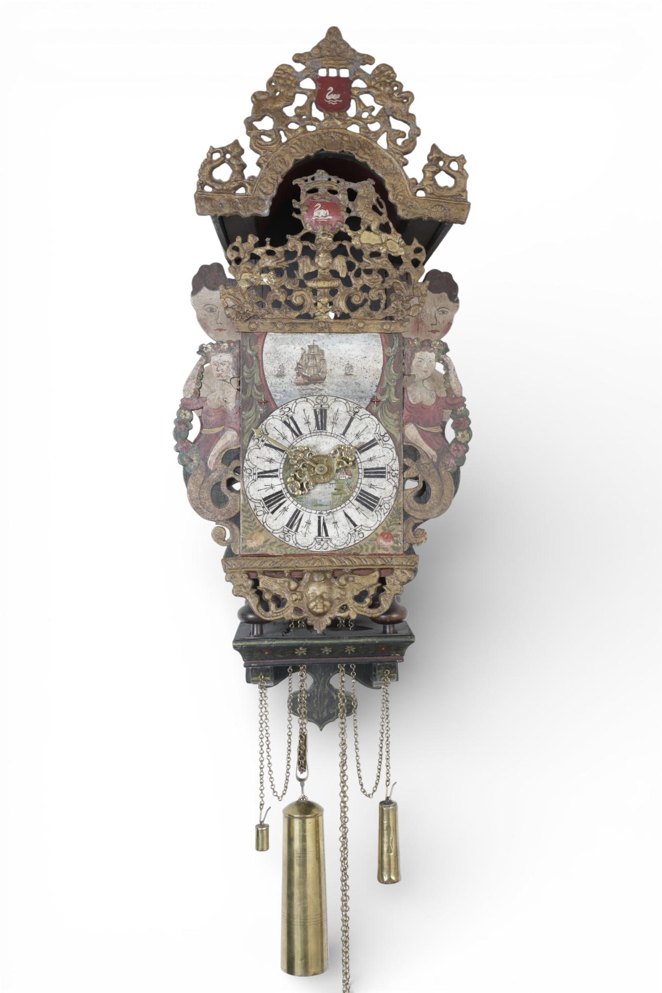 met beschilderde wijzerplaat, verguld loden ornamenten en zeemeerminnen. Met aanduiding van uren, minuten en wekker en drie koperen gewichten (kleinste niet origineel). Geen slinger