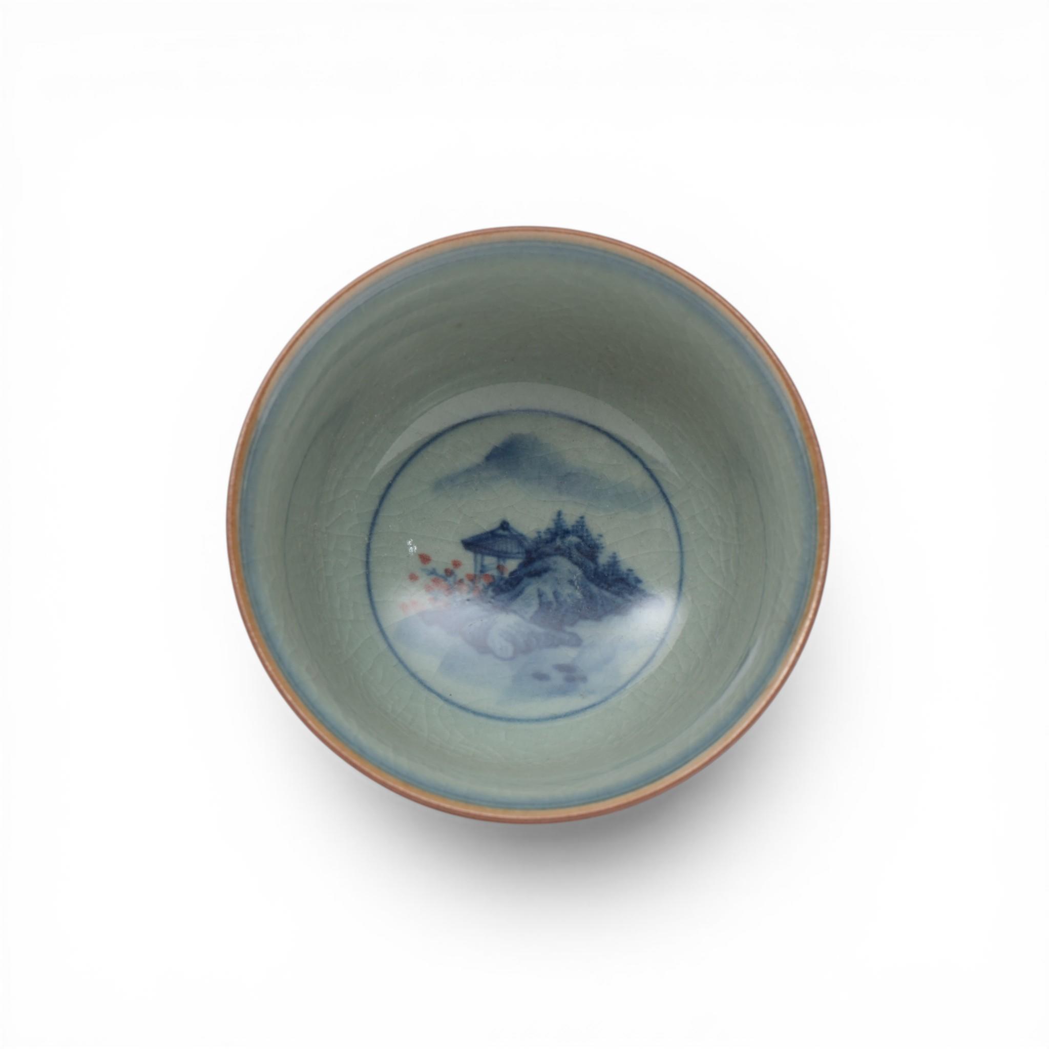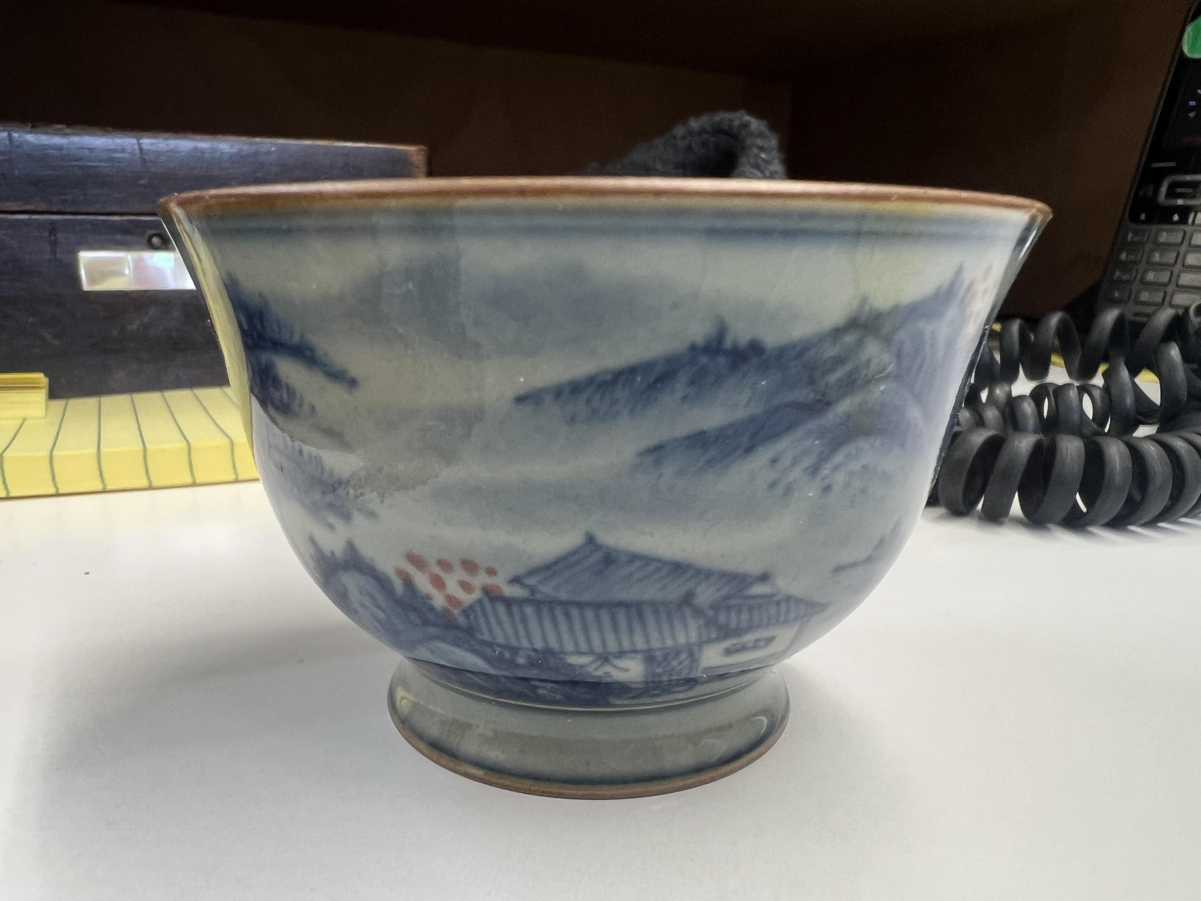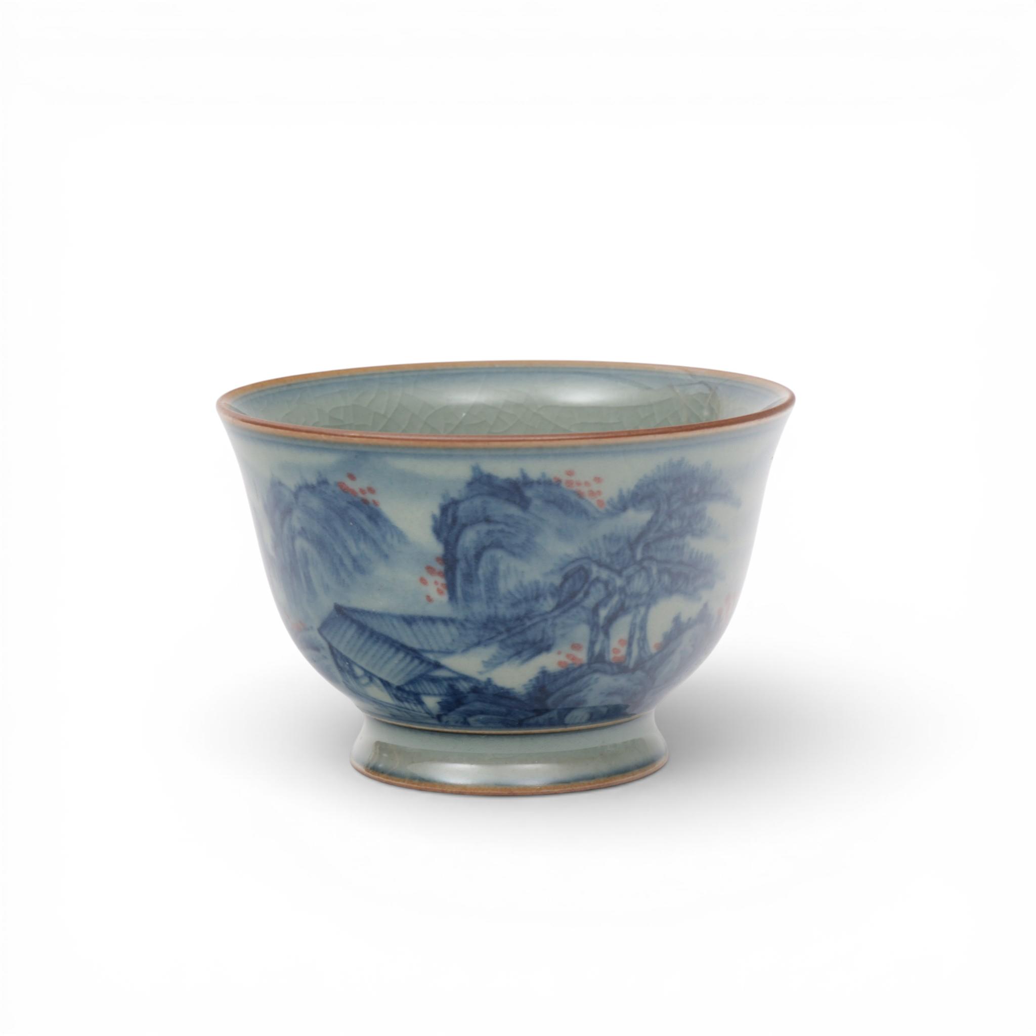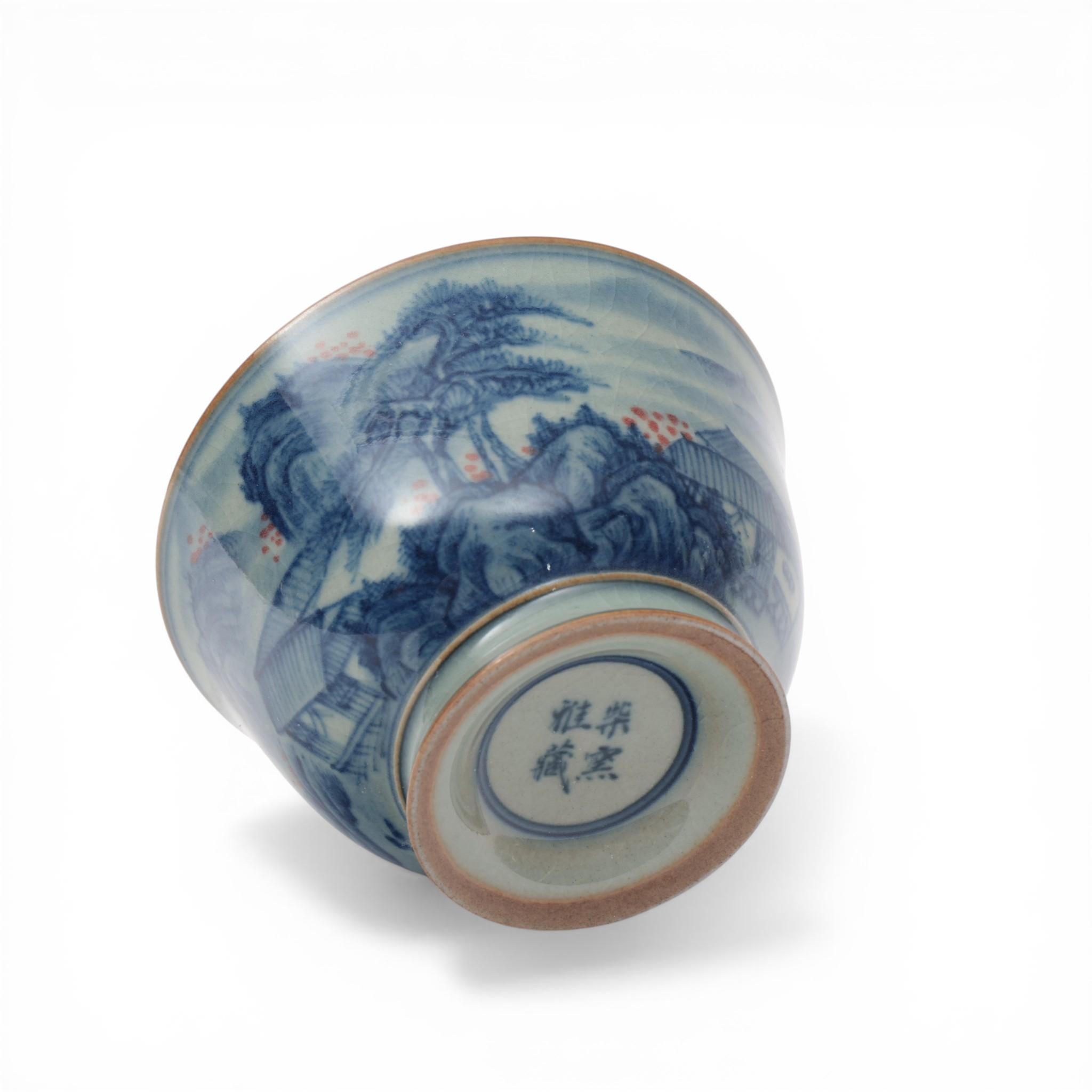 decorated with pavilions in a mountainous landscape on a greyish-blue ground, the base with an apocryphal Kangxi mark
