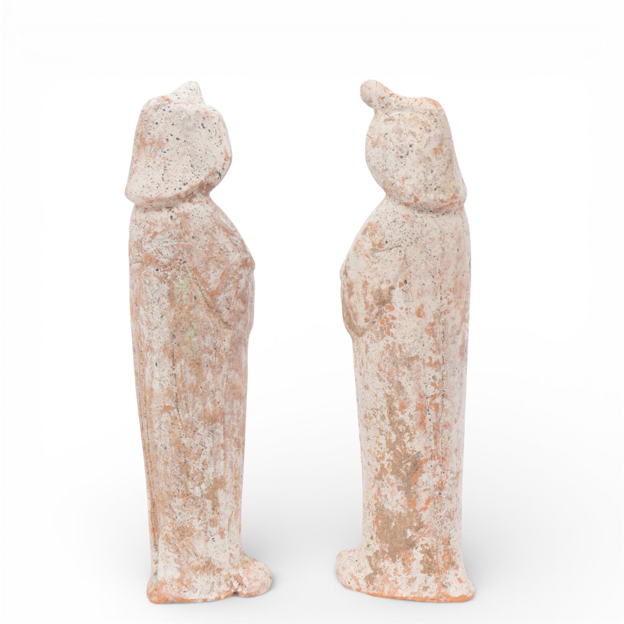 each modelled standing with their hands clasped in front of their chest and wearing long robes and headdress, with traces of pigments (wear and small losses as expected)