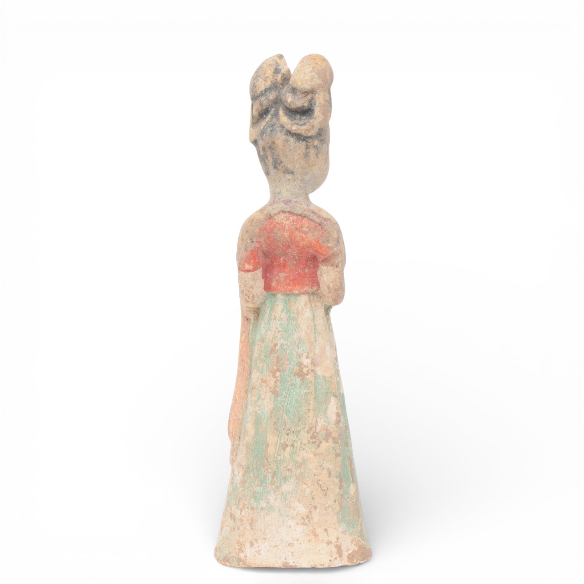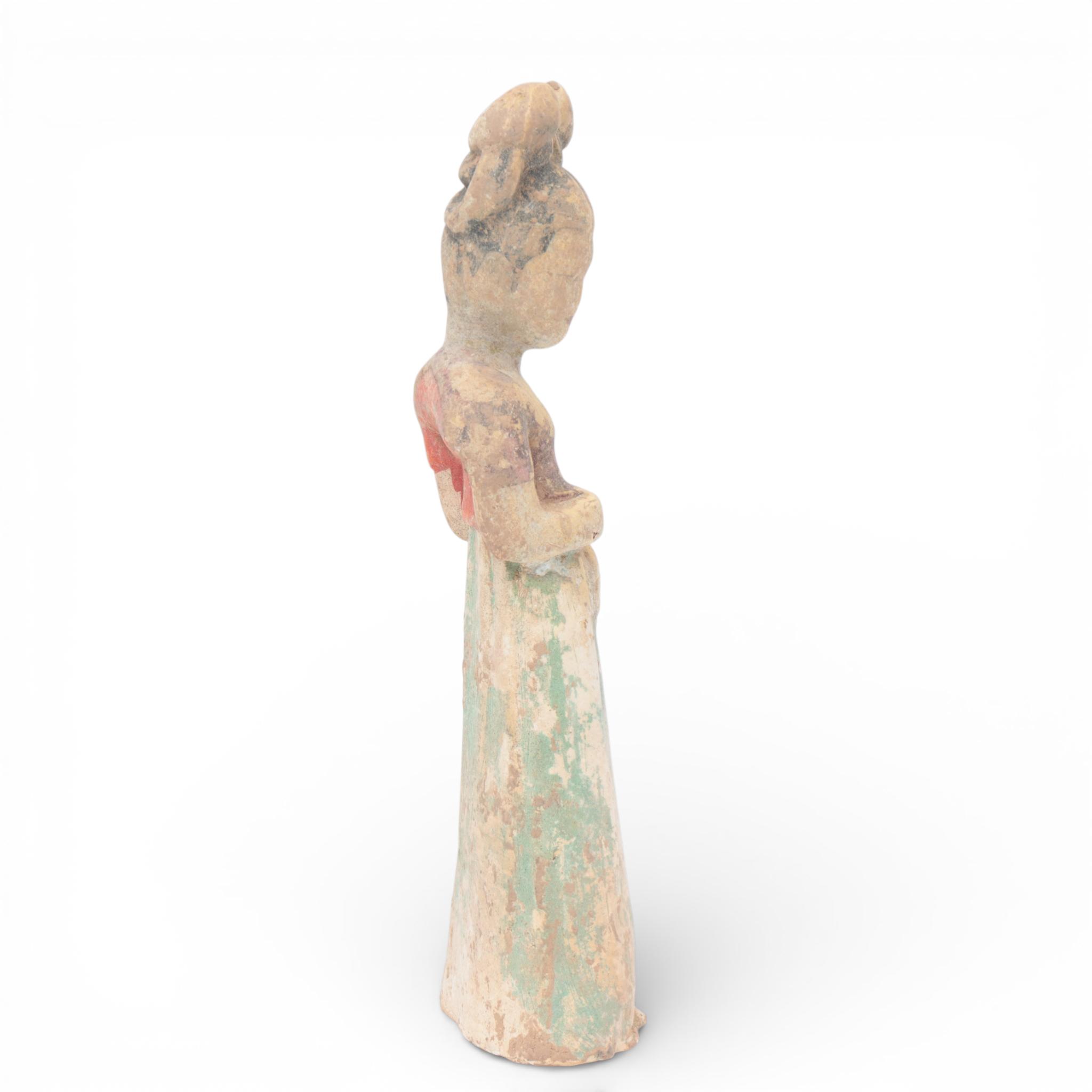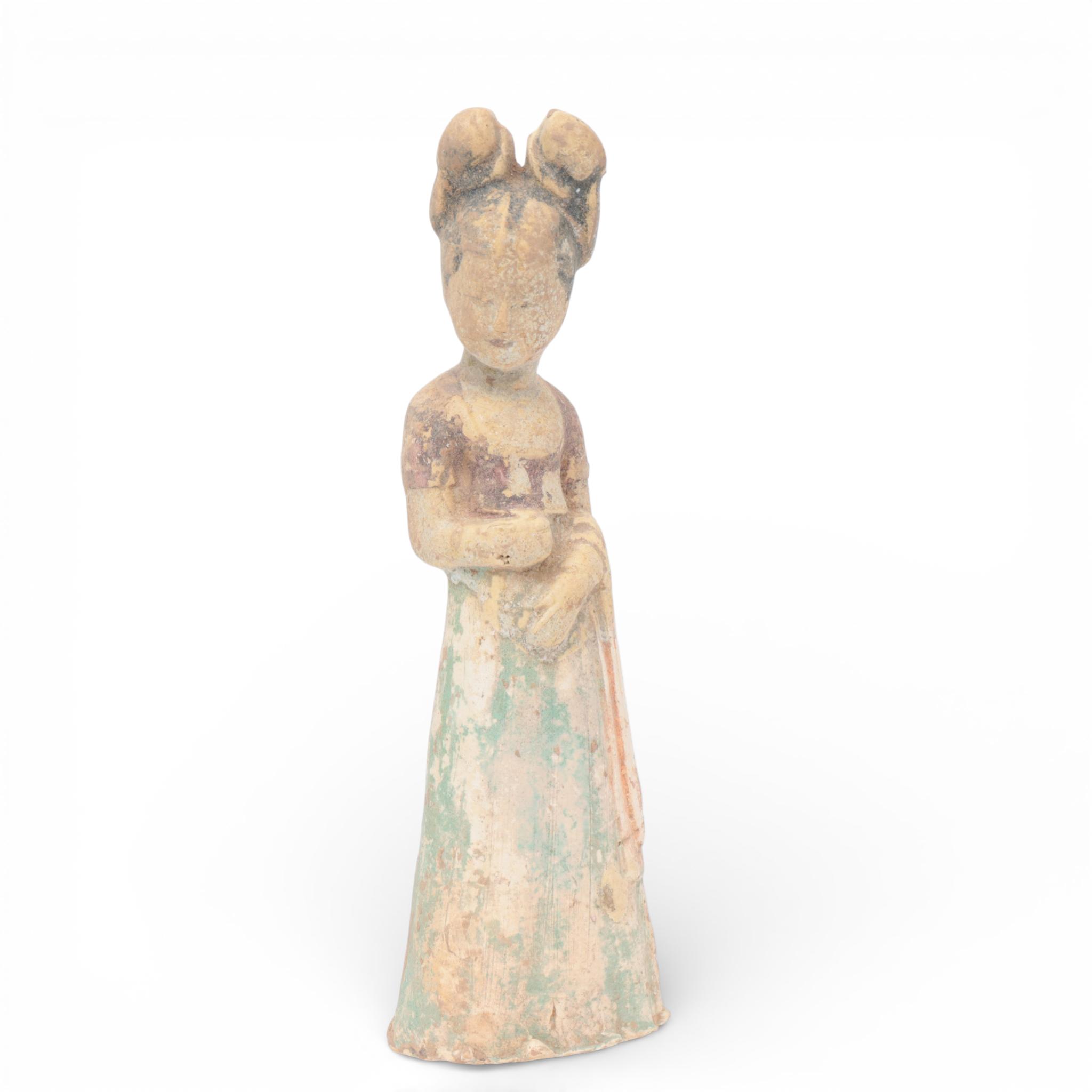 modelled in standing position wearing wide dress and high topknots, with traces of green, aubergine, red and black pigments (some wear as expected)