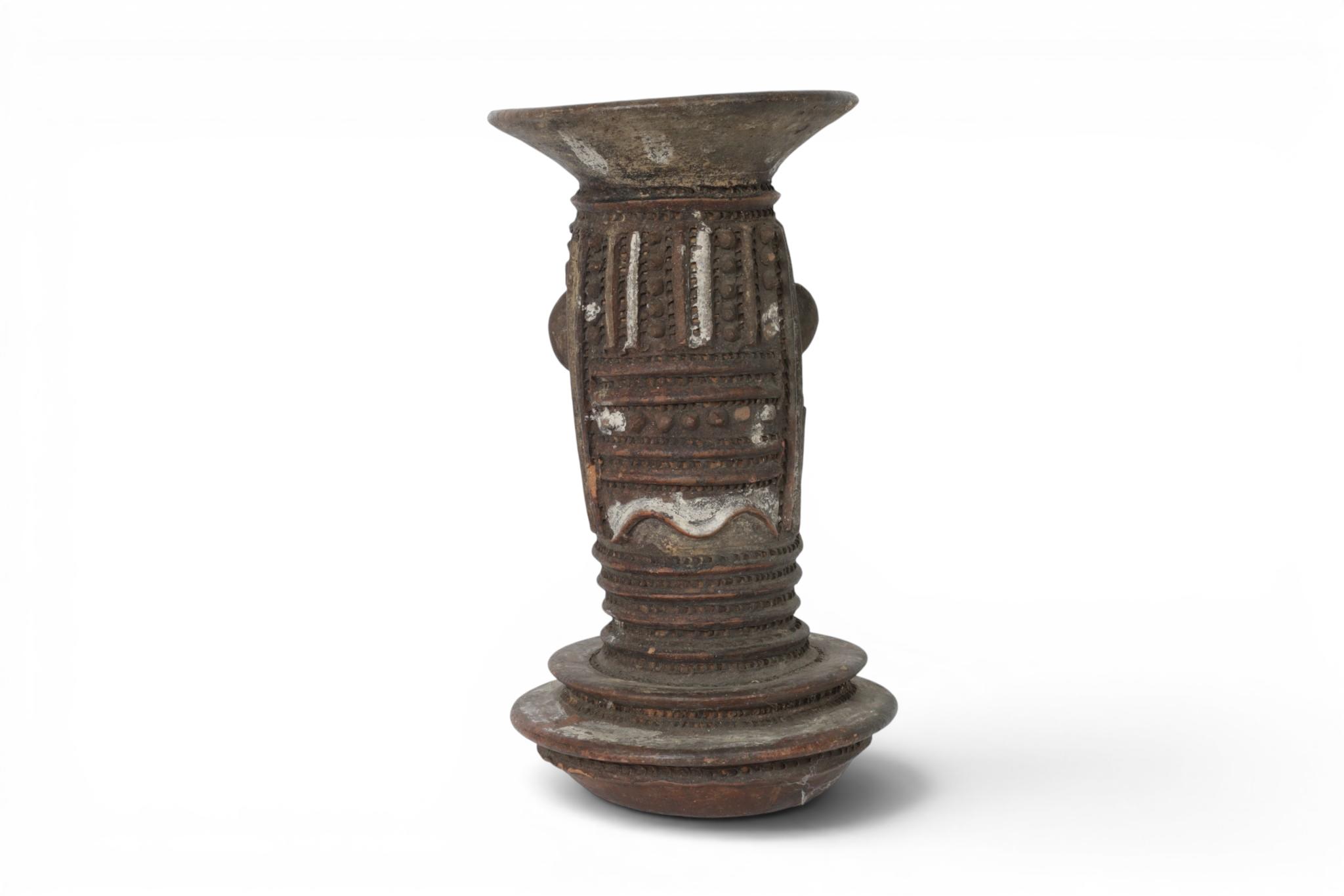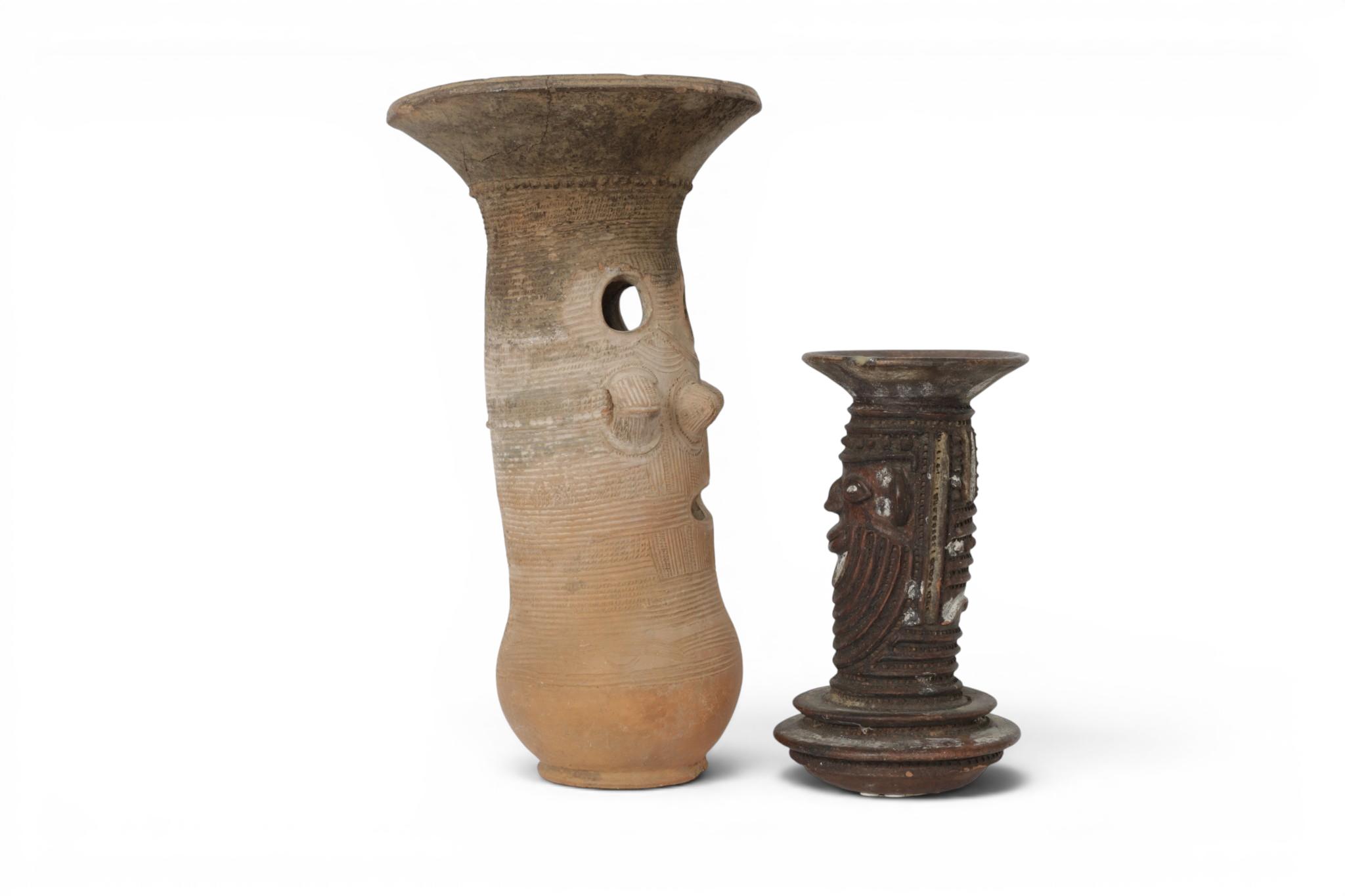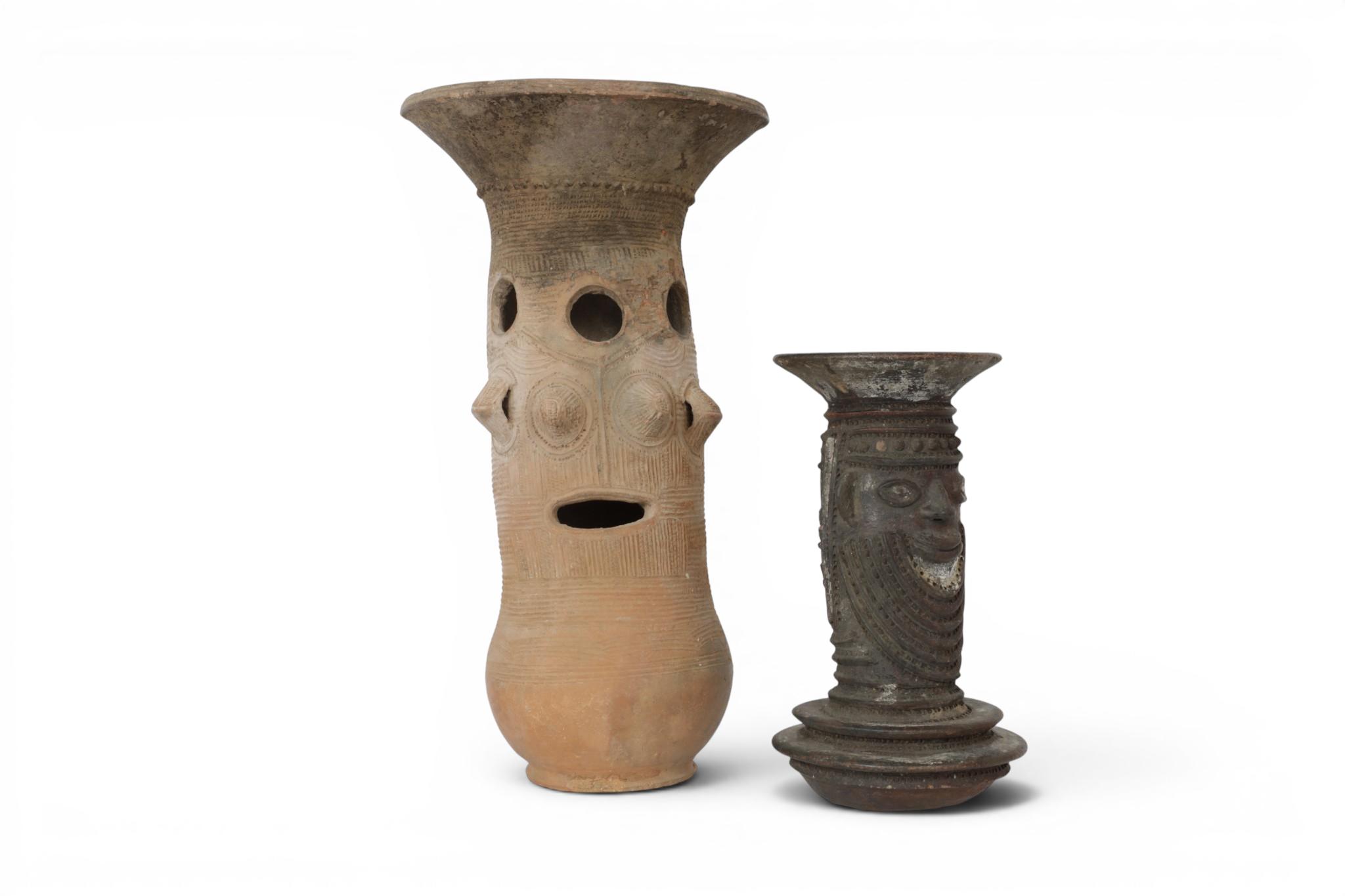 Nigeria, Yoruba, a teracotta face pot and Nupe, a large teracotta ceremonial jar. (restored)