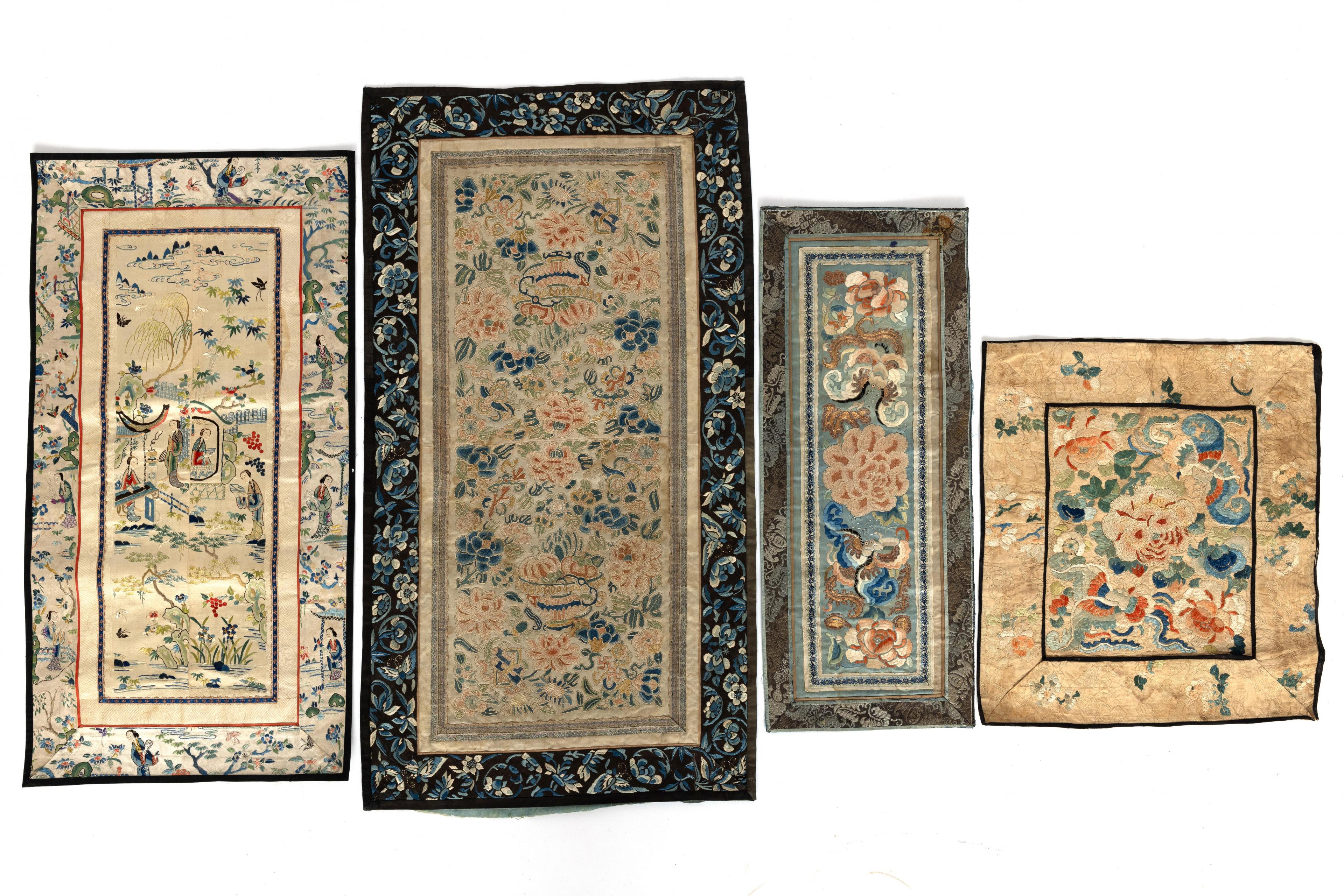 two variously embroidered with flowers and bats, one with flowers and one with figures (some wear and as expected)