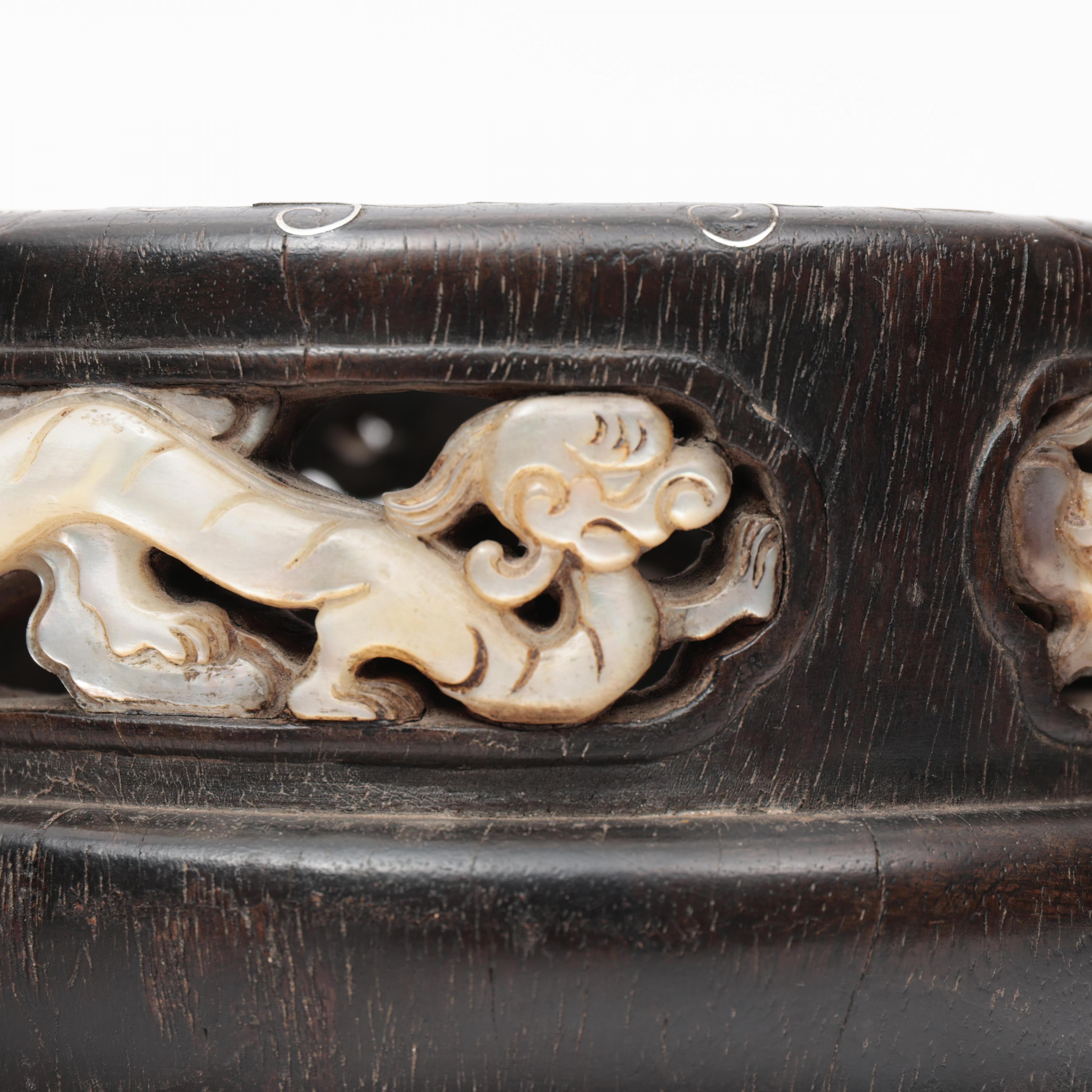 of oval shape and the upper part inlaid with four mother-of-pearl dragon panels, the upper rim inlaid with silver wire (some damage to the interior, some cracks to the mother-of-pearl)