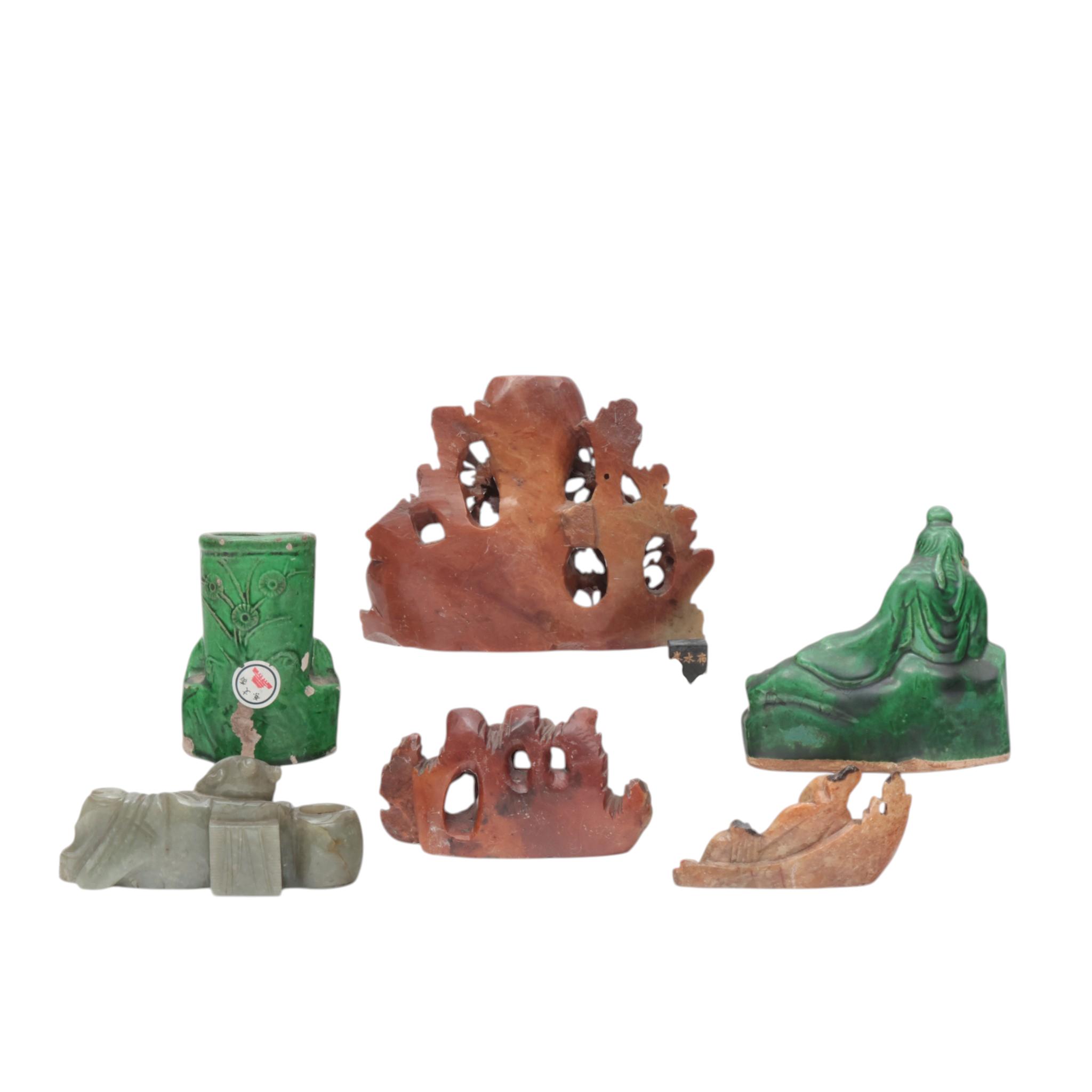 comprising a green-glazed earthenware, a nephrite jade and a soapstone water-pot each in the shape of the drunken poet Li Bai, a green-glazed earthenware pencil-holder, two soapstone vases and an ink-cake