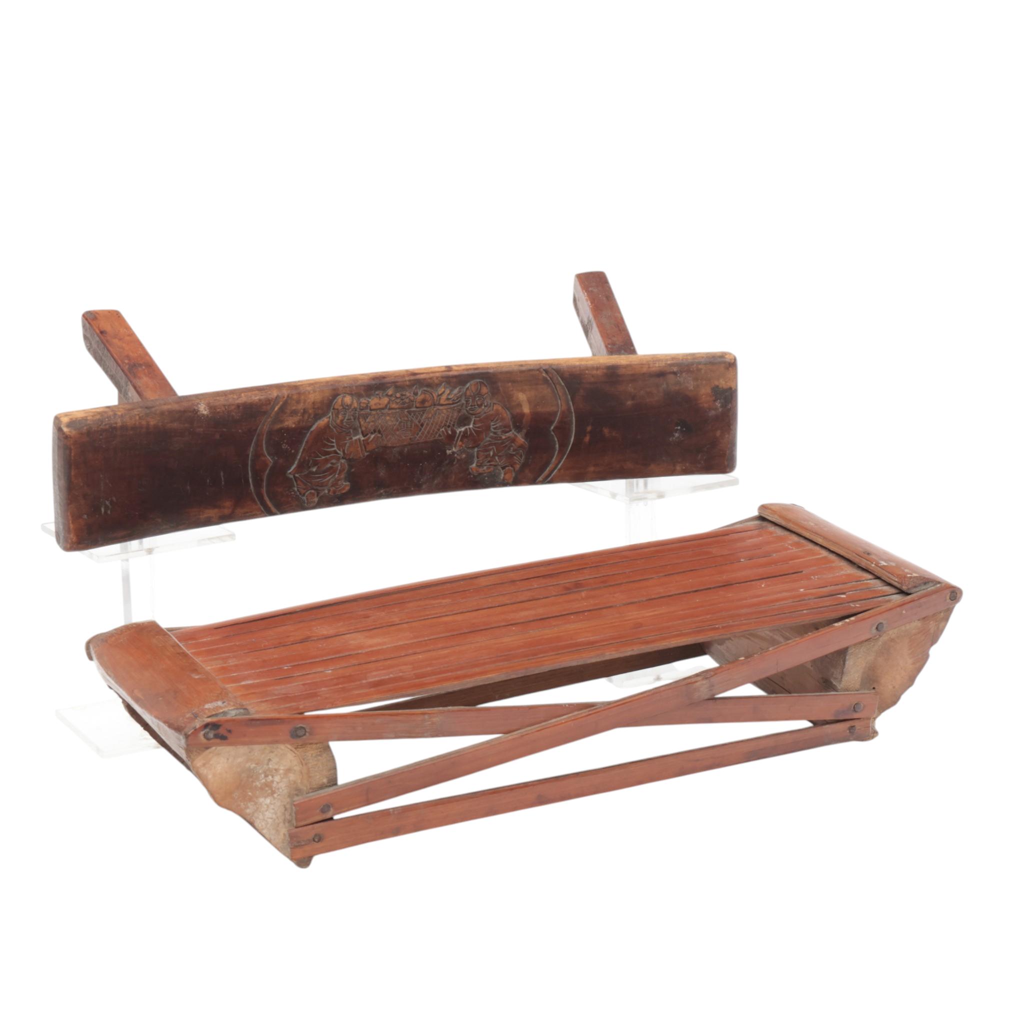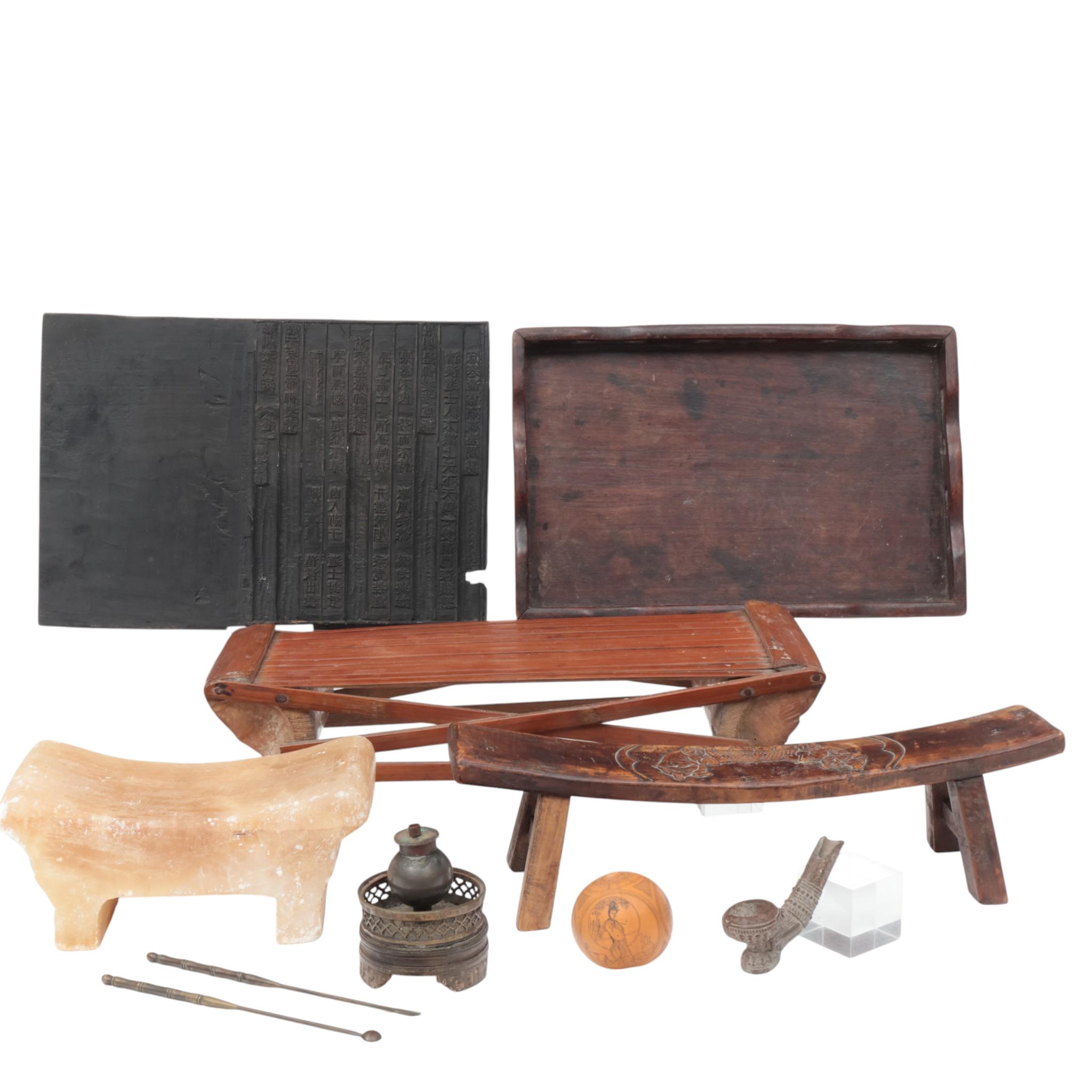 China, a collection of opium implements and two neck-rests, 19th-20th century,