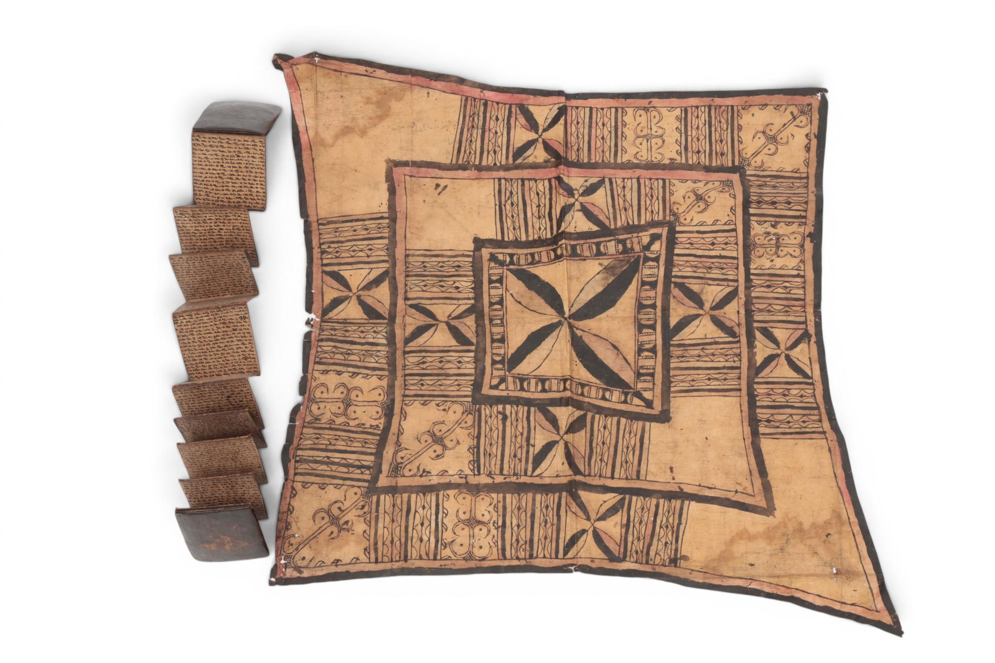 Sulawesi, beaten bark cloth men's headdress, sigas, ca. 1900 and Sumatra, Batak, a small book, pustaha,