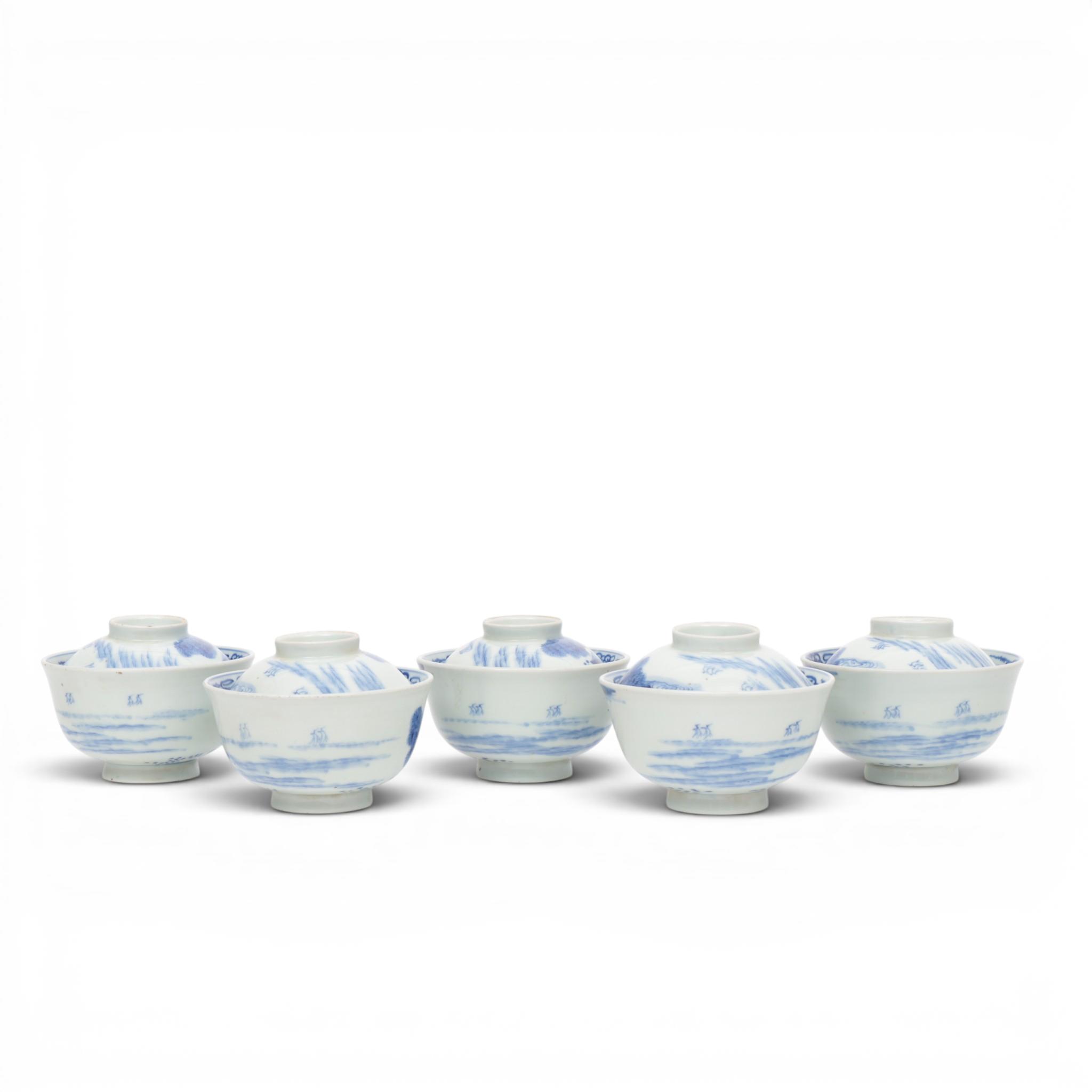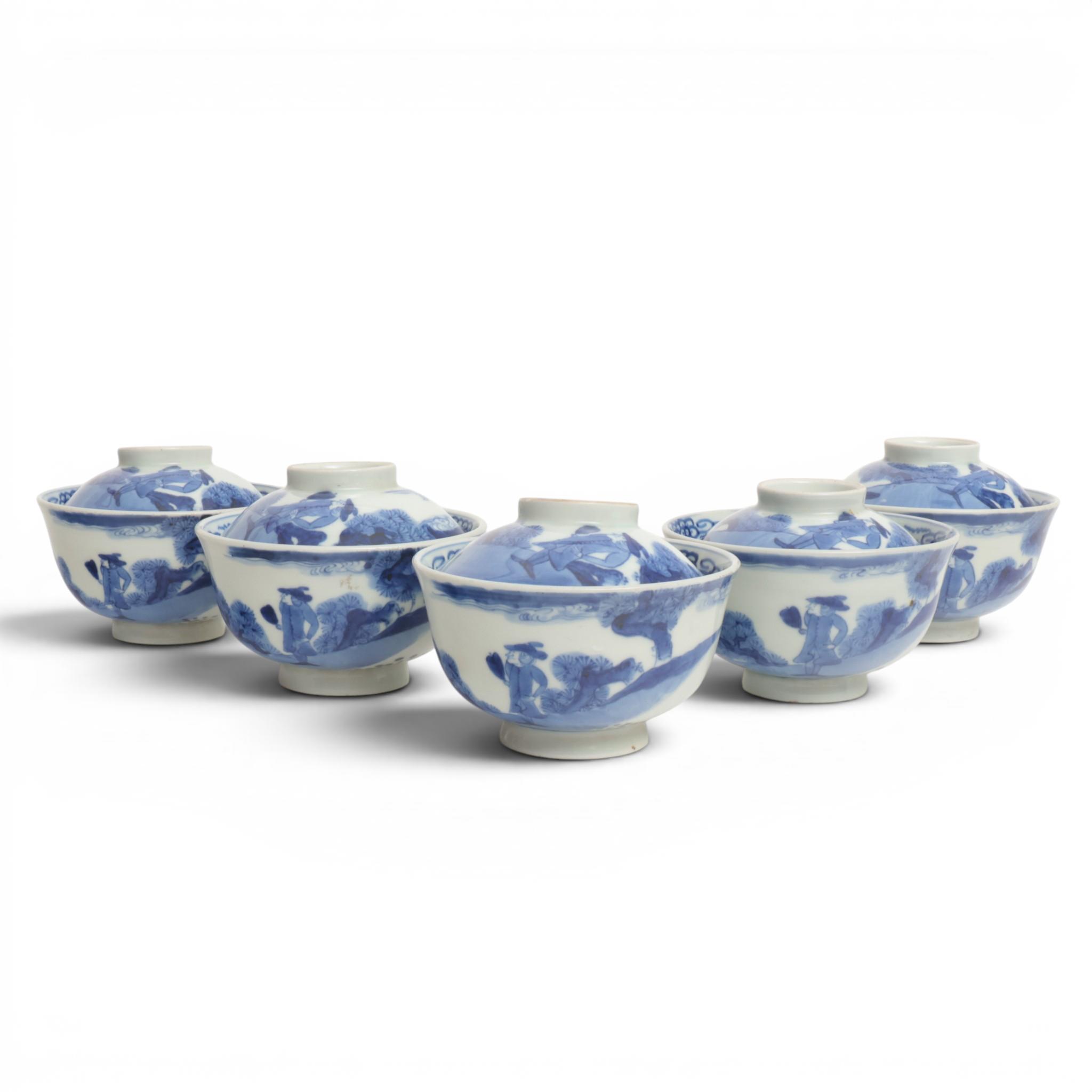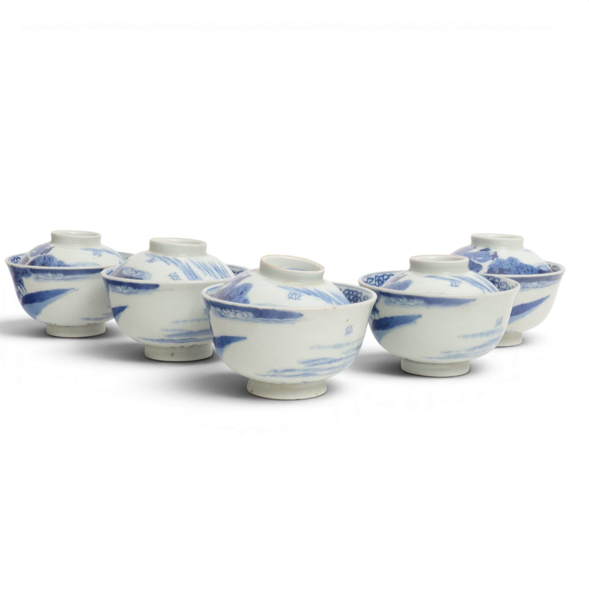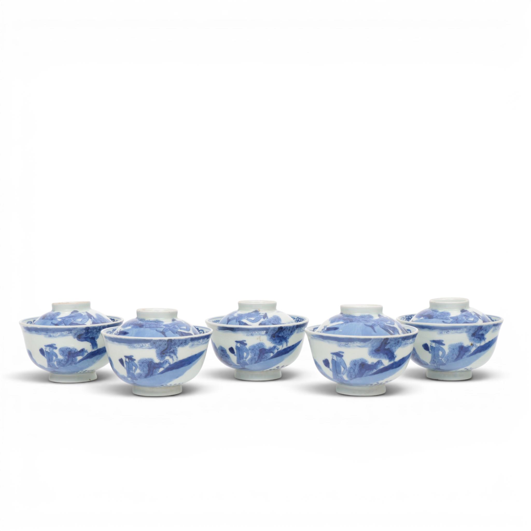 Japan, a set of five blue and white porcelain Namban bowls and covers, ca. 1820-1850,