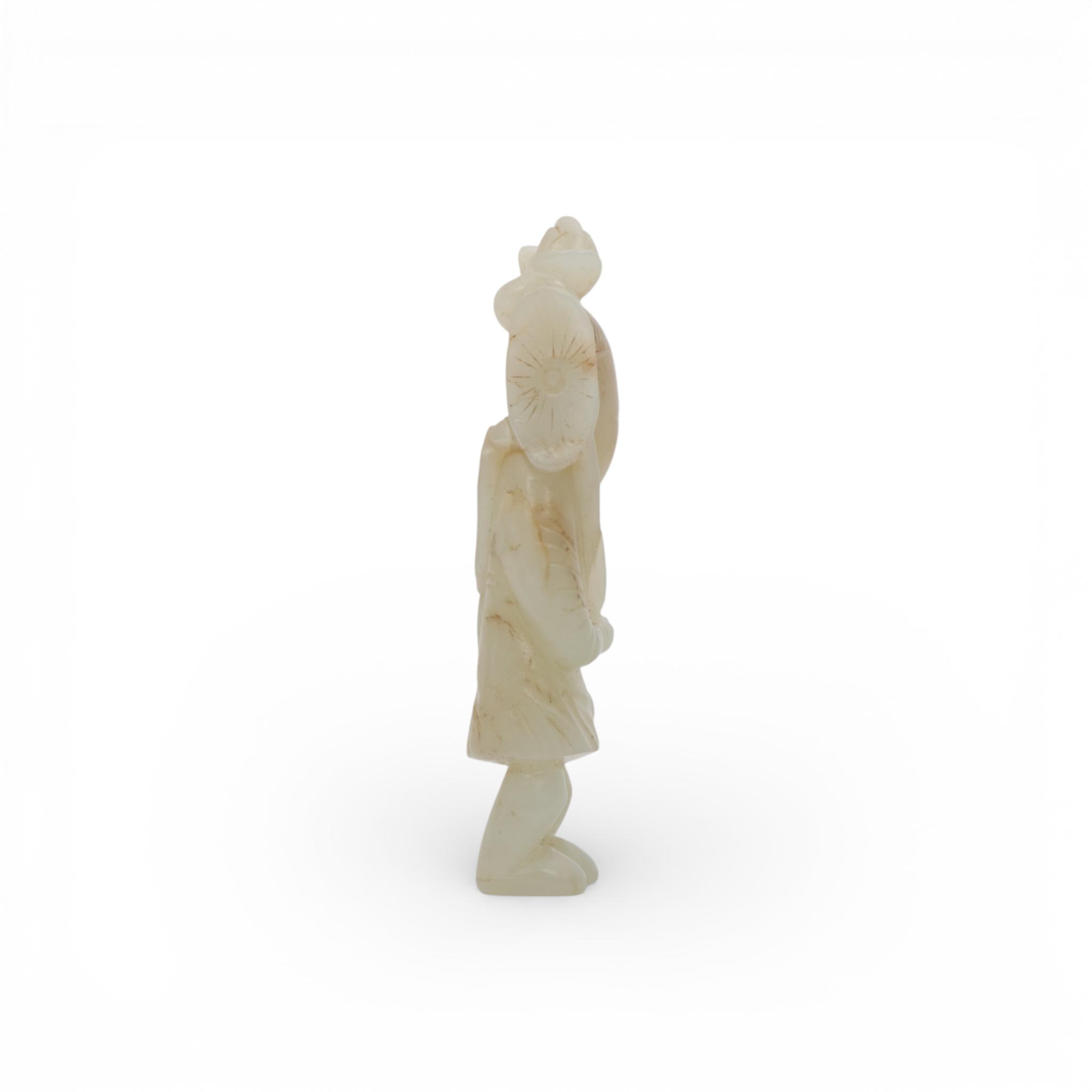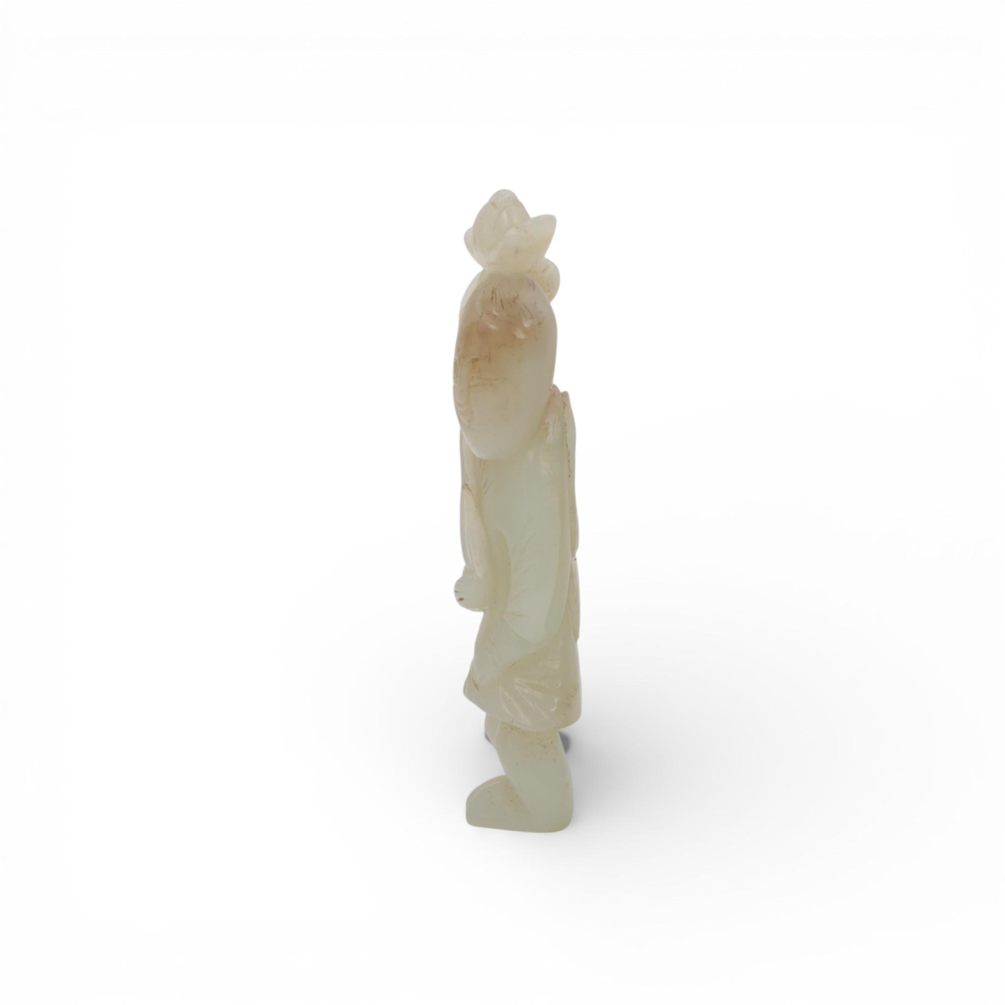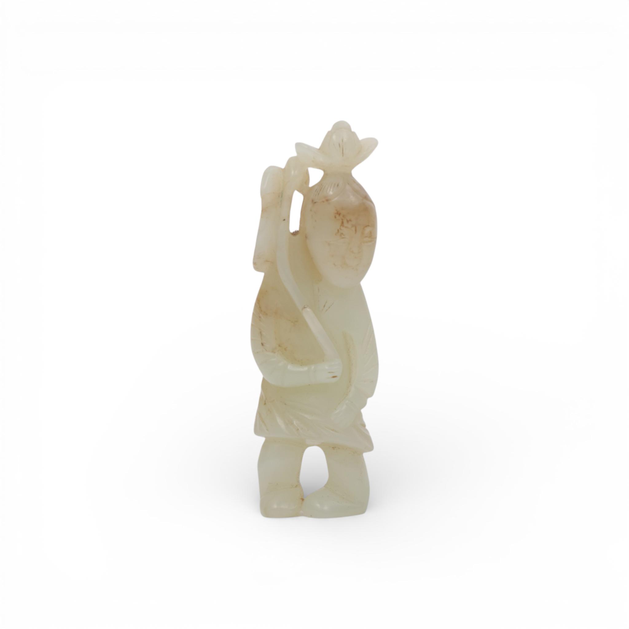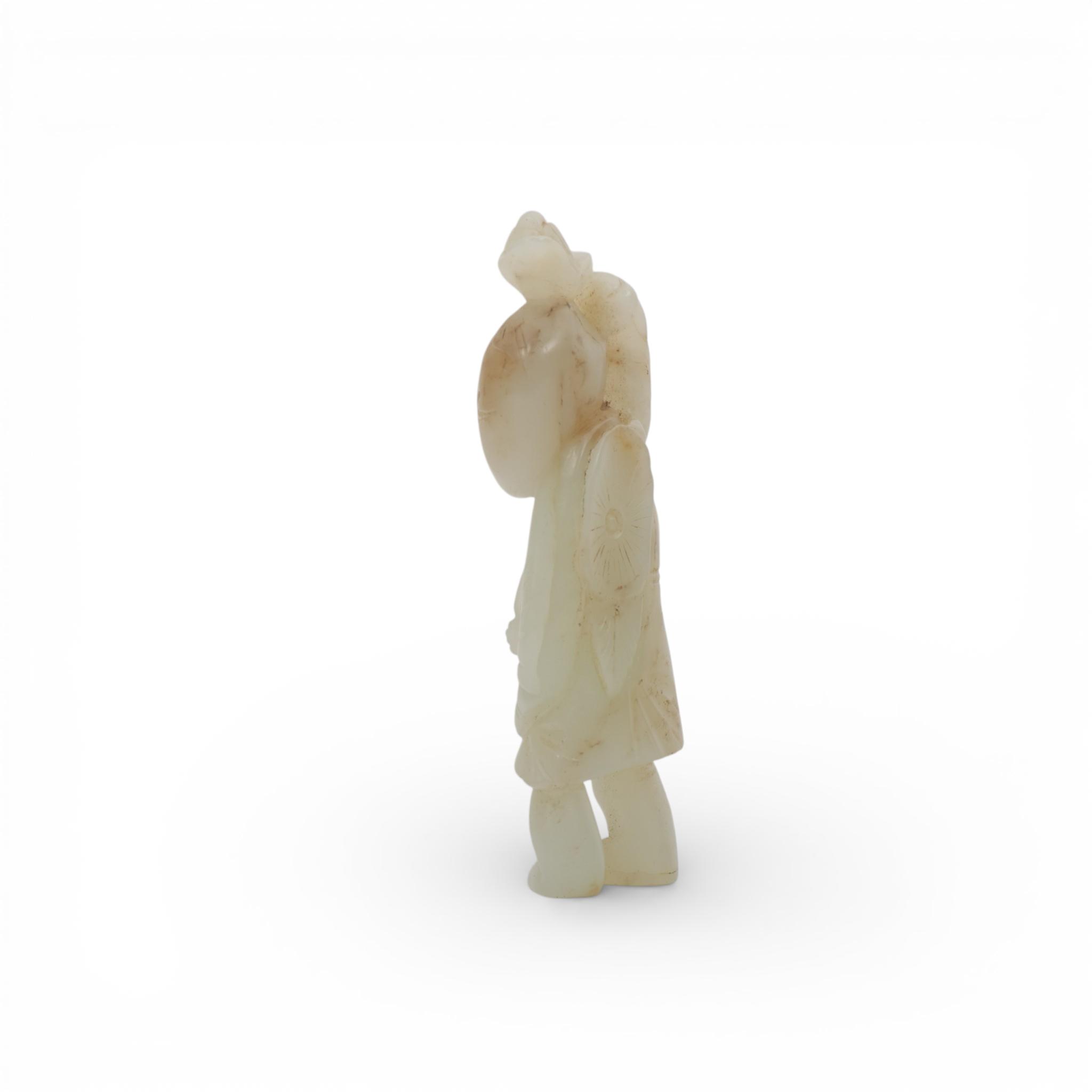 in standing position and holding a lotus stem over her head, the stone of a pale green tone with some grey veins and inclusions (some natural veins and interior cracks to the jade)