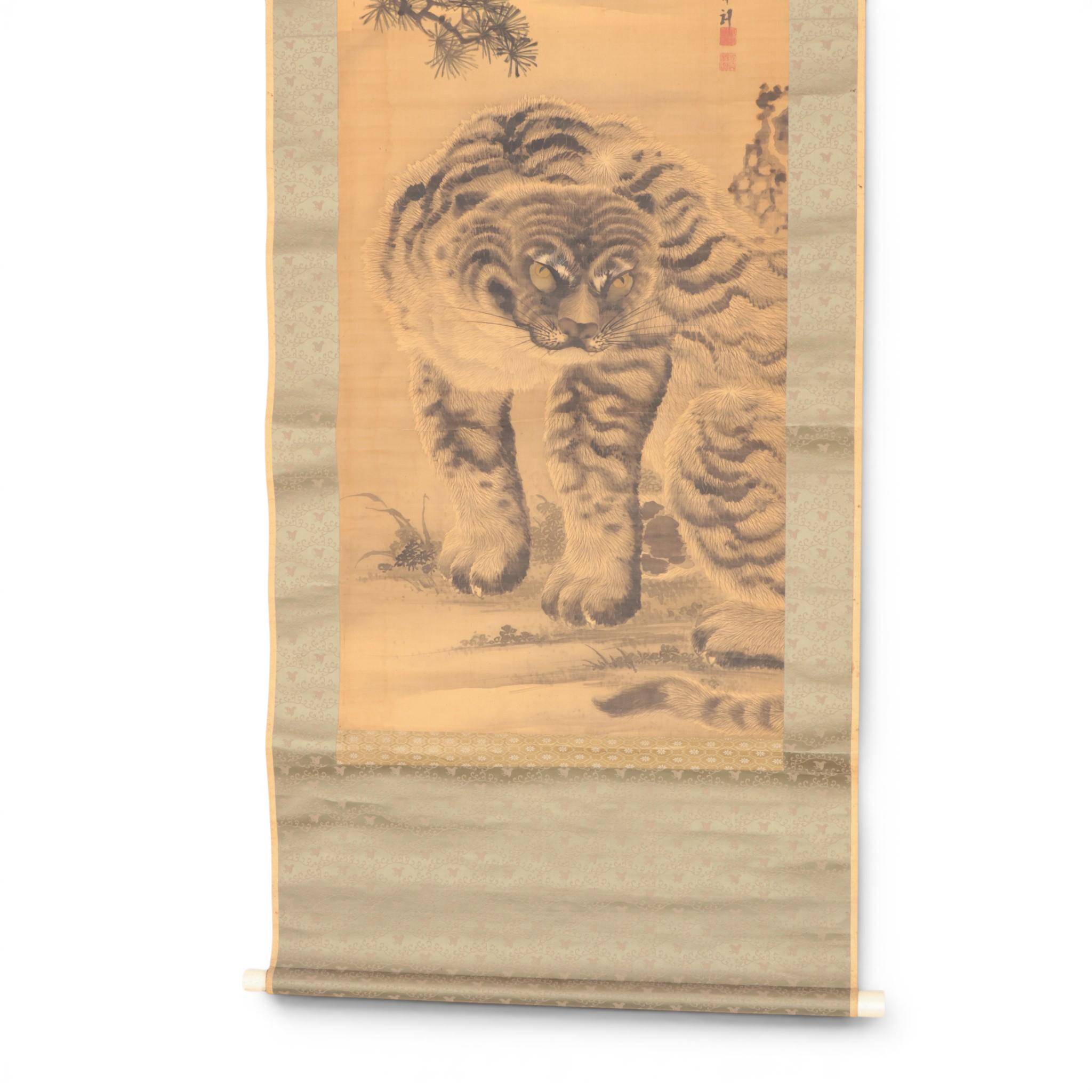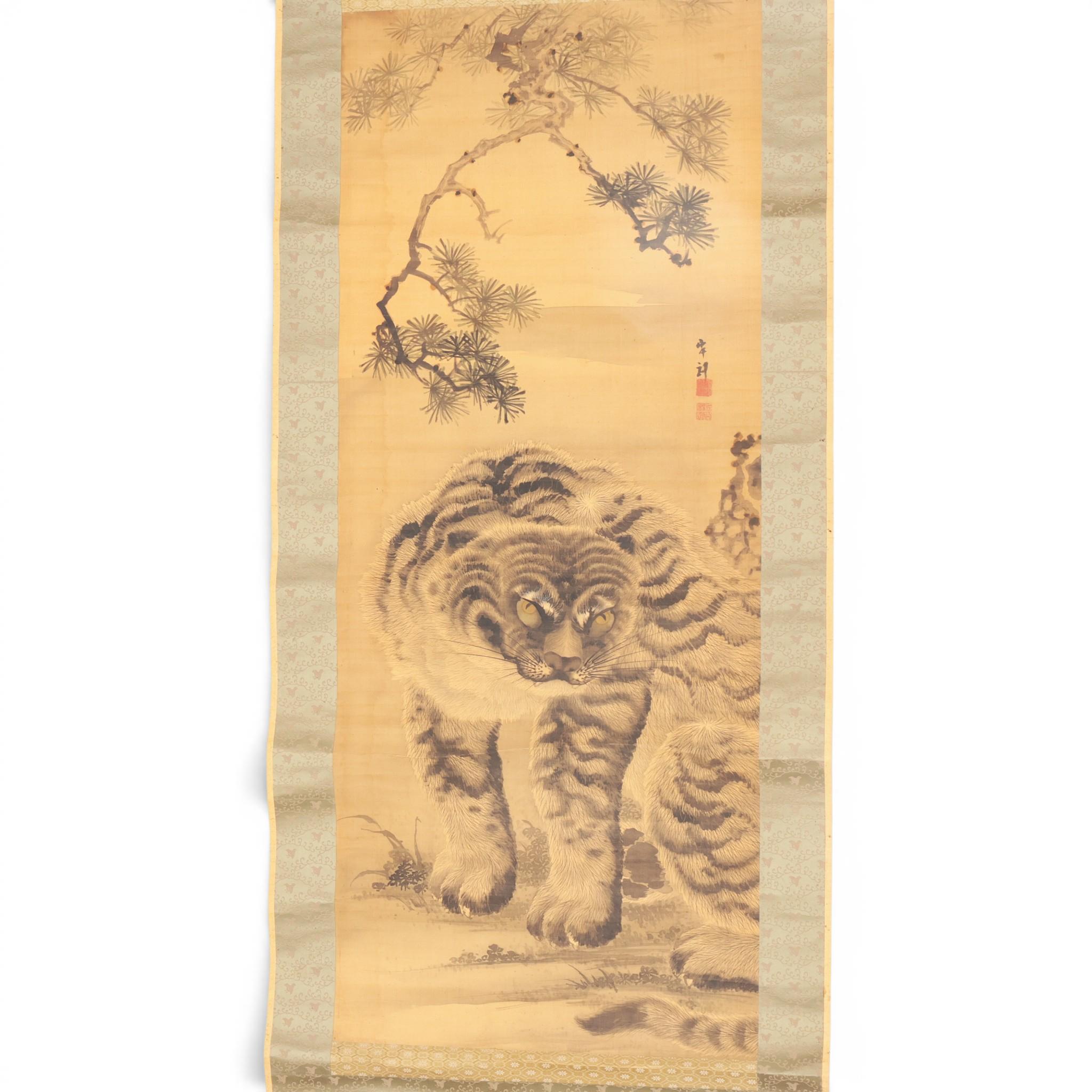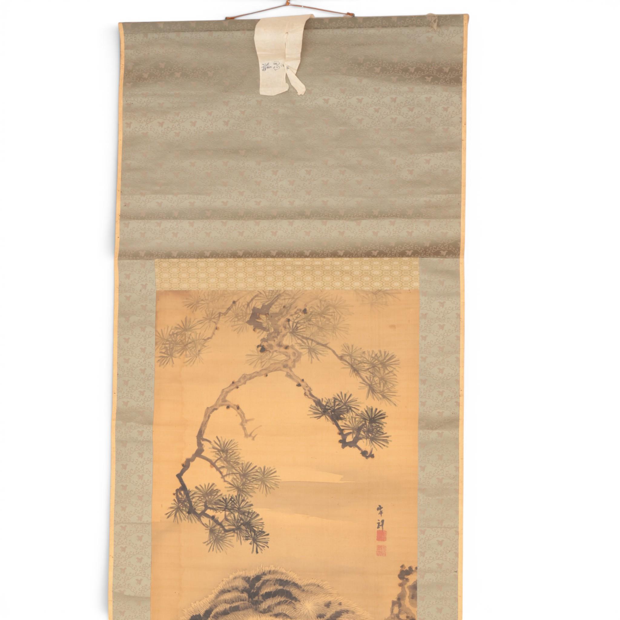 Japan, silk scroll painting (kakemono) depicting a tiger under a pine tree. Signed and sealed Ganku (possibly Kishi Ganku,1756-1839). Bone roller end knobs (jiku).