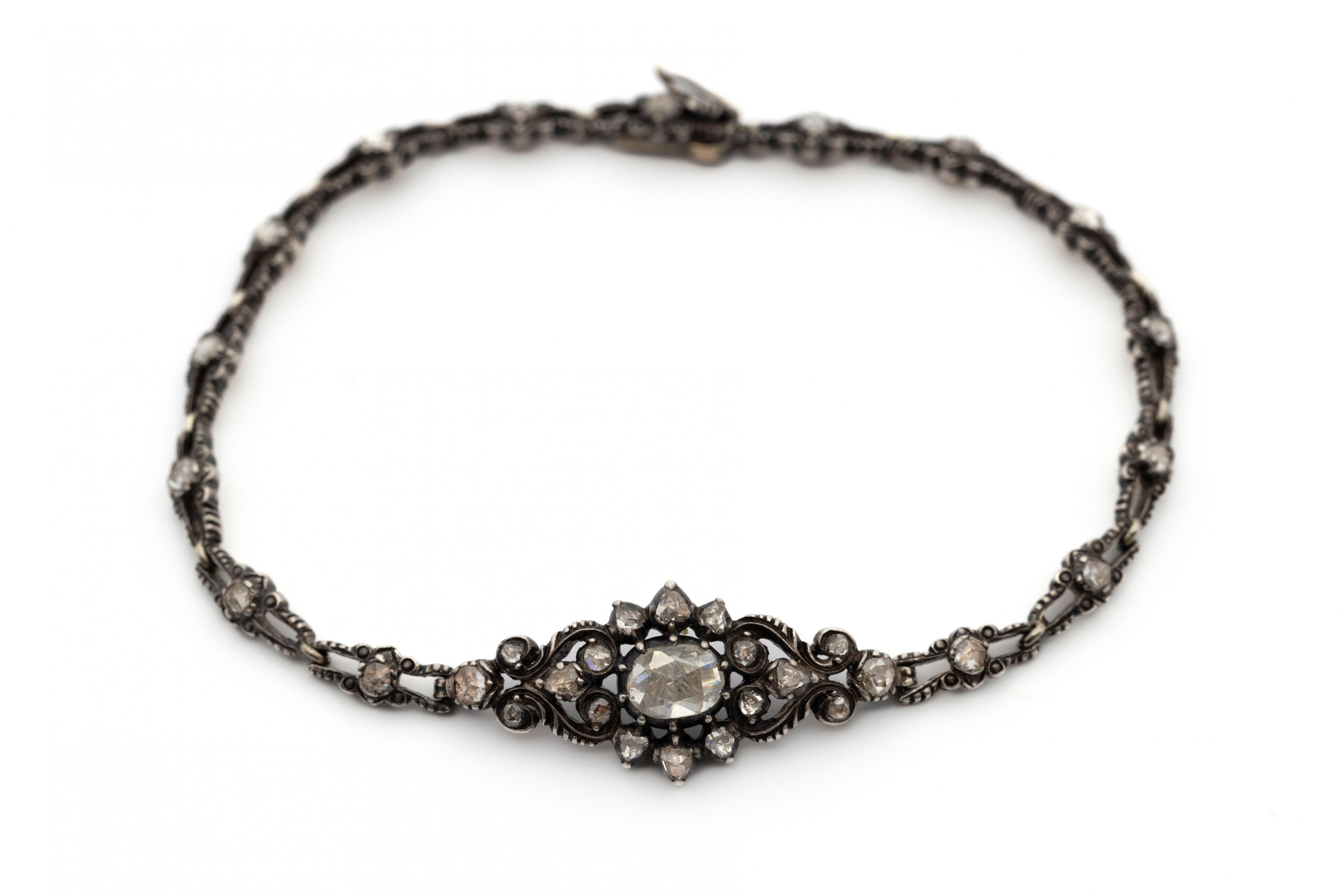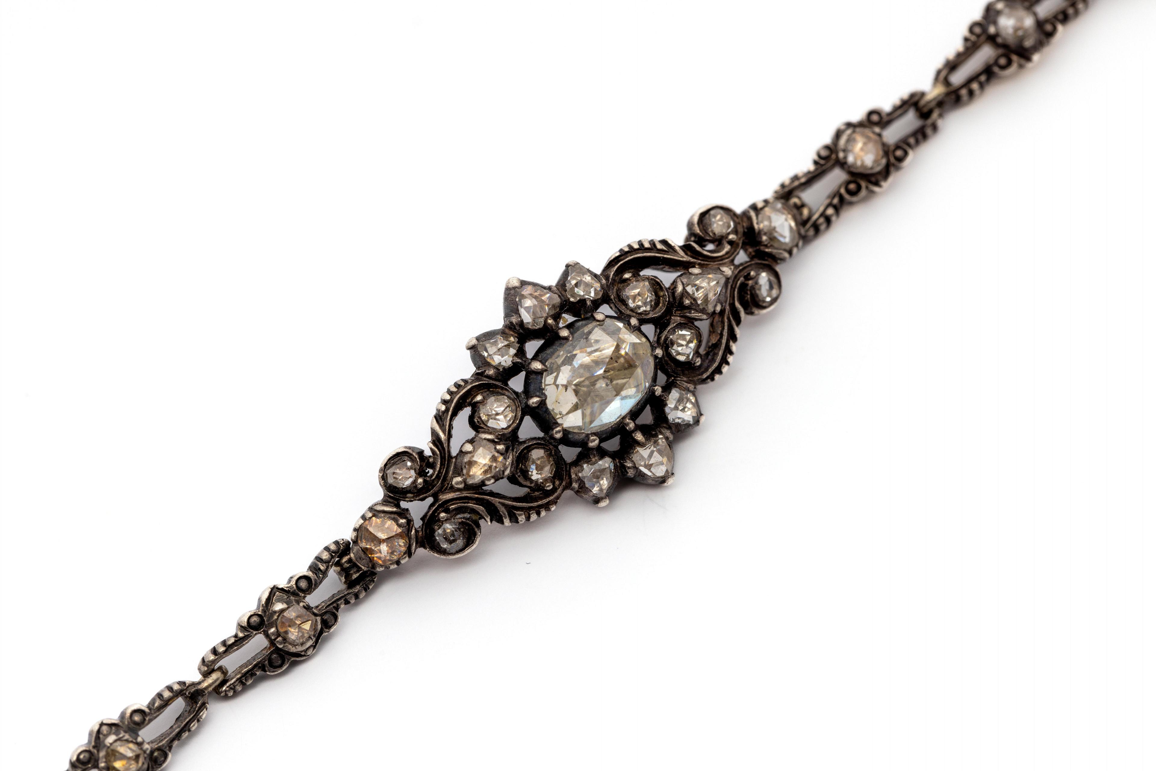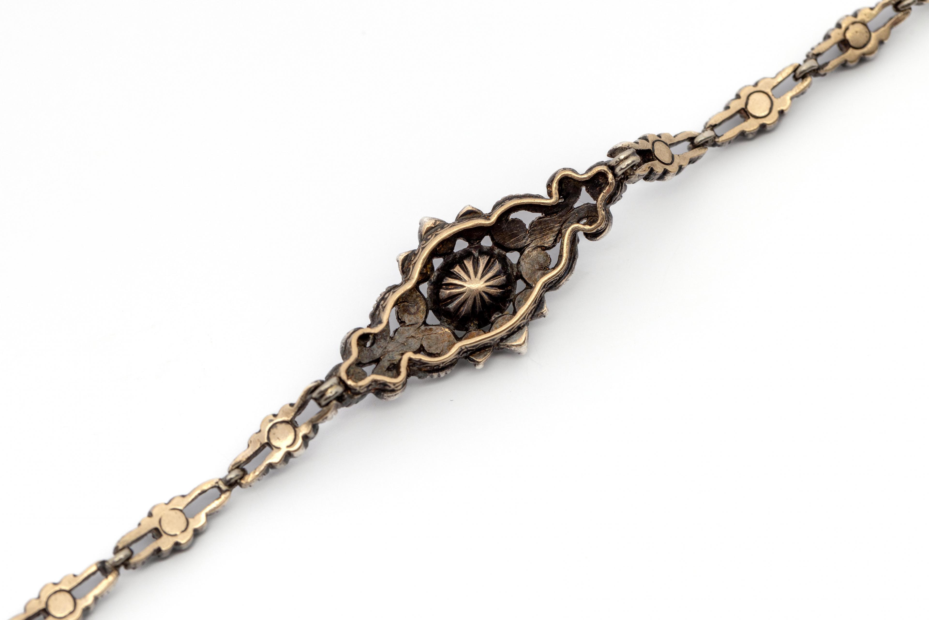 With in the centre an elongated ornament with rosette, set with rose-cut diamonds, the centre stone approx. 6 x 4,8 mm), on oval links, each with a small rose-cut diamond