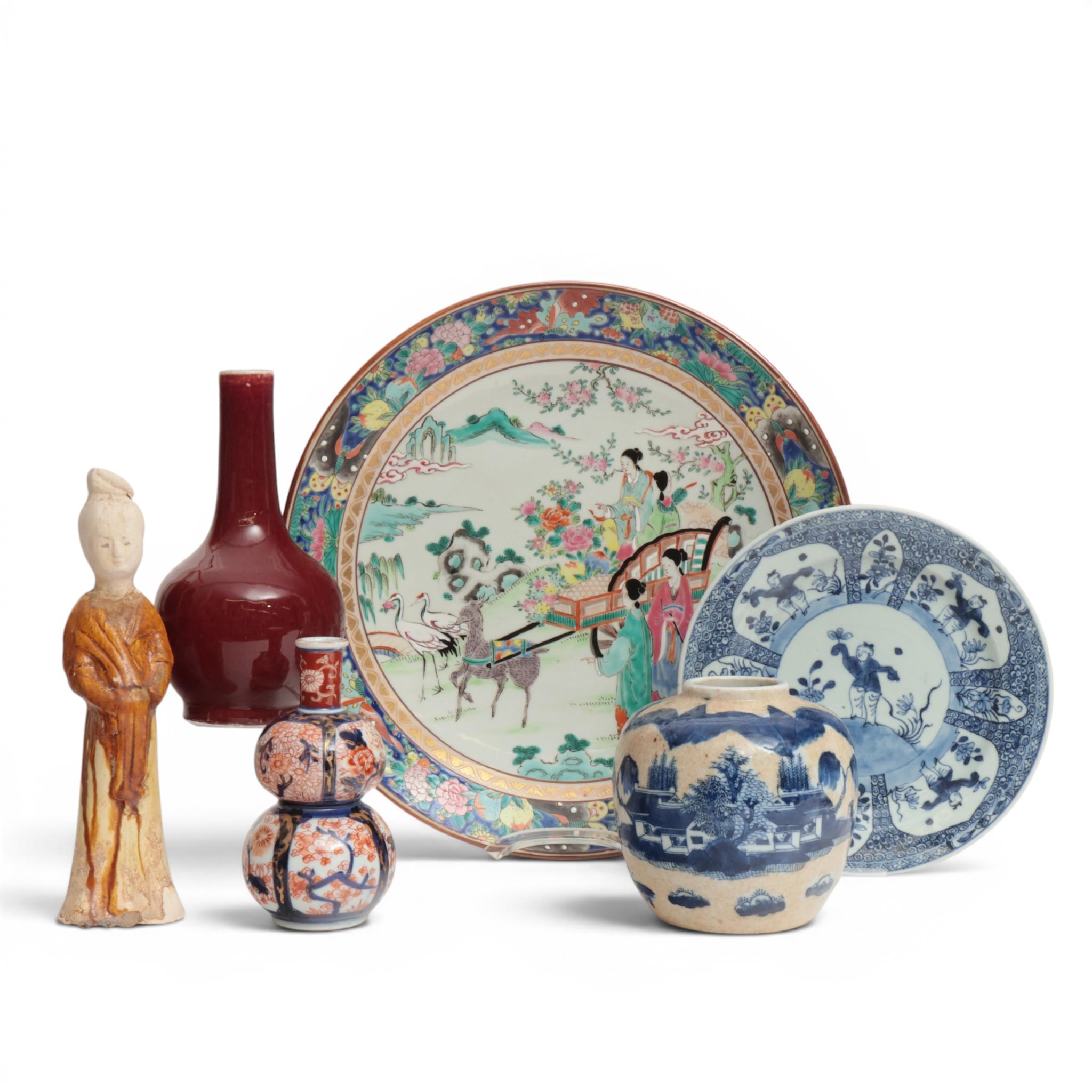 comprising a copper-red-glazed vase, a famille rose dish, a blue and white plate, a ginger jar, a sancai pottery lady and a Japanese Imari vase