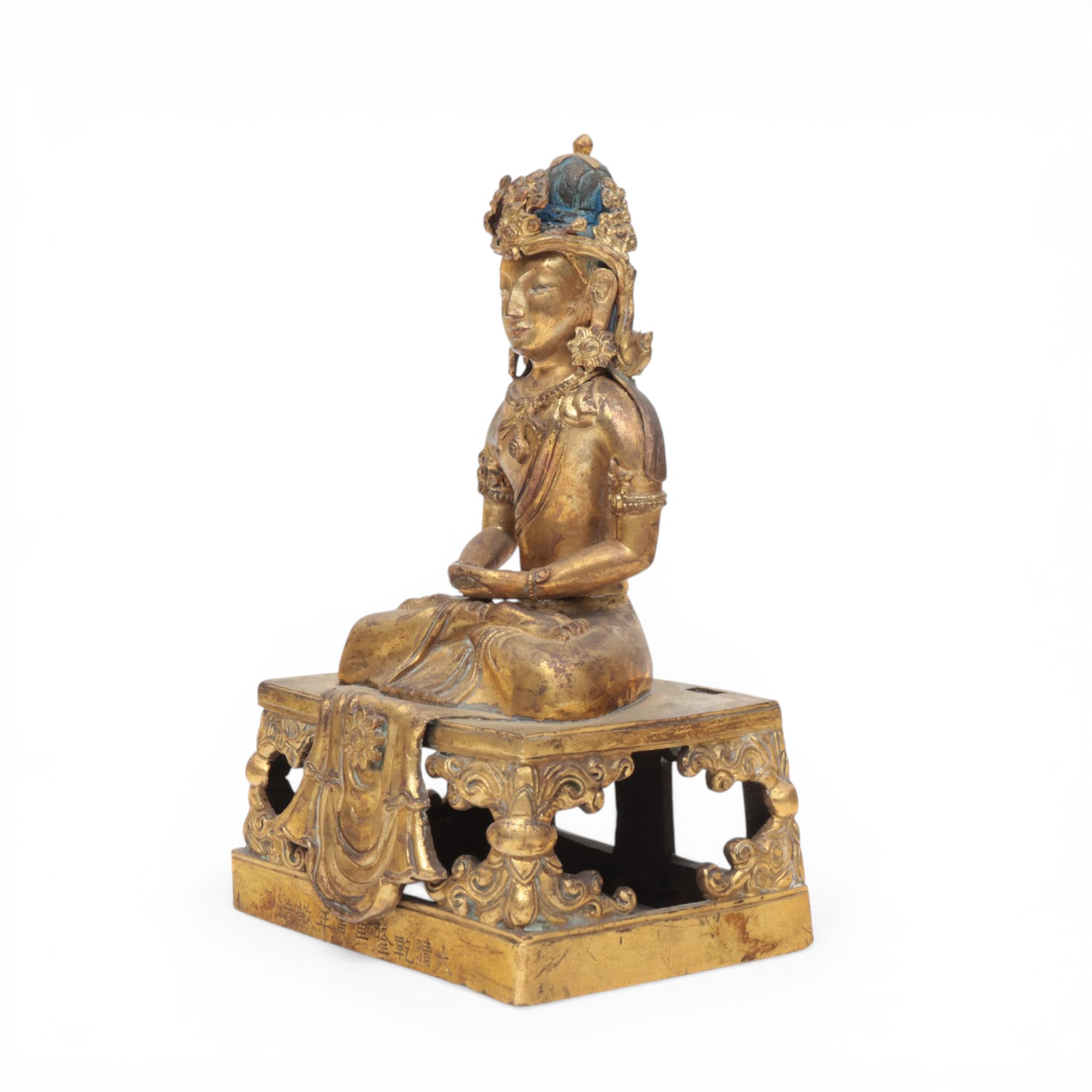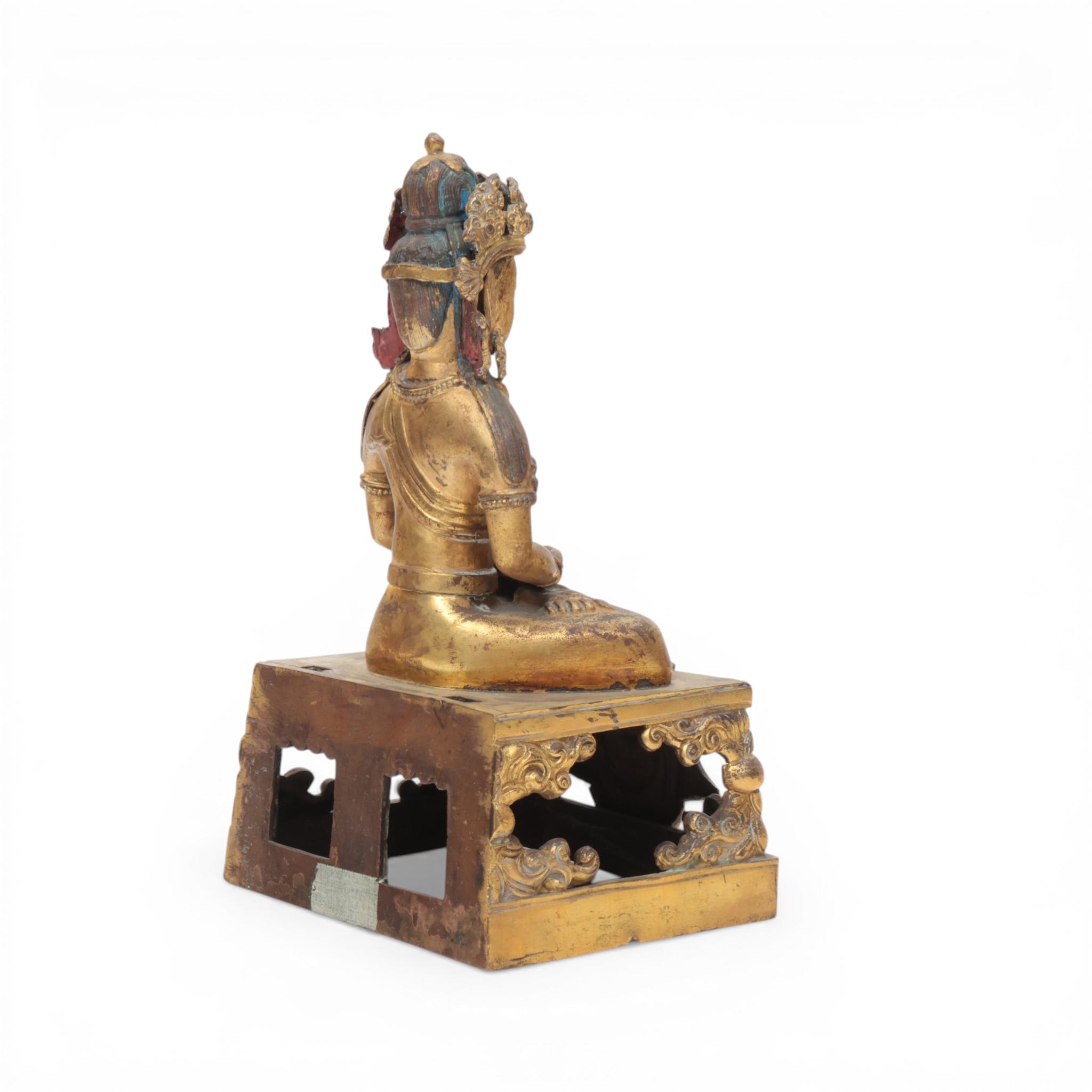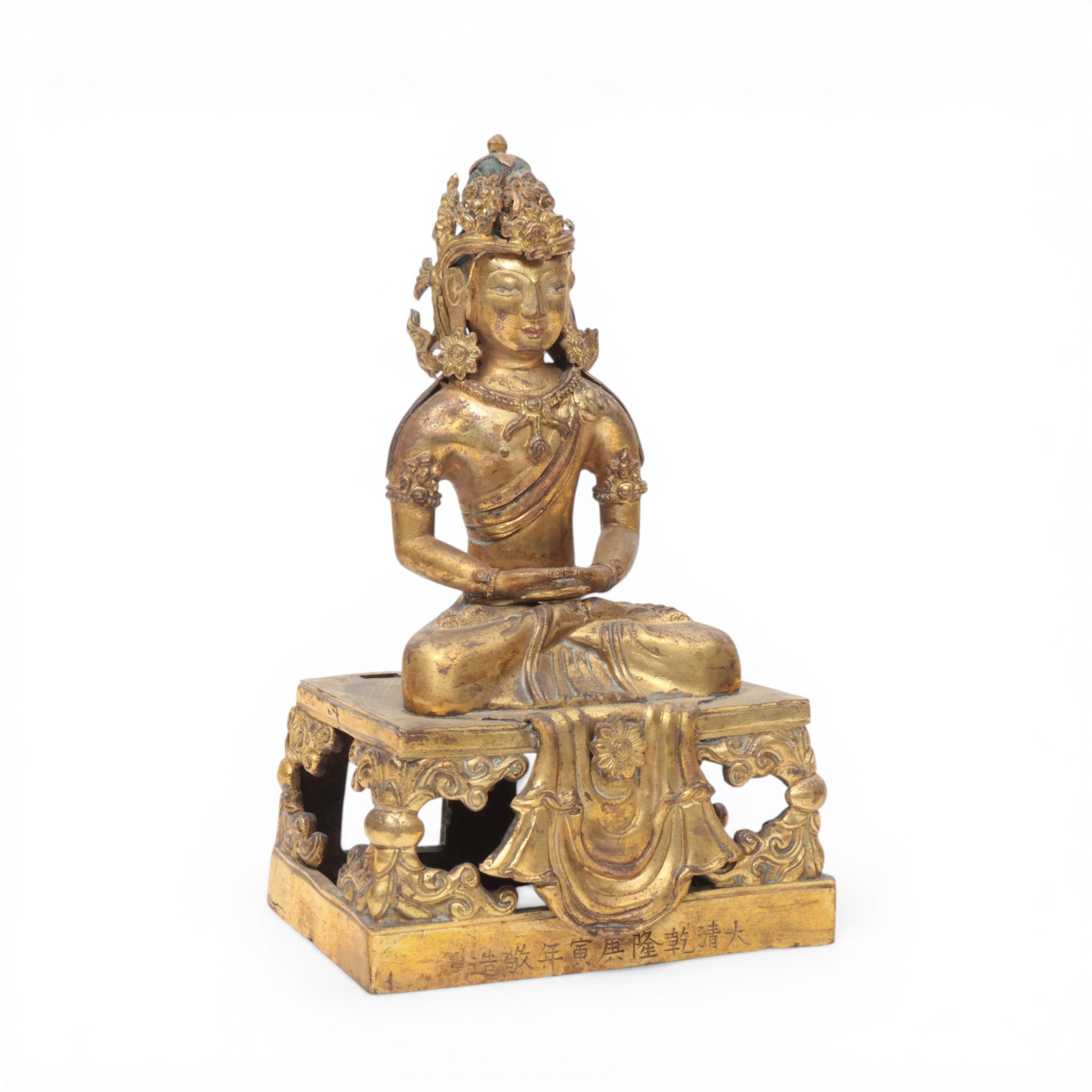 seated in vajrasana on on openworked plinth, his hands in vajramudra and wearing long robes, jewellery and crown, the front of the plinth with an apocryphal Qianlong mark (loss to crown and ornament to ear, alms bowl missing)