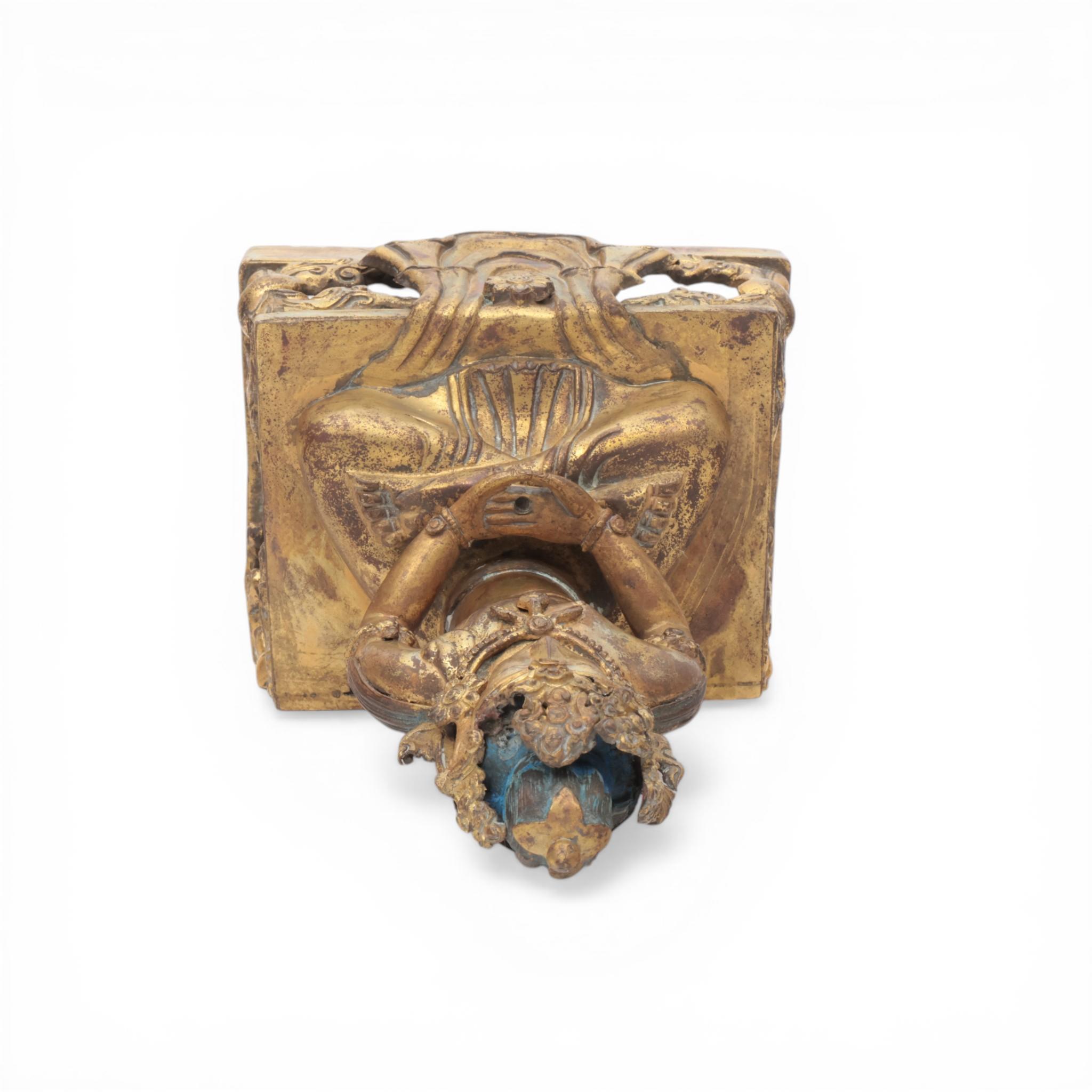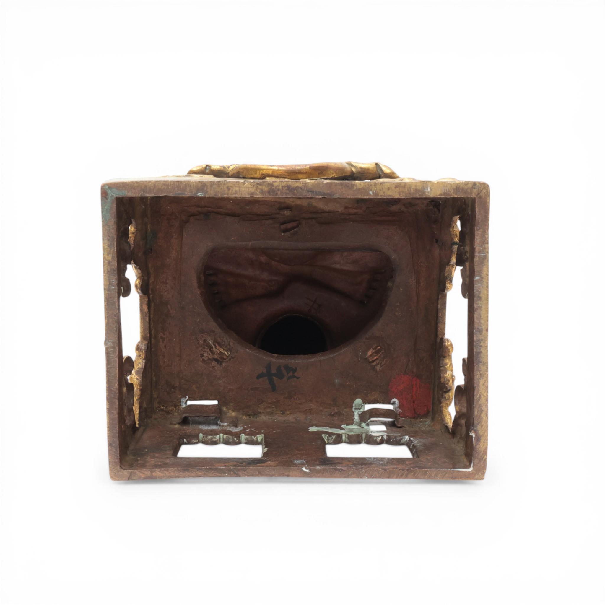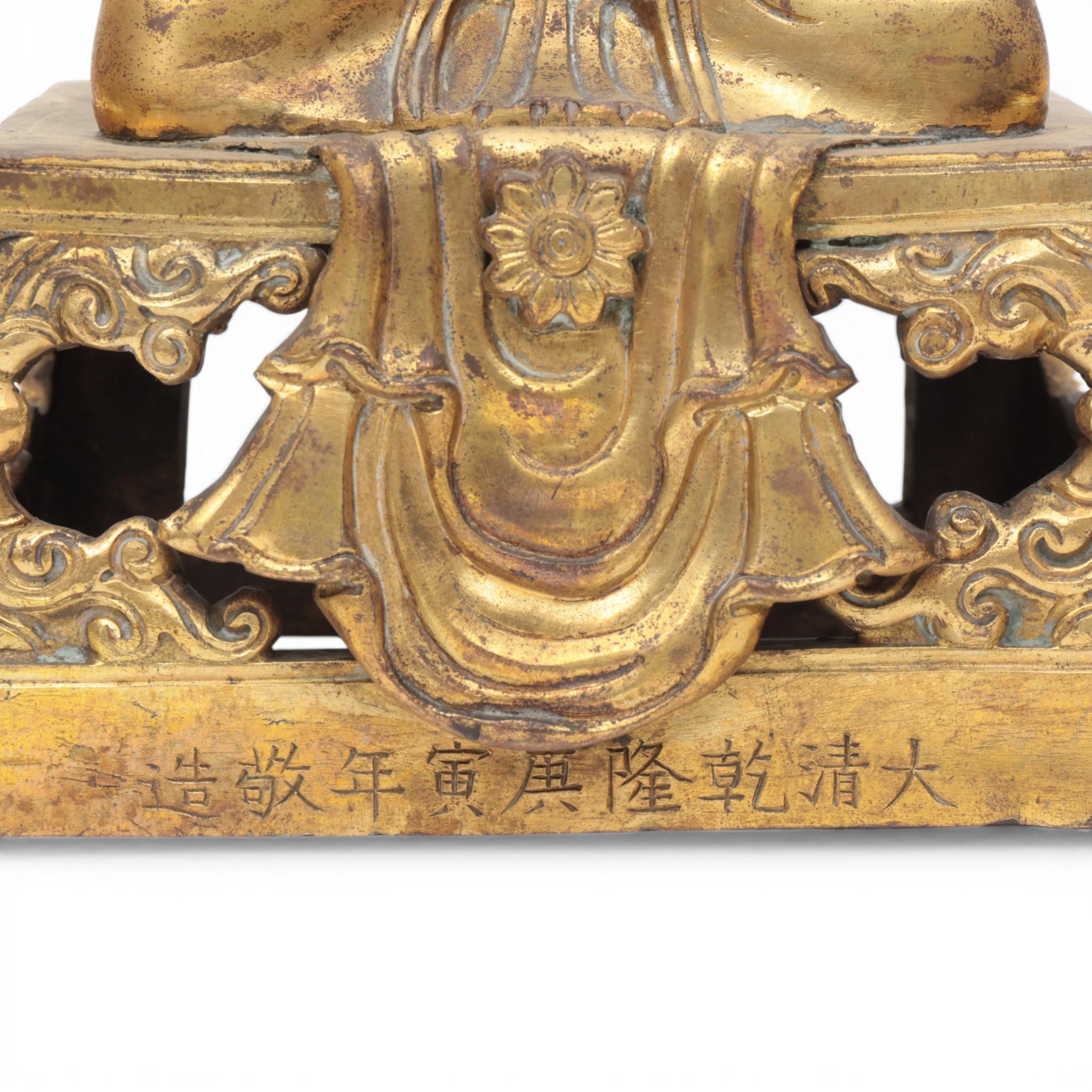 seated in vajrasana on on openworked plinth, his hands in vajramudra and wearing long robes, jewellery and crown, the front of the plinth with an apocryphal Qianlong mark (loss to crown and ornament to ear, alms bowl missing)