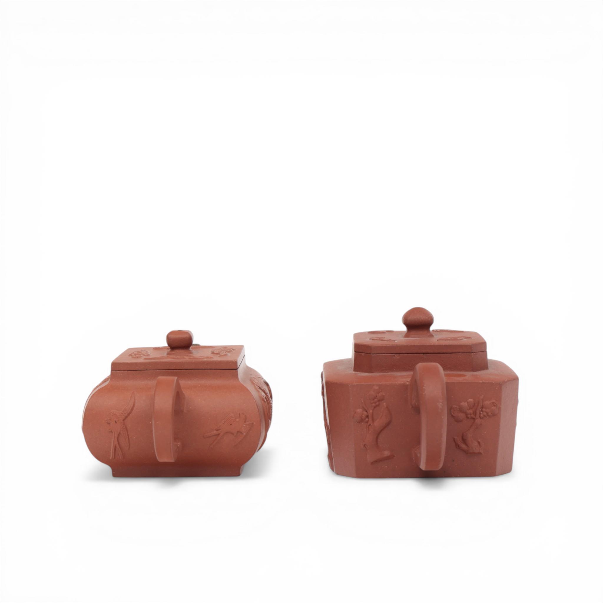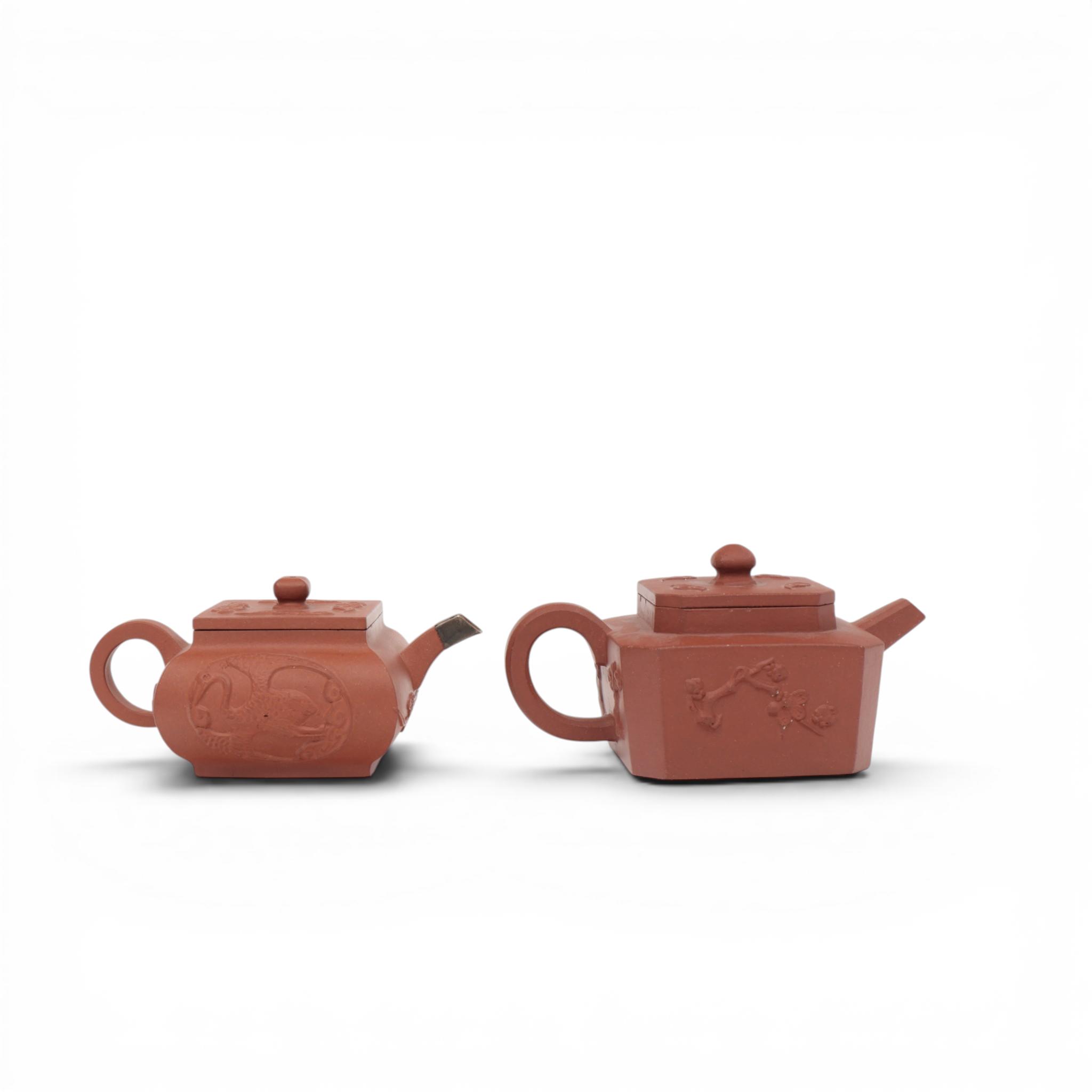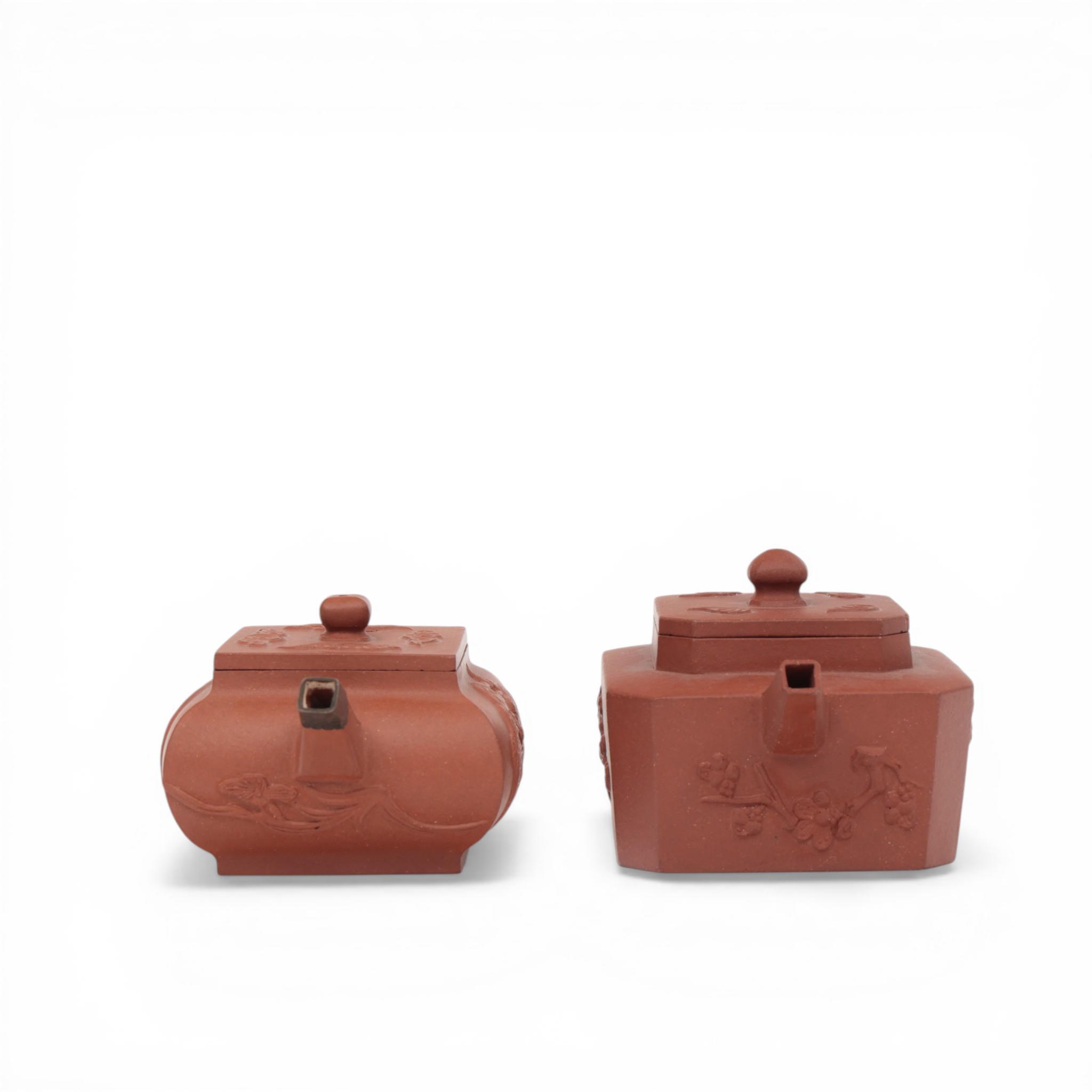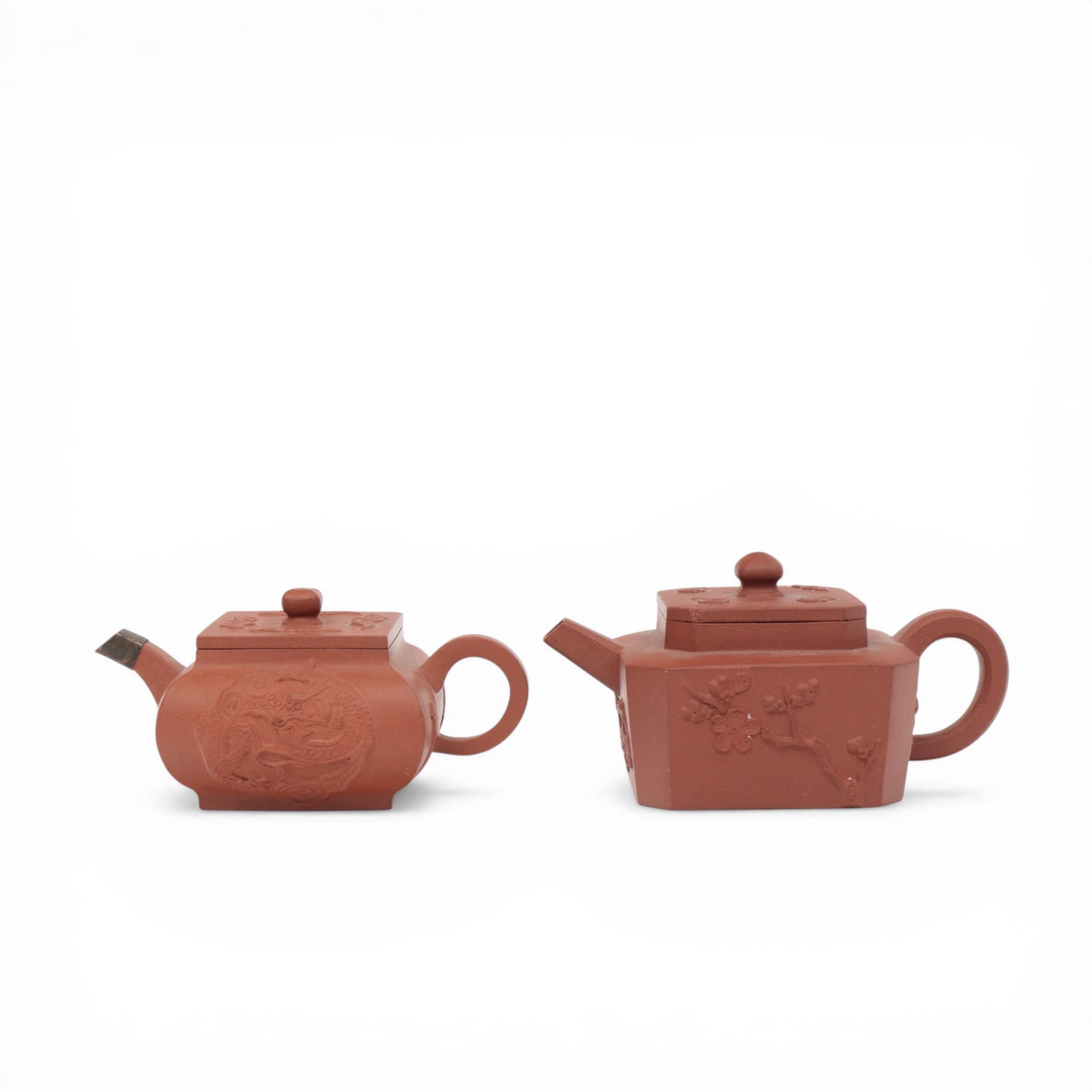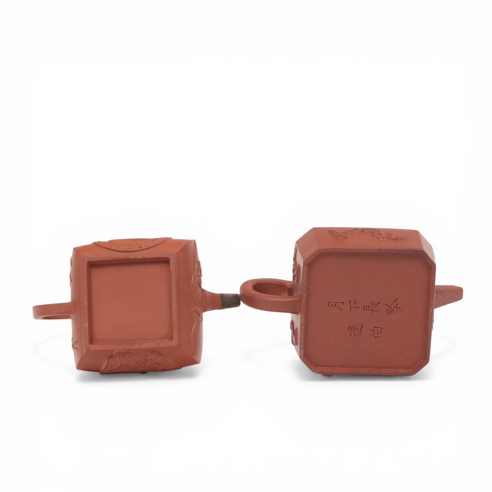 each of square shape, one moulded with prunus sprays and the other with a dragon and a phoenix roundel, the first one with incised mark to the base (minor frits)