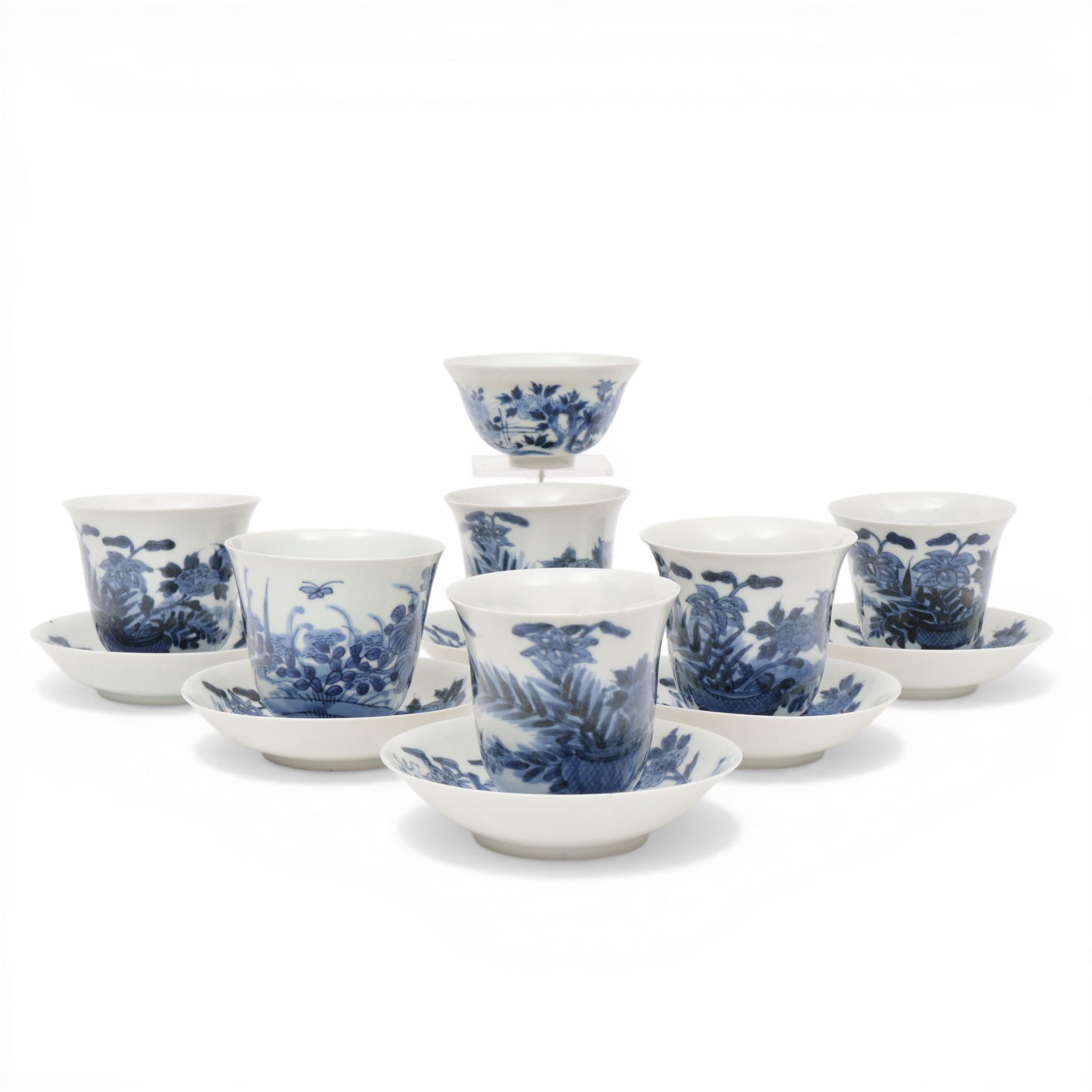 painted with a flower-garden, the bases with six-character marks, together with a lower cup with similar decoration (one cup with hairline, some small nicks)