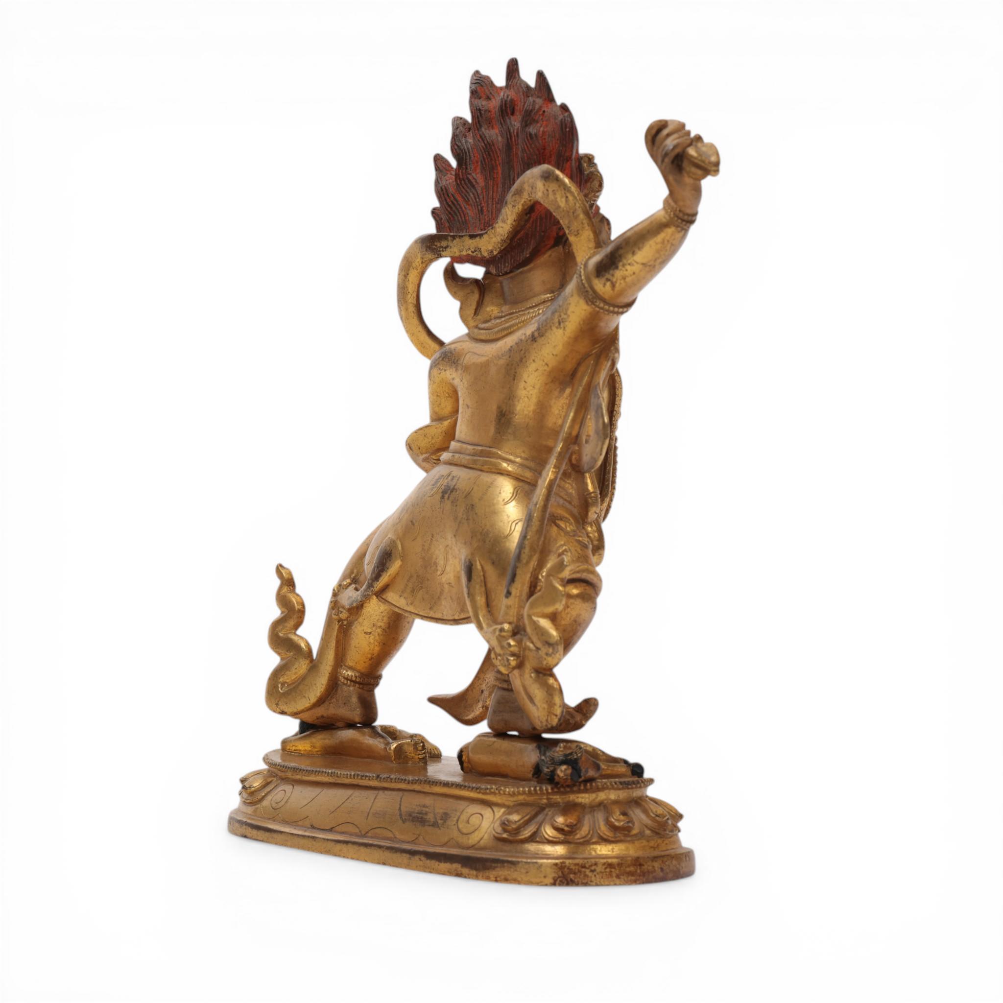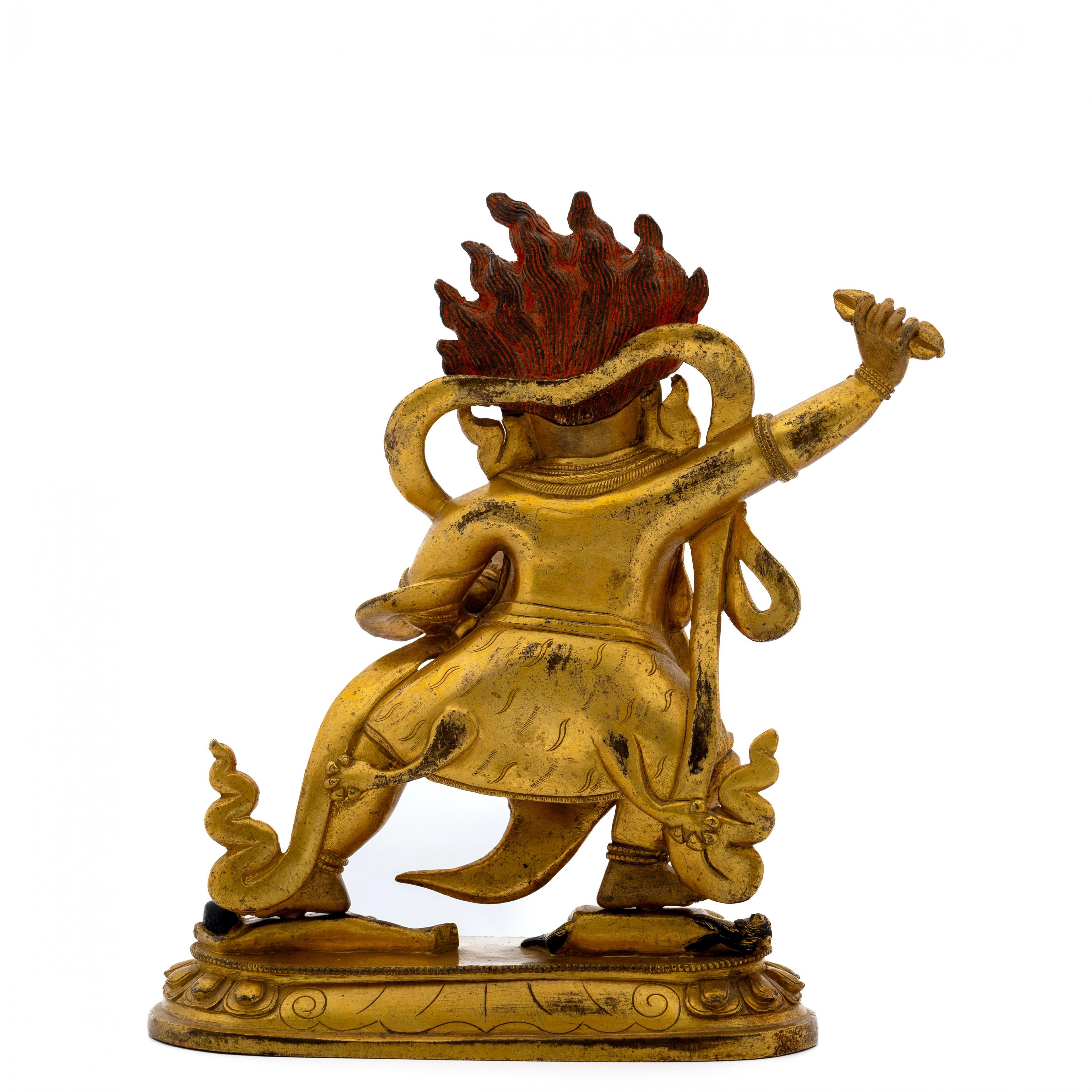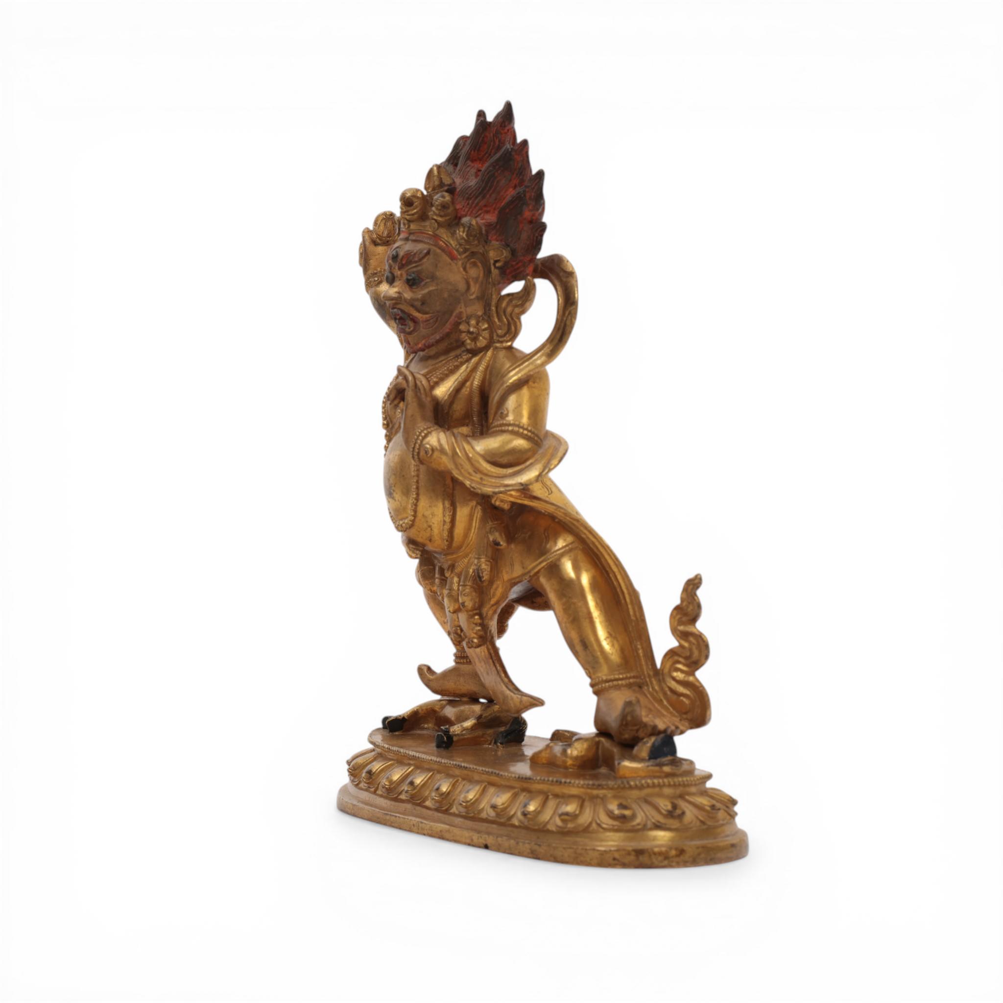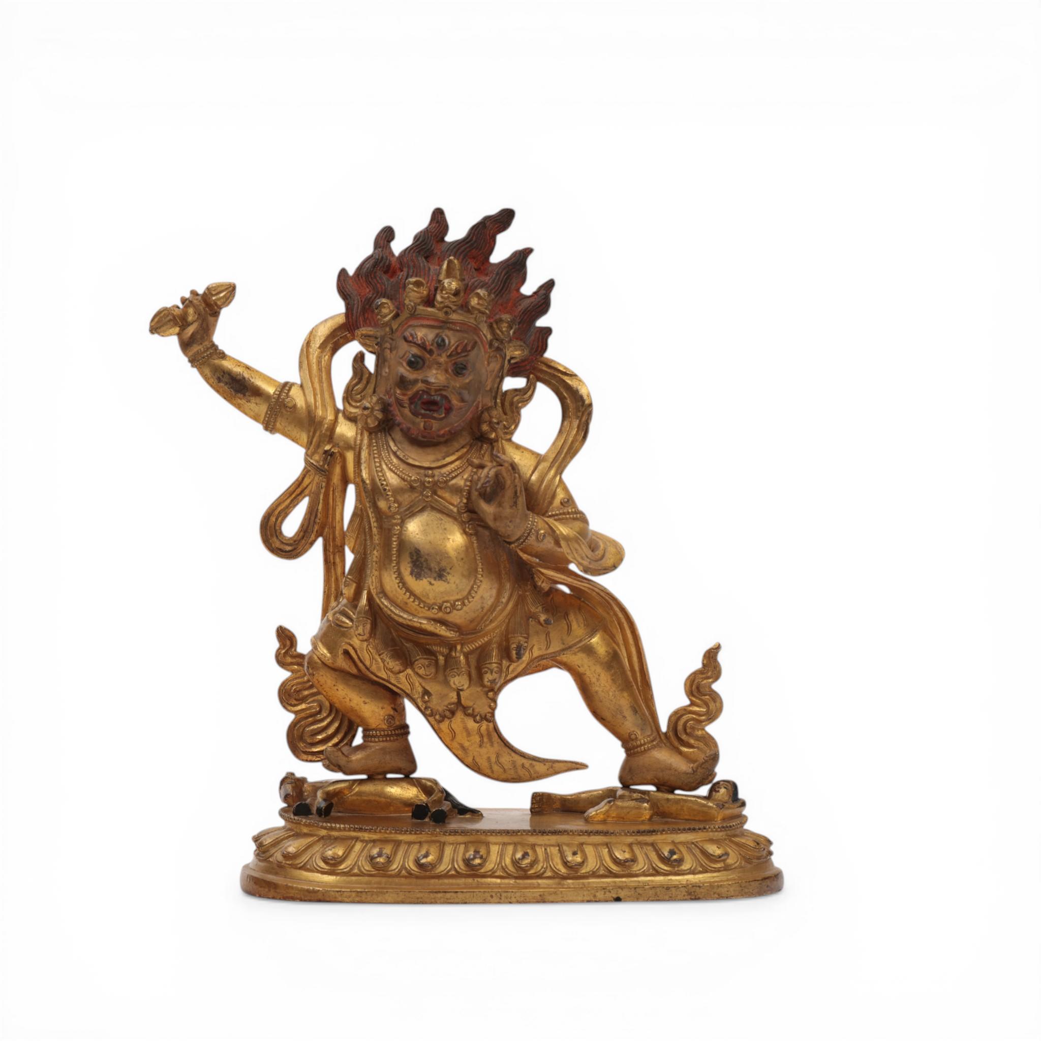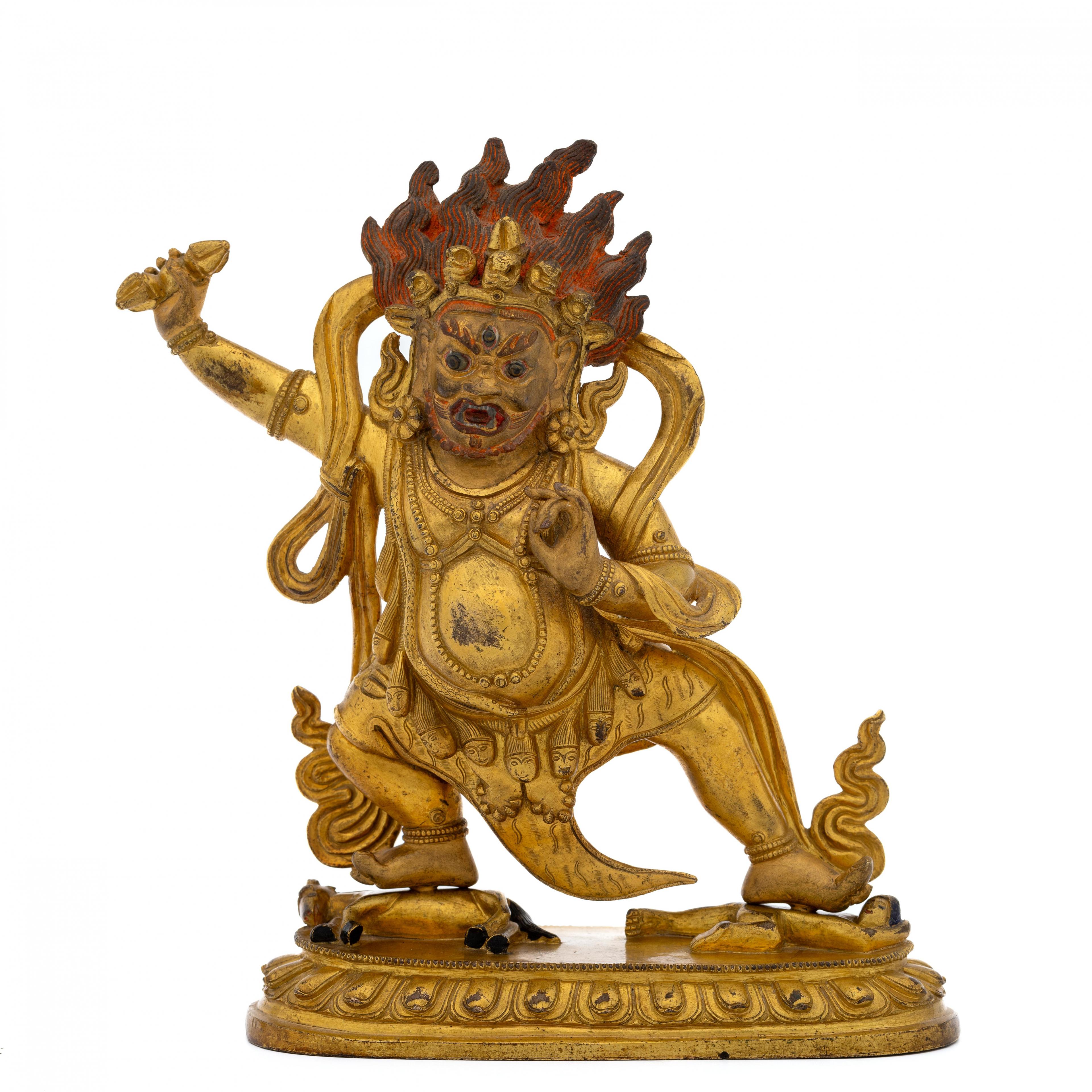 the fierce deity standing in pratyalidhasana on a horse and human figure, holding a vajra in his right hand and his left in tarjanimudra, wearing a tiger skin and elaborate jewellery, the face with wrathful expression and cold-gilt, the headdress with five skulls before a vajra and his flaming hair with red pigments