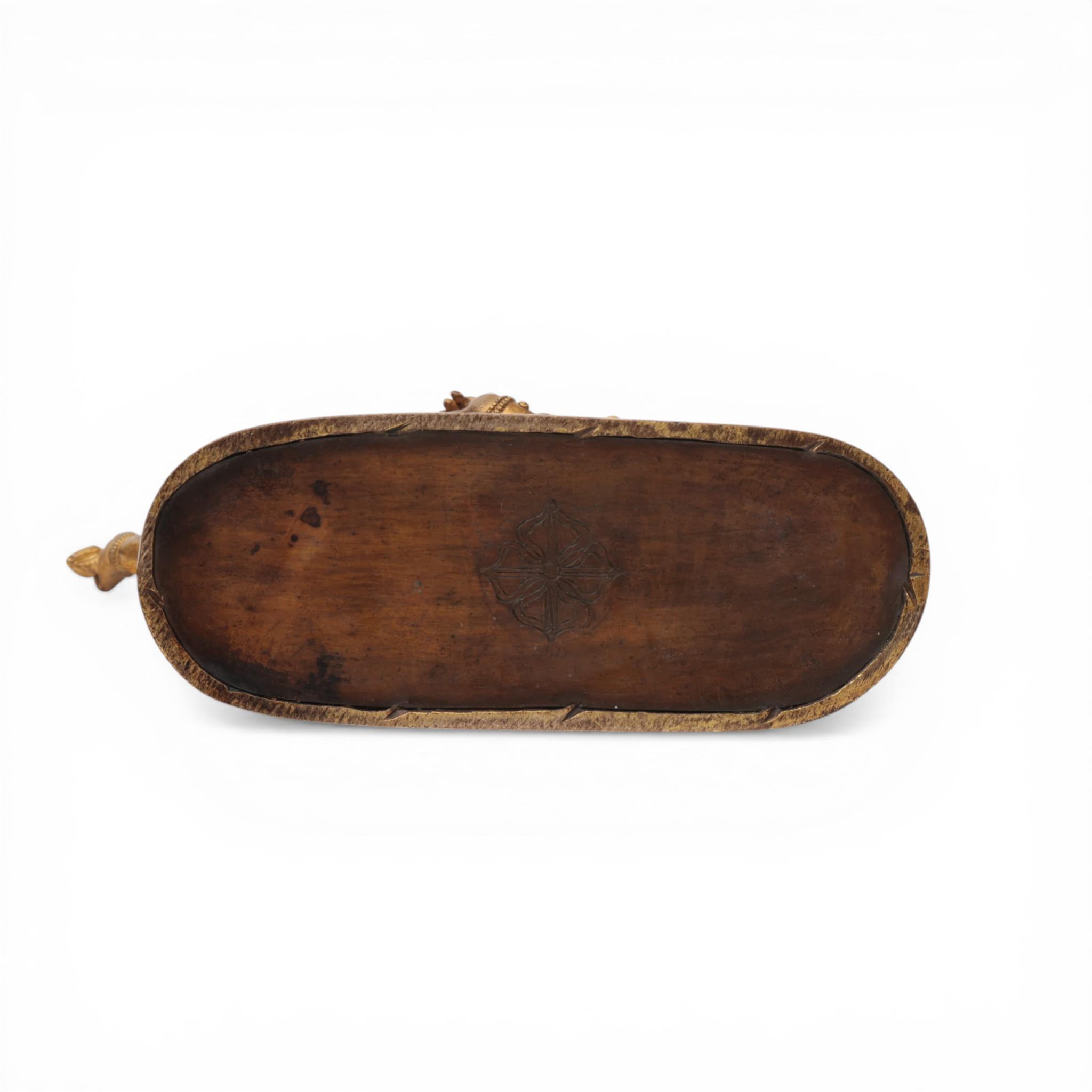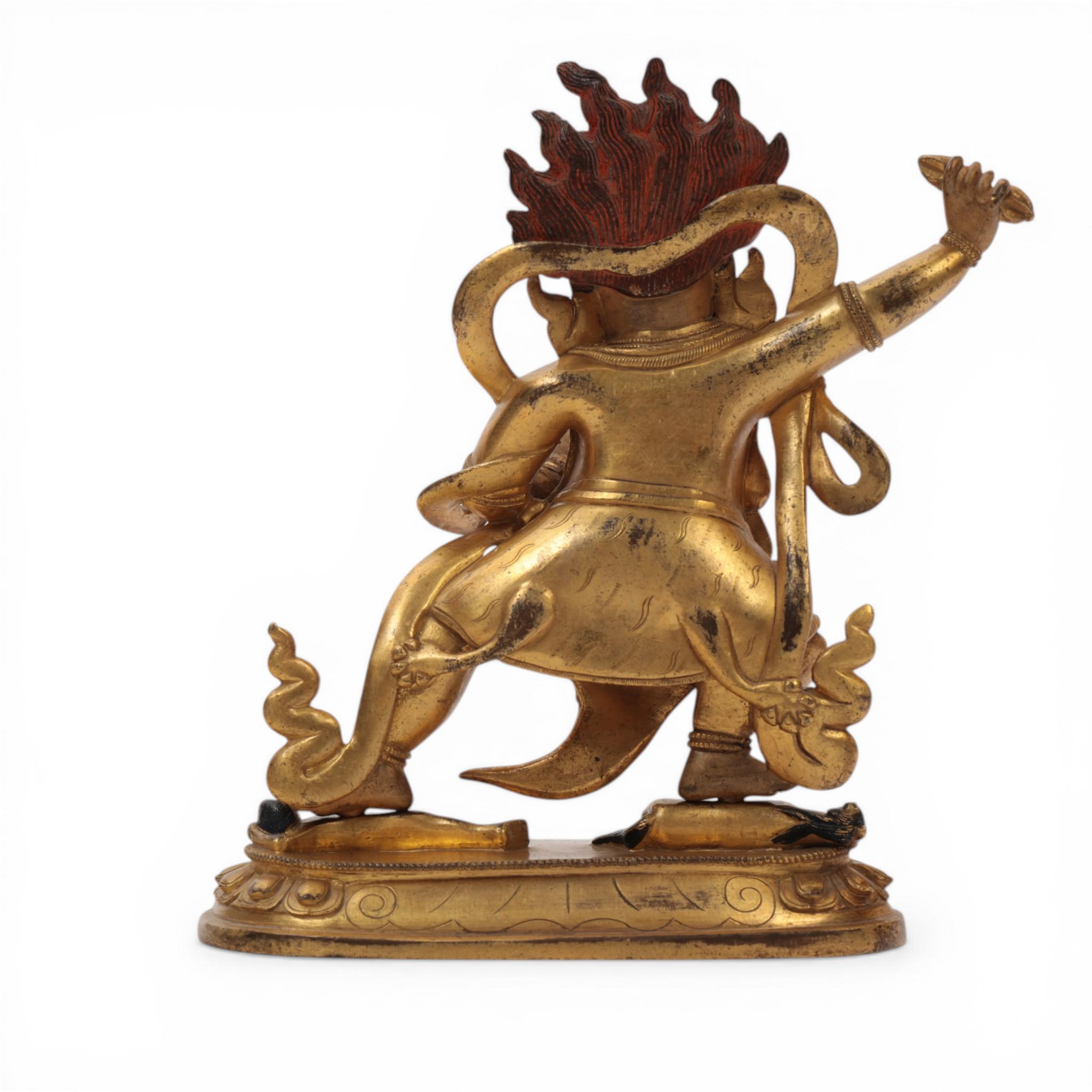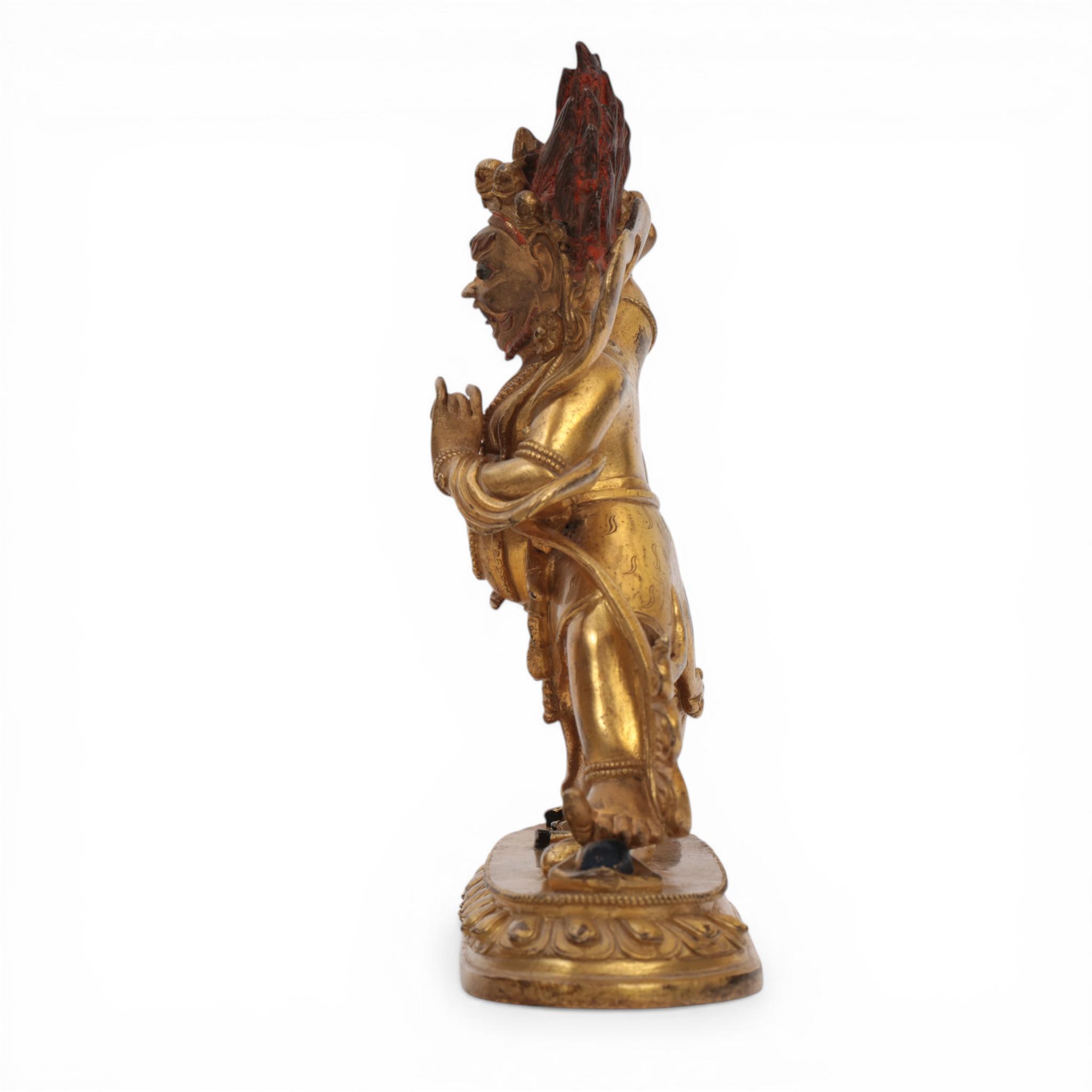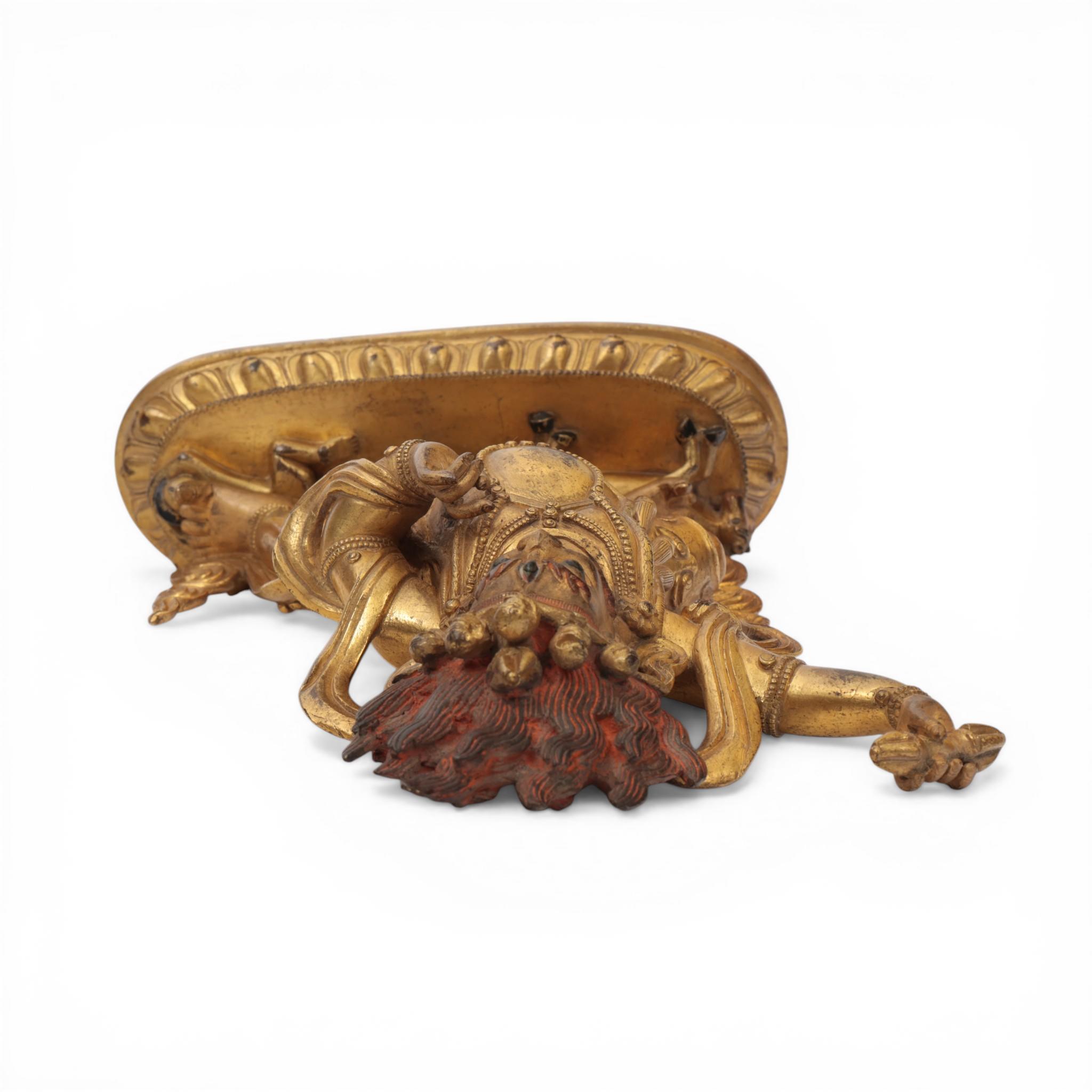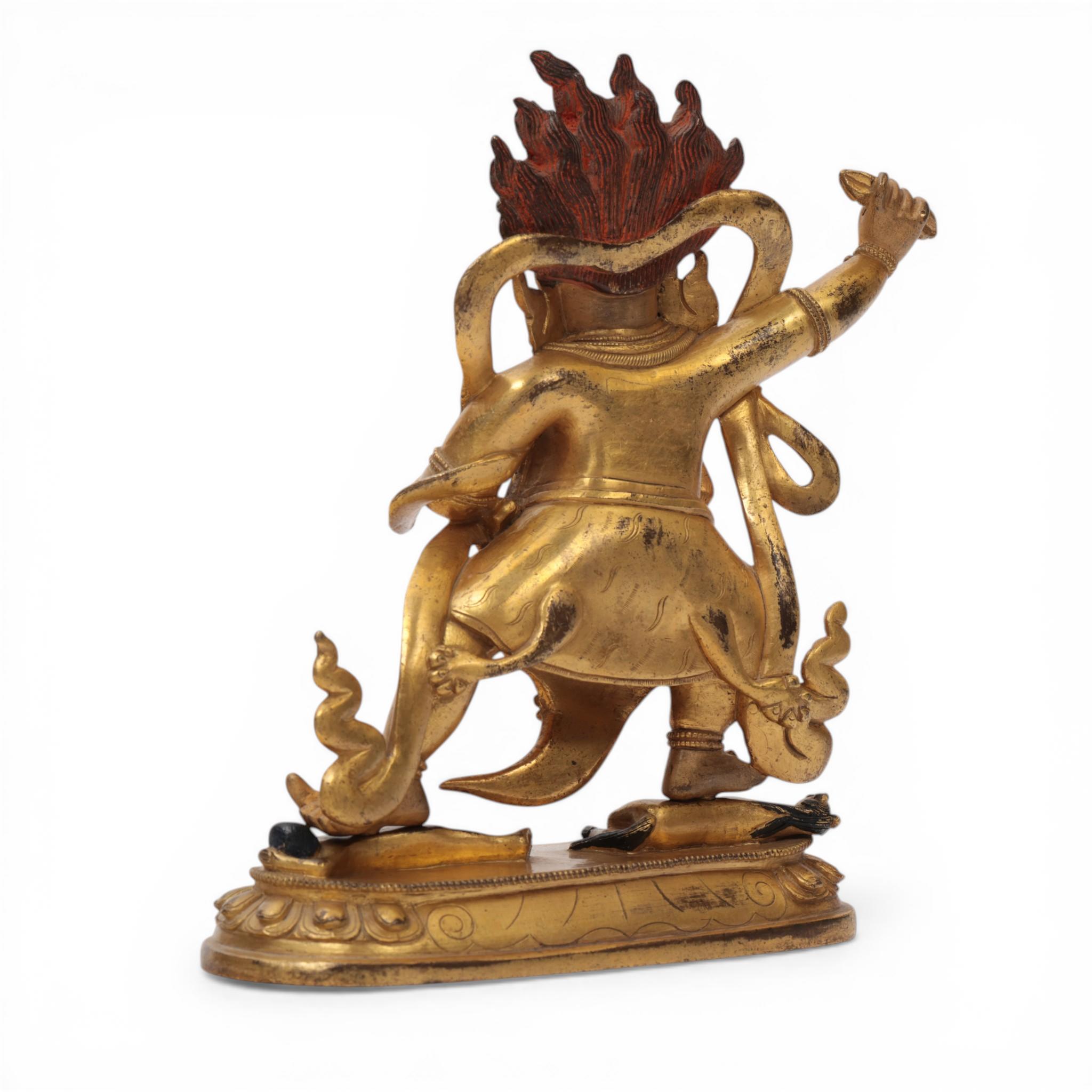 the fierce deity standing in pratyalidhasana on a horse and human figure, holding a vajra in his right hand and his left in tarjanimudra, wearing a tiger skin and elaborate jewellery, the face with wrathful expression and cold-gilt, the headdress with five skulls before a vajra and his flaming hair with red pigments