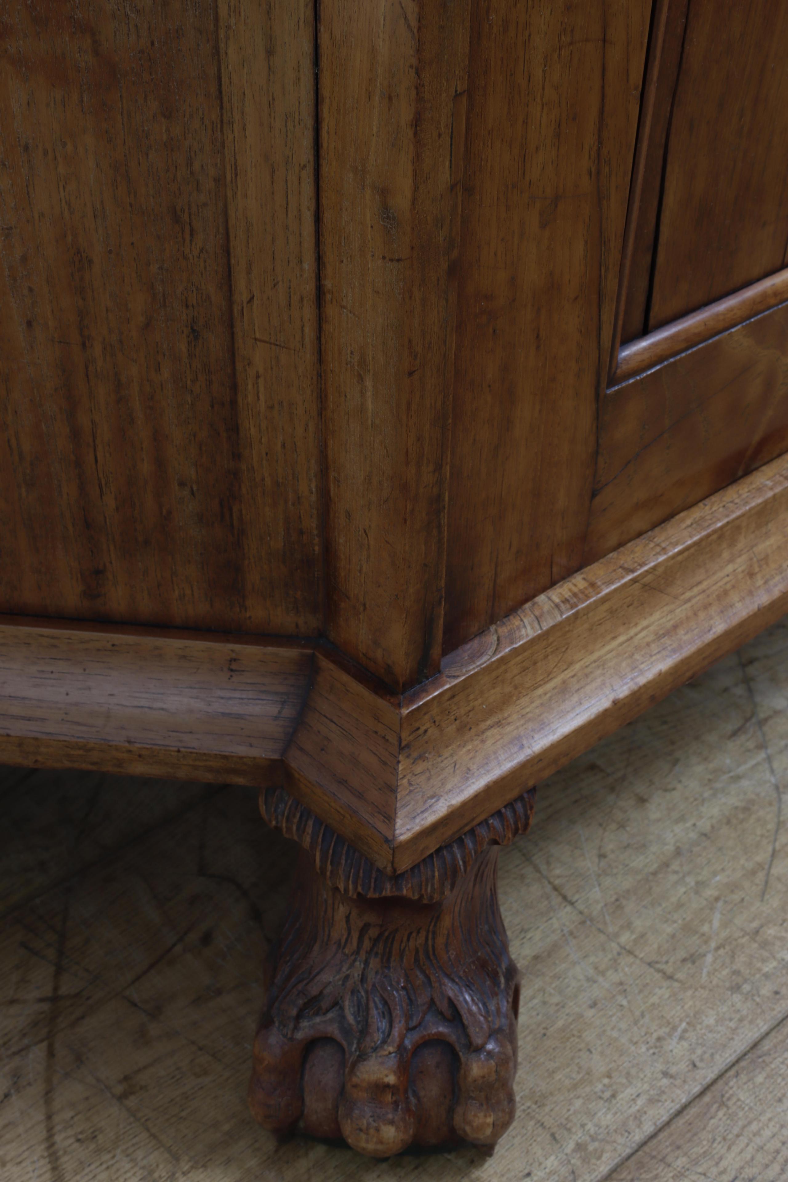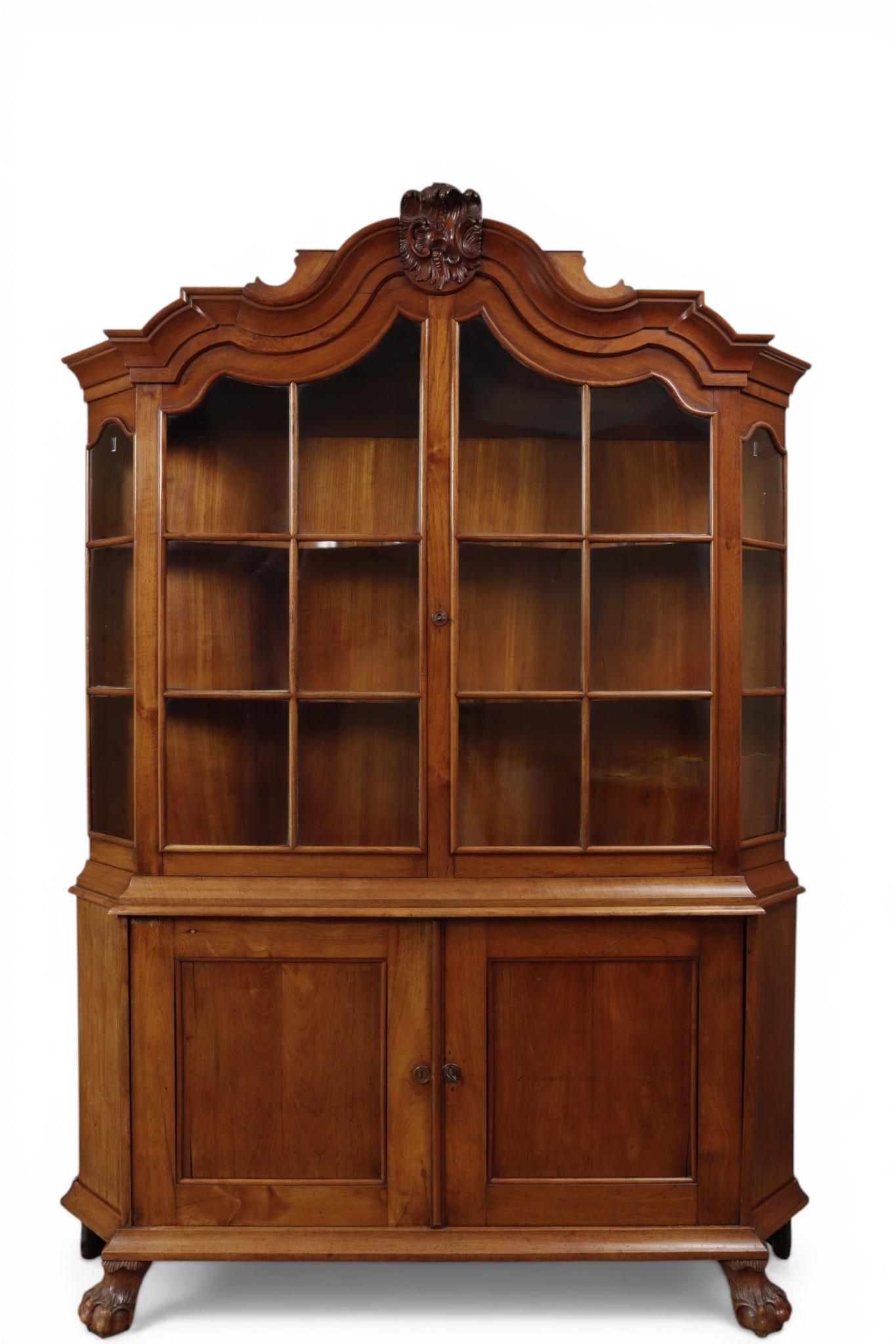 De gebogen kap met snijstuk, waaronder twee deuren met ruiten in vakwerk. De onderkast met twee deuren. Op balklauwpoten