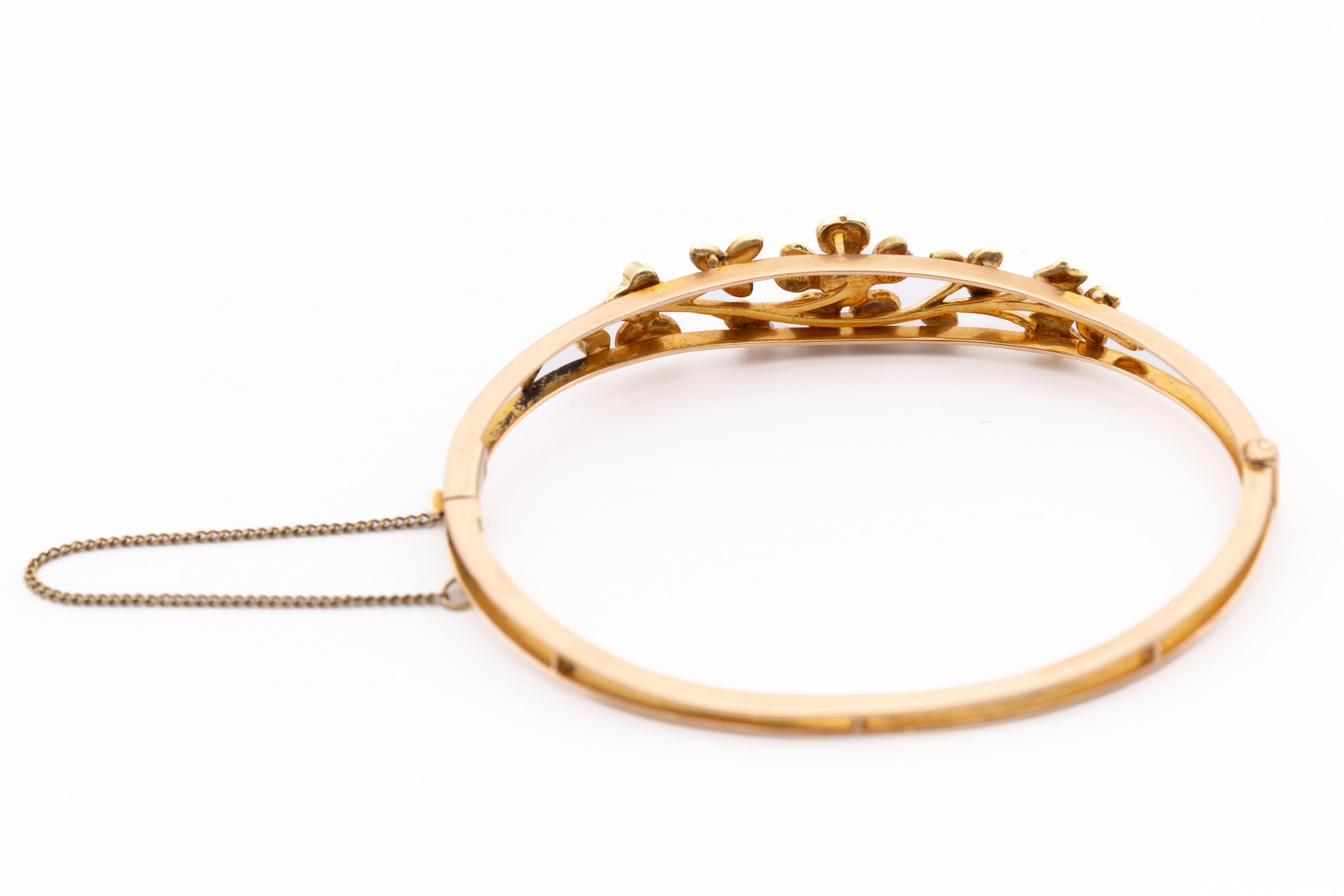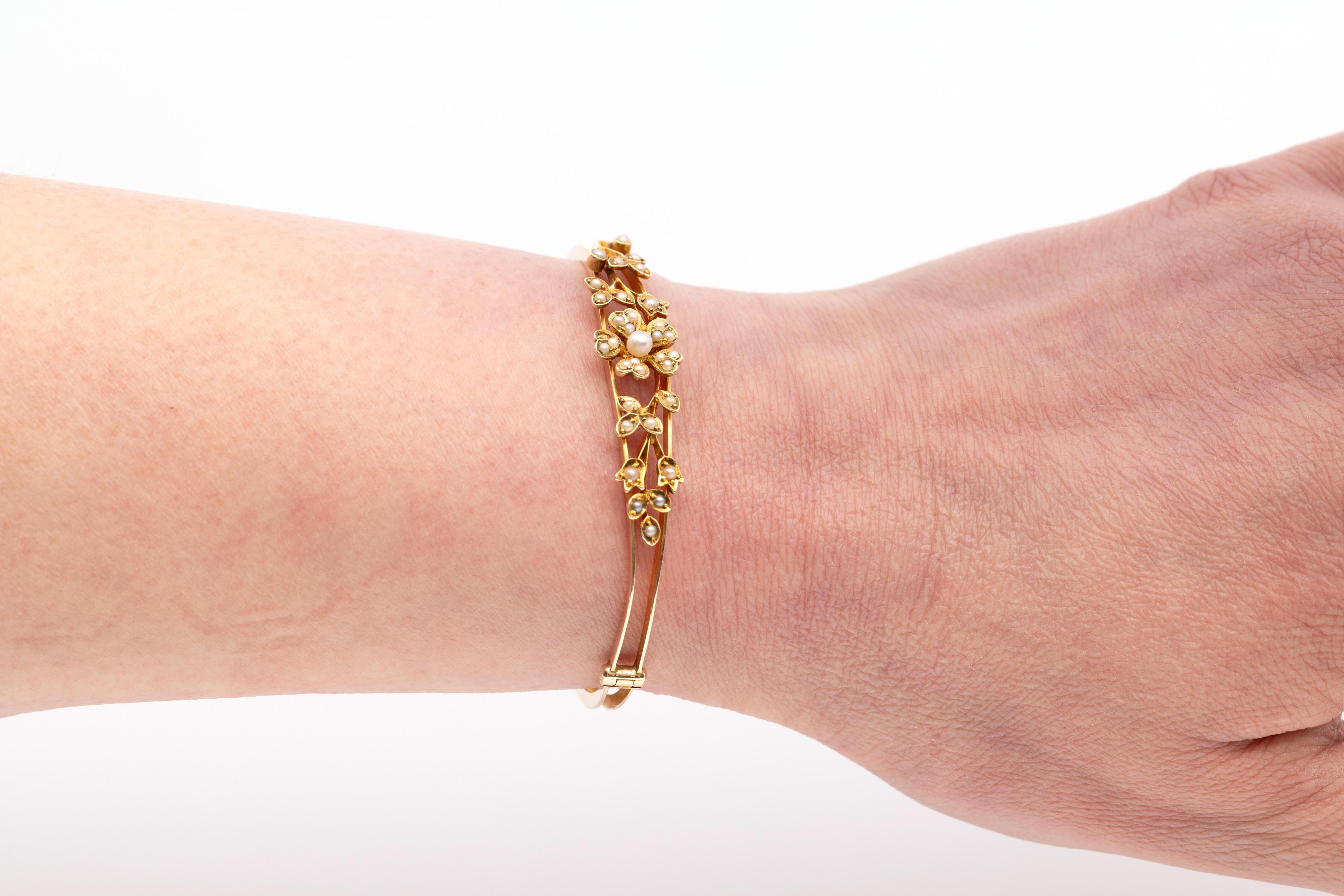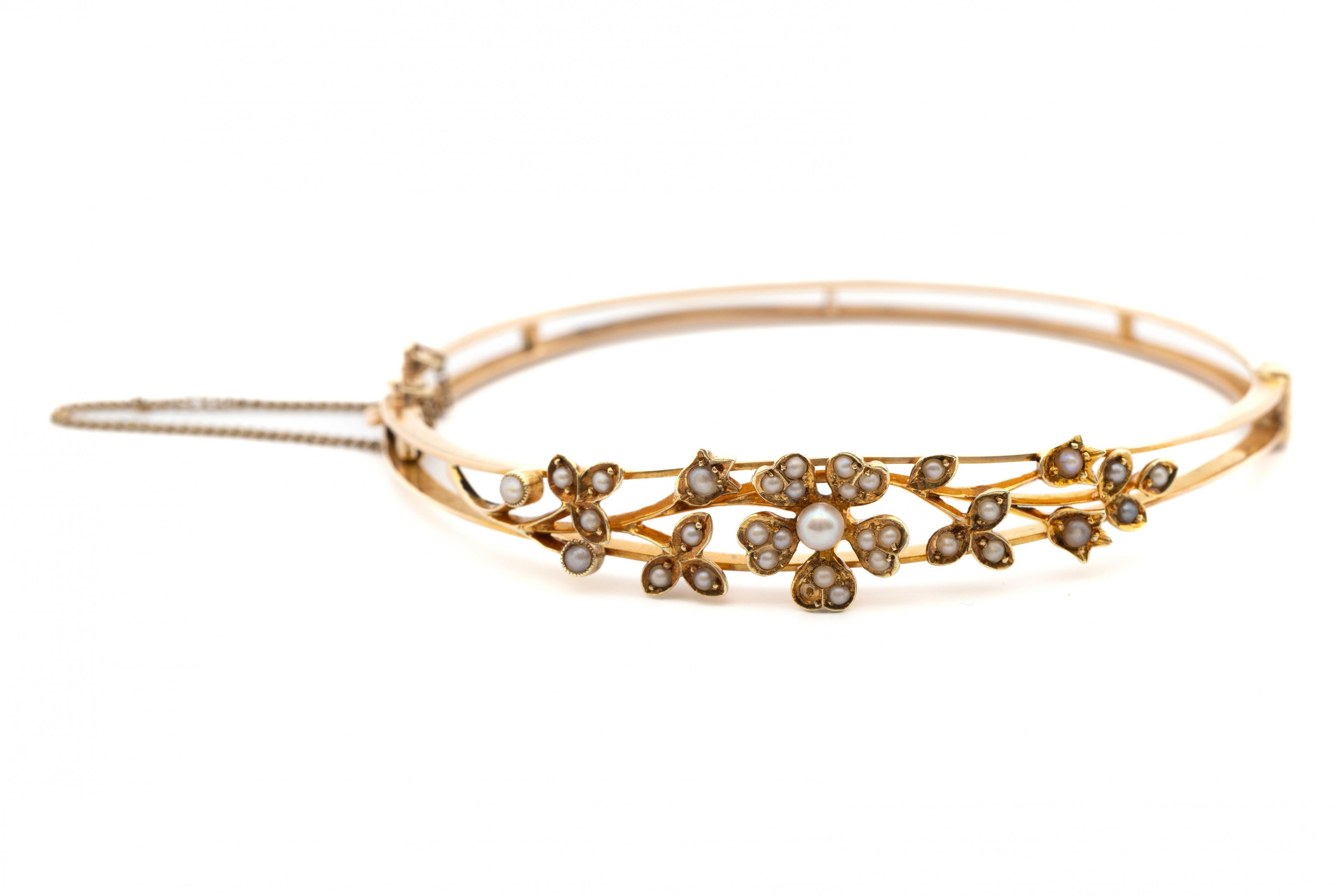 in an openwork design with leafs and a flower on top, set with split pearls. In a blue textured box