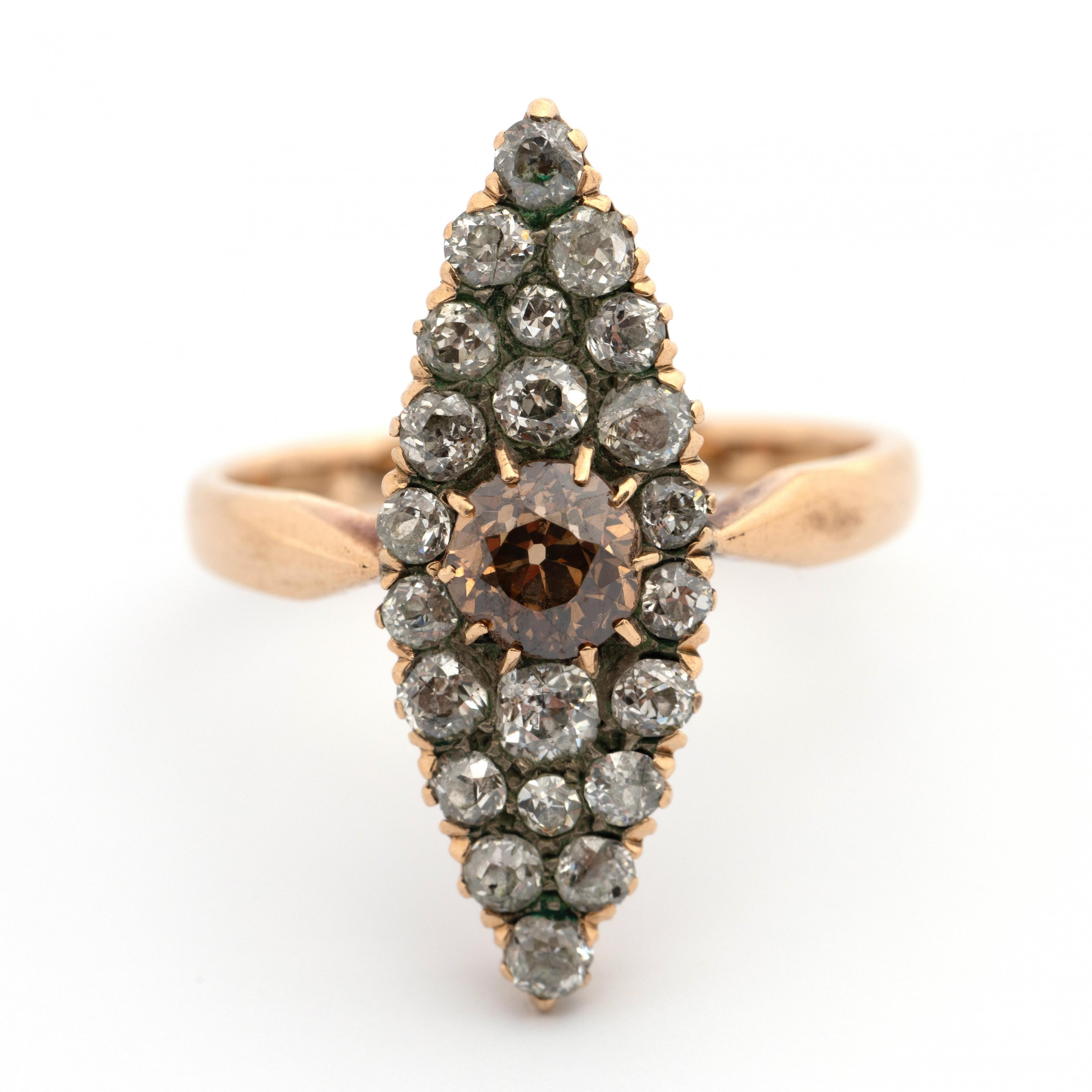 Set in the centre with a brown old brillinat cut diamond of approx. 0.50 ct. The top further more pavé set with smaller white old brilliant cut diamonds. The total diamond weight approx. 1.00 ct.