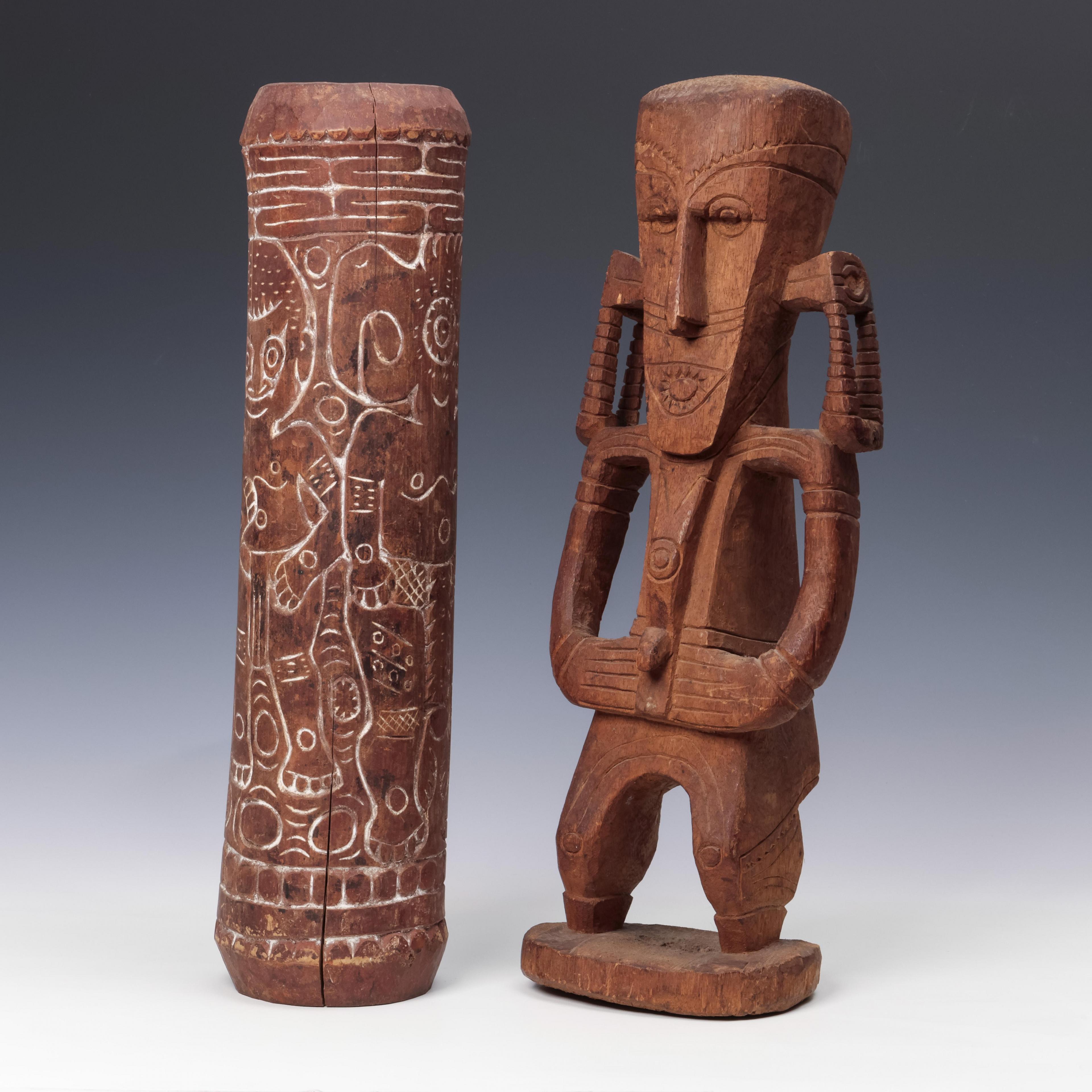 P.N. Guinea, Astrolabe Bay, a wooden figure and a carved bamboo horn,