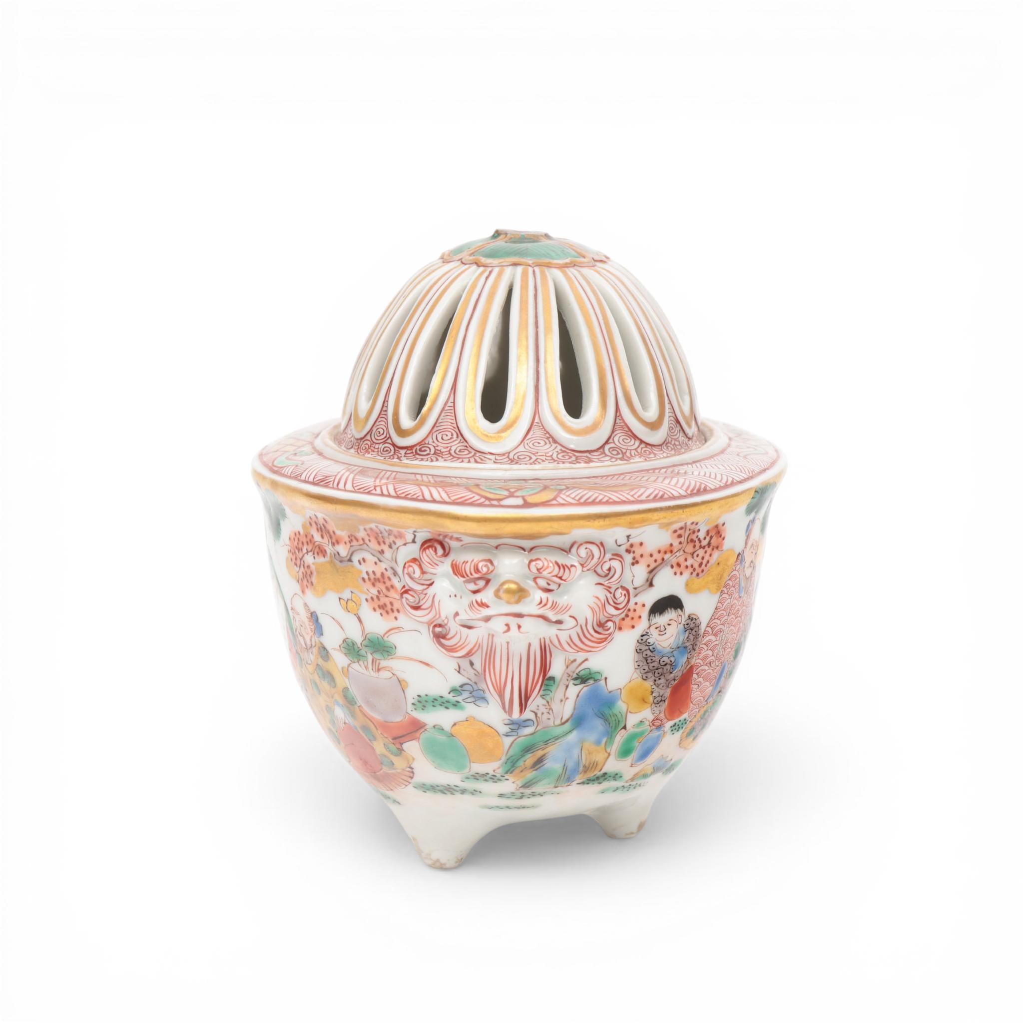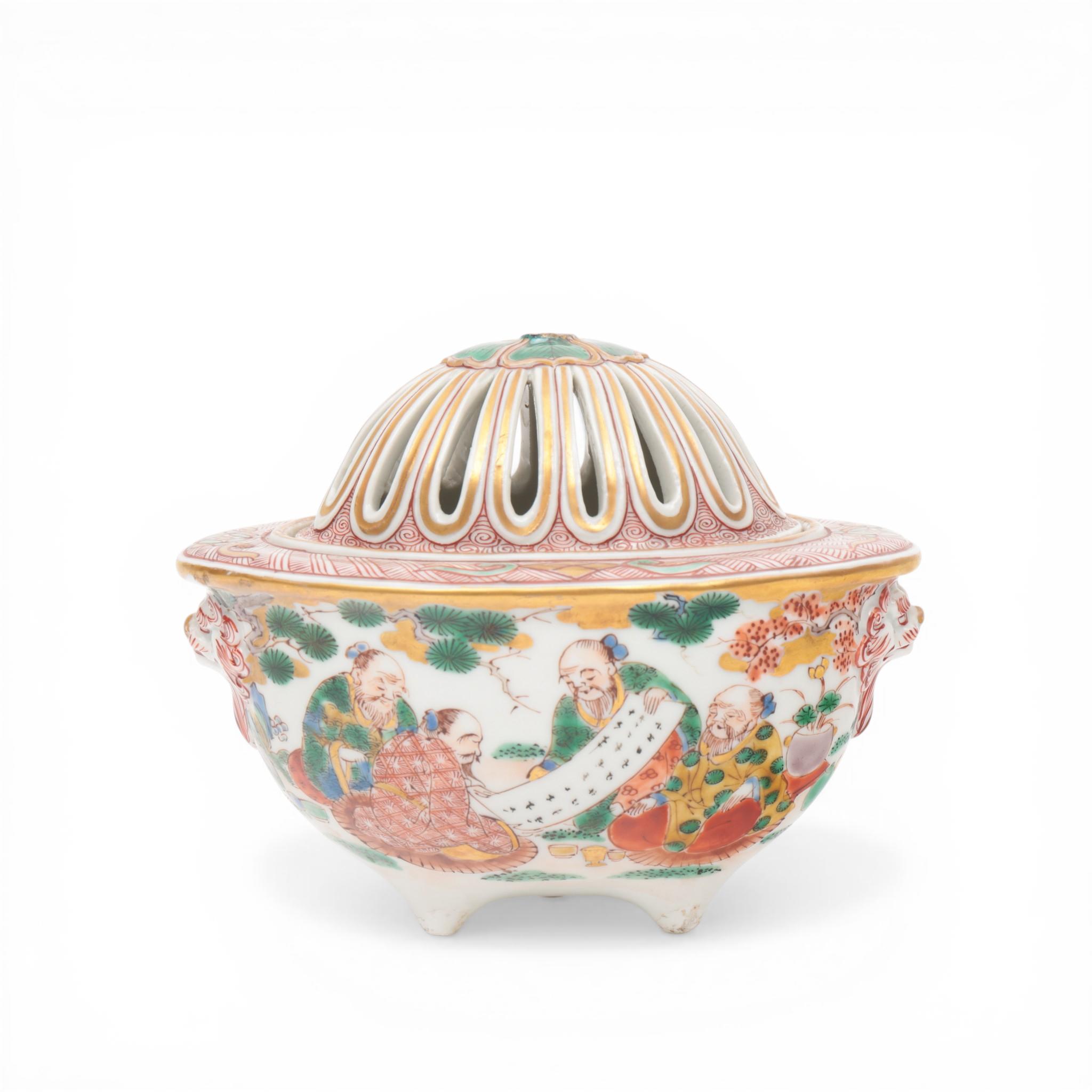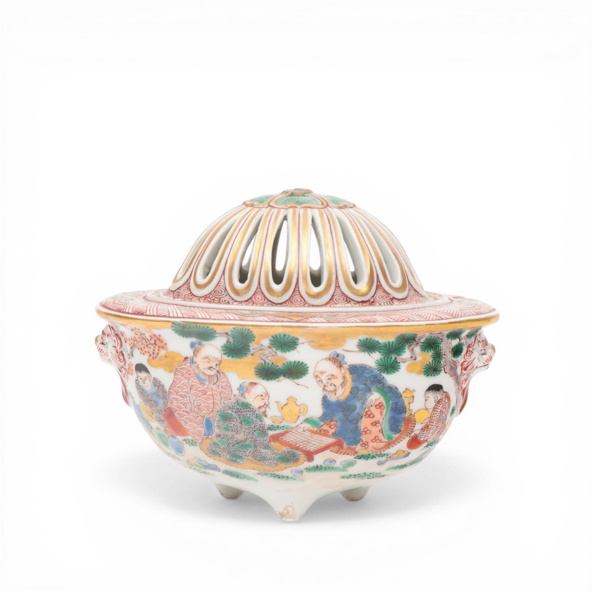 on tripod feet and the sides painted with scholars playing go and admiring a scroll, the domed cover openworked (final broken away)