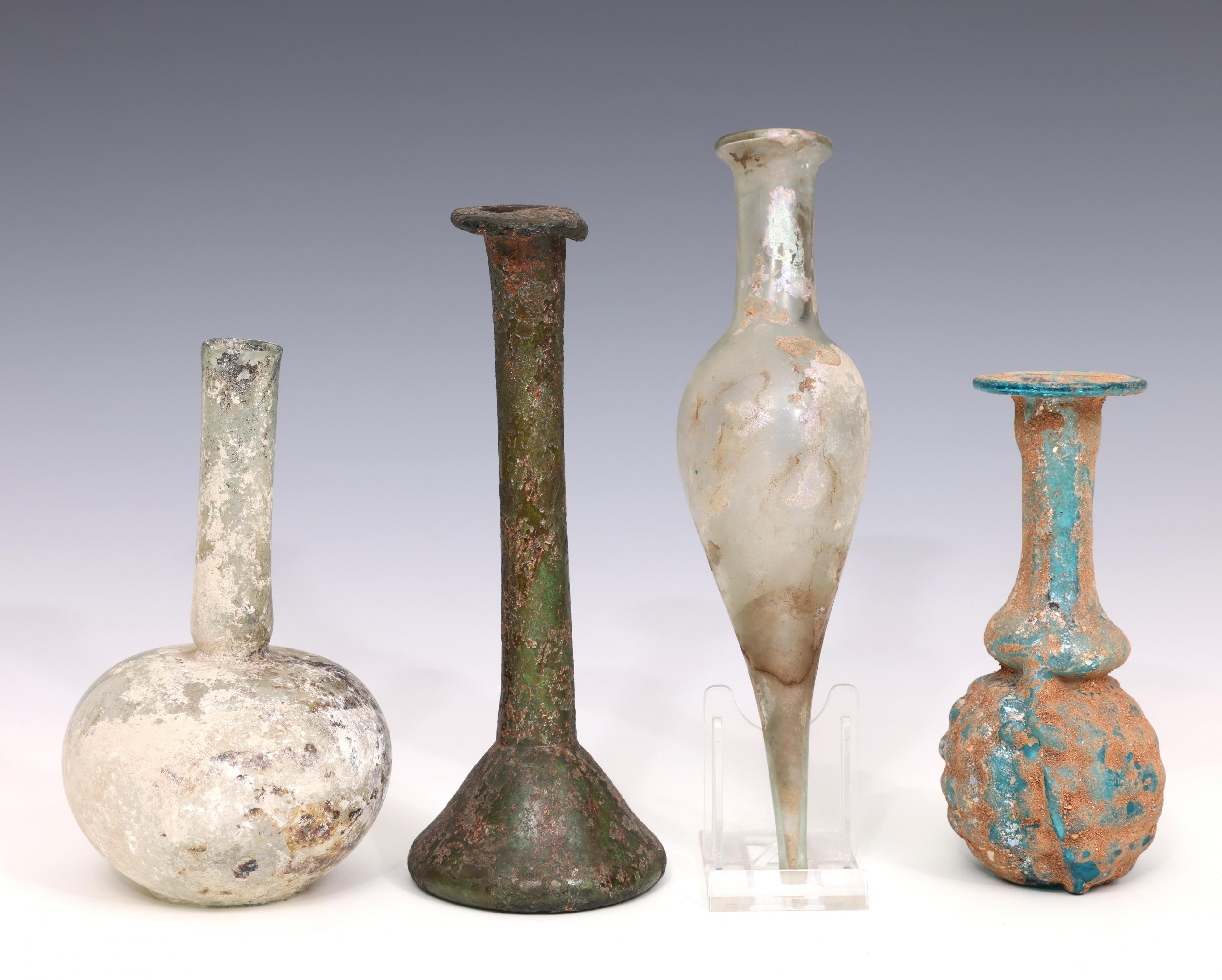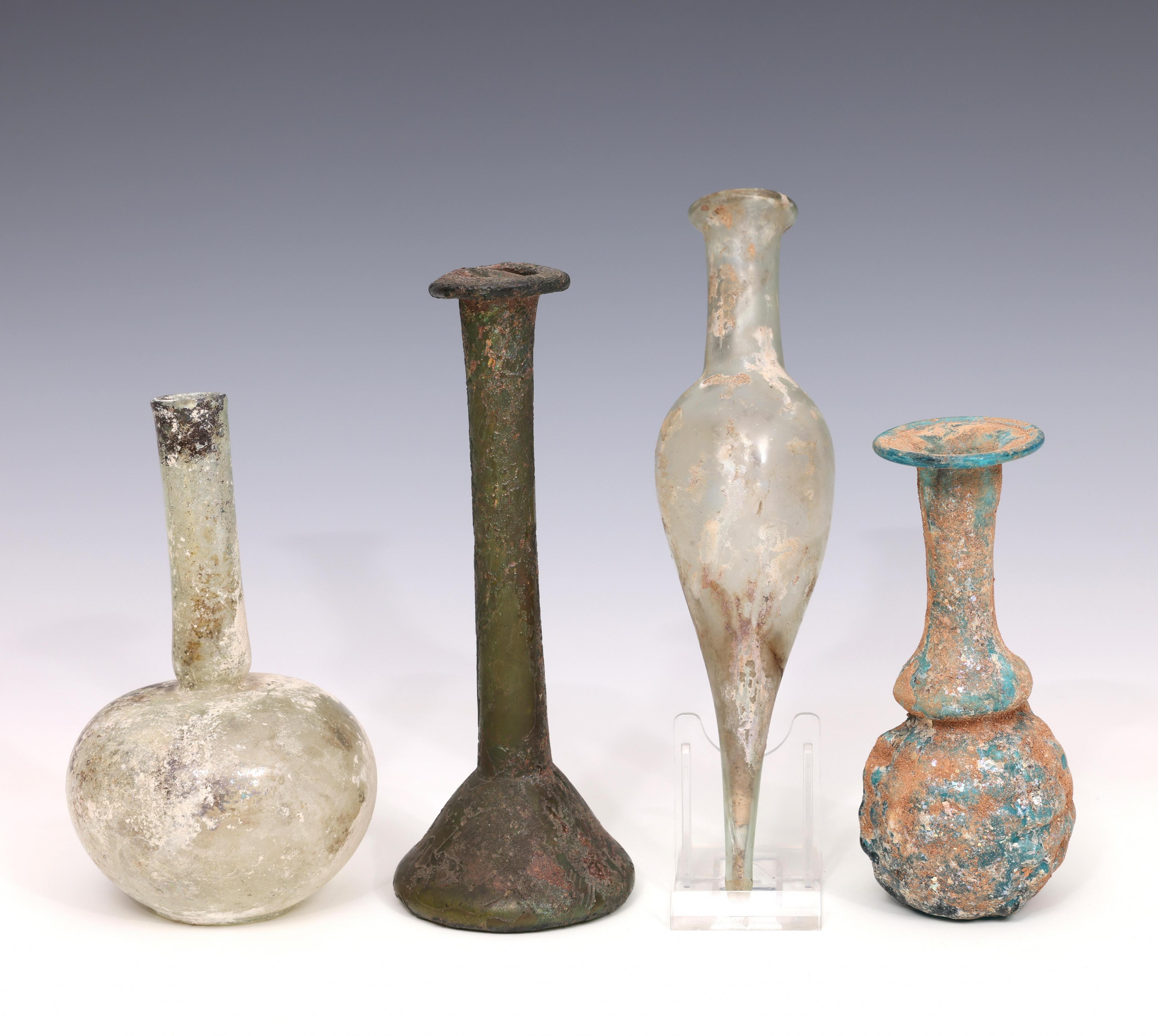 one blue glass flask with bulbus boddy decorated with glass lumbs