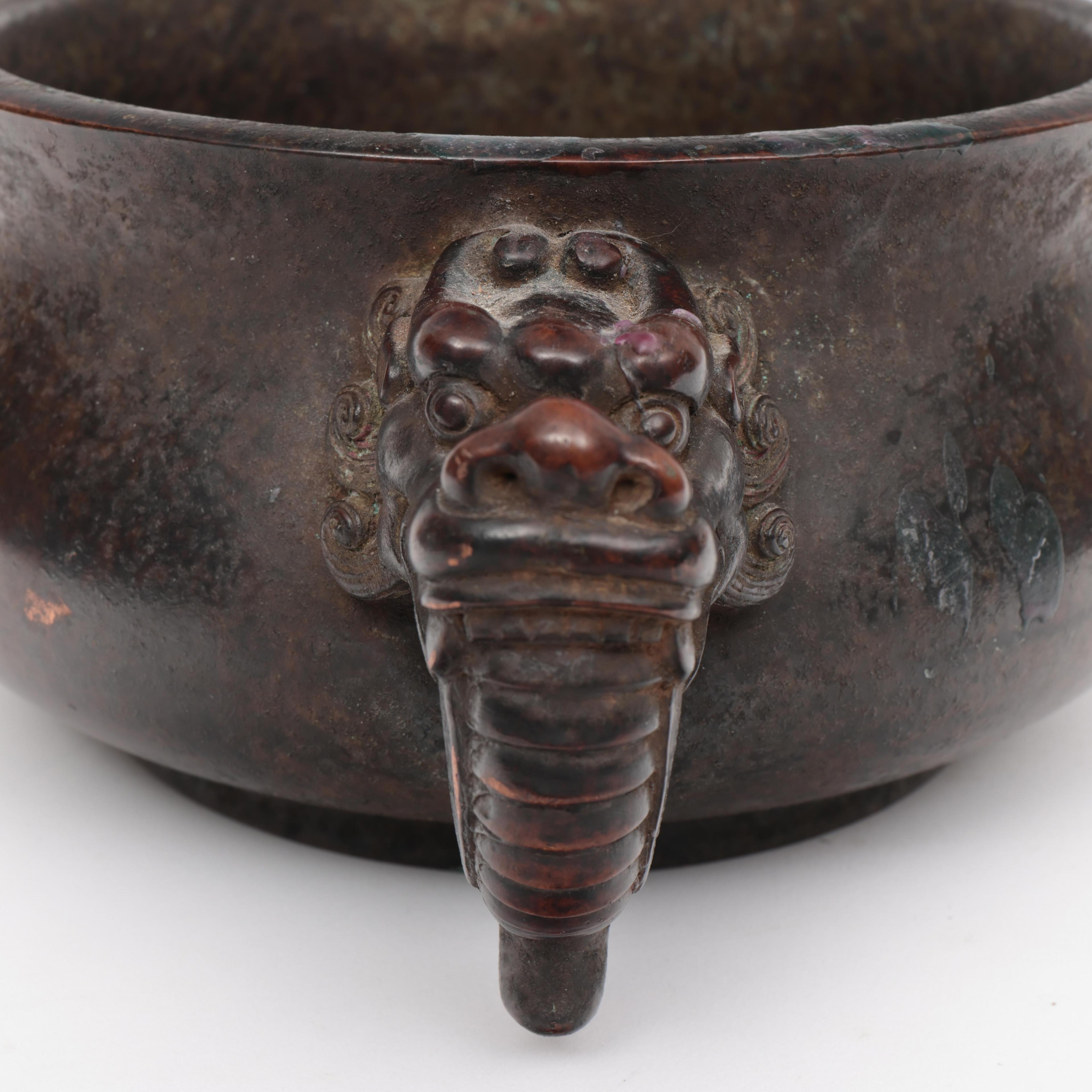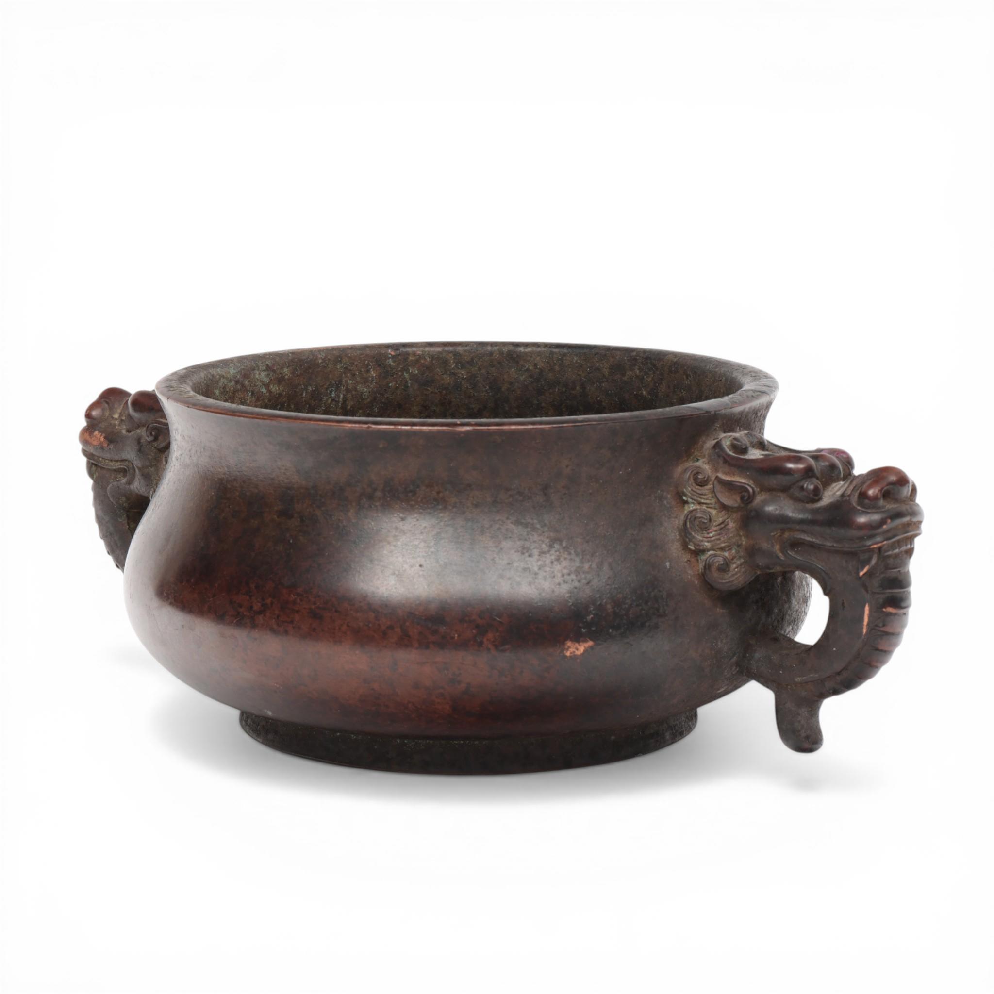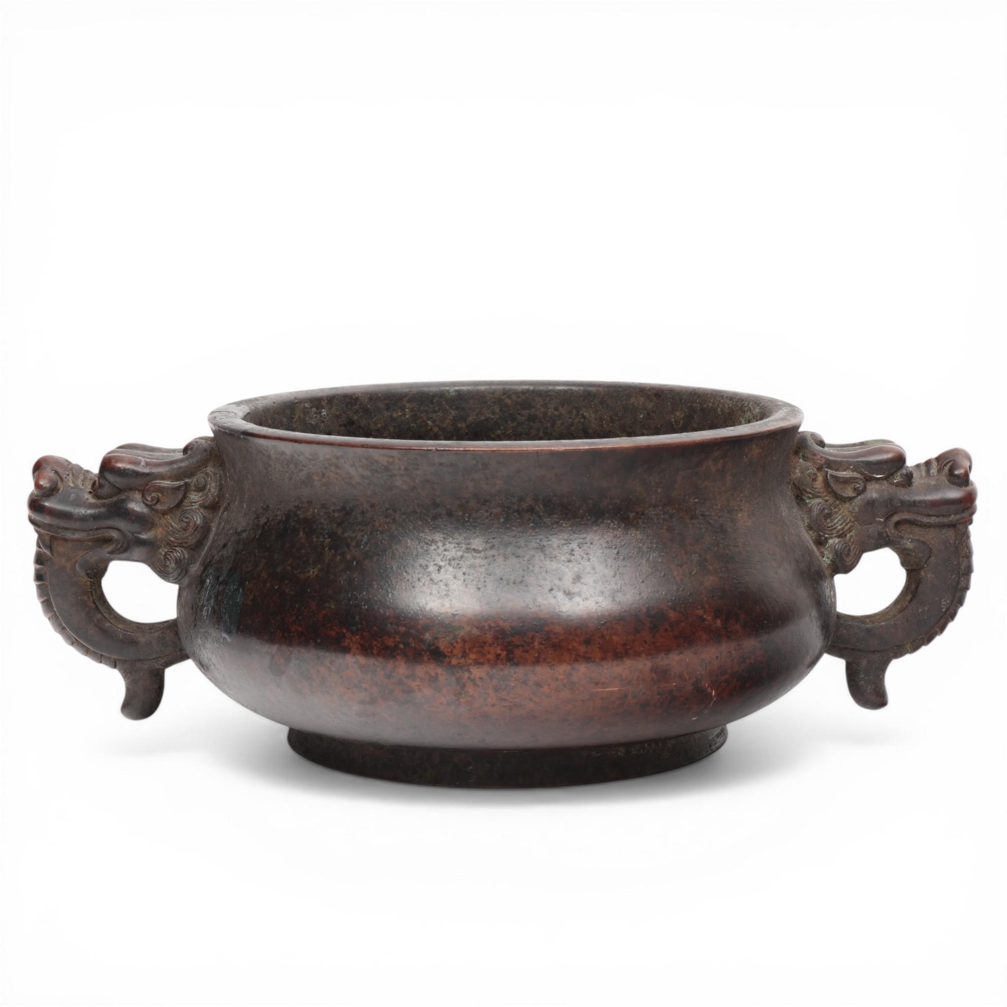 heavily cast, the rounded compressed sides with two dragon-head handles, the base with a ten-character mark in a recessed rectangle