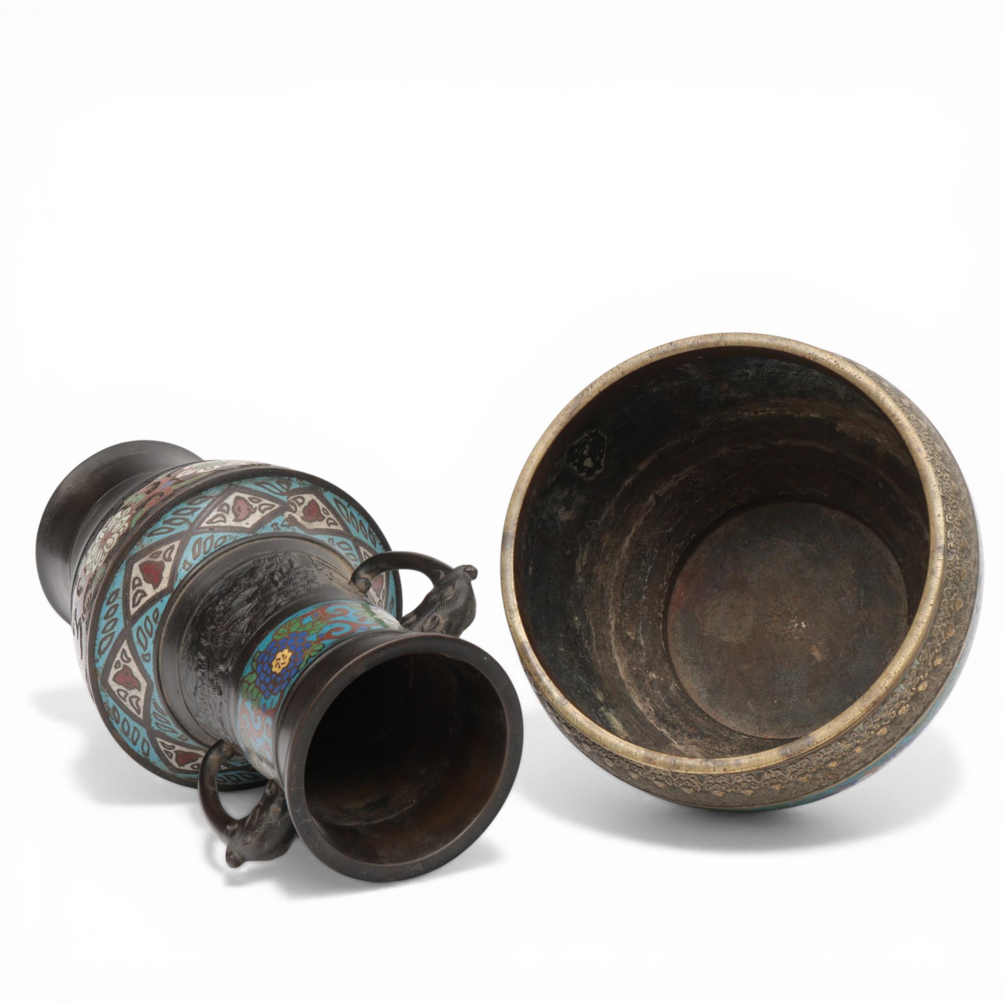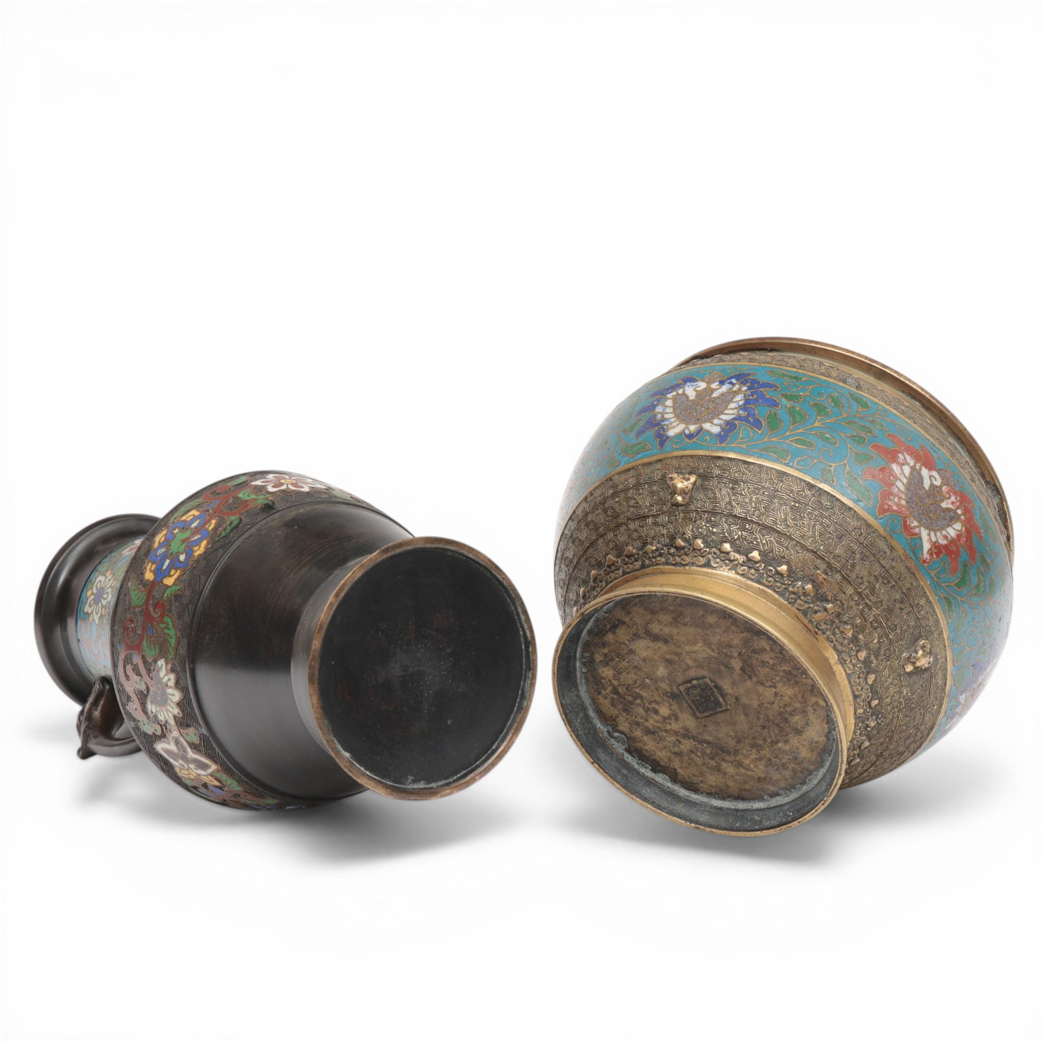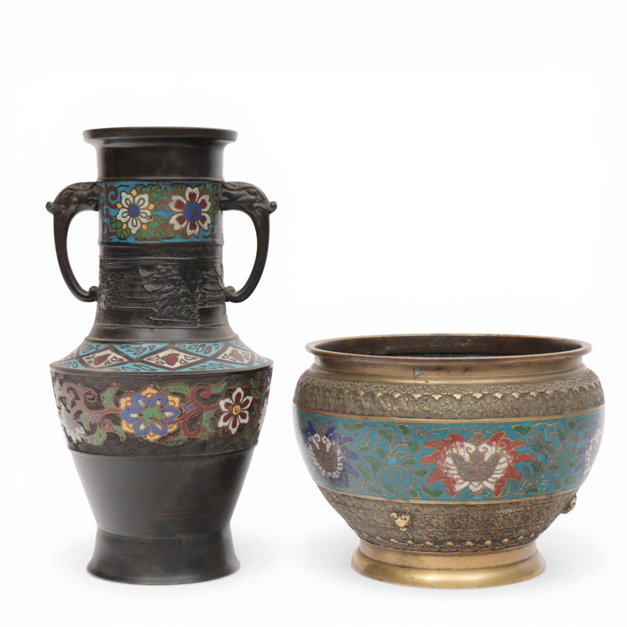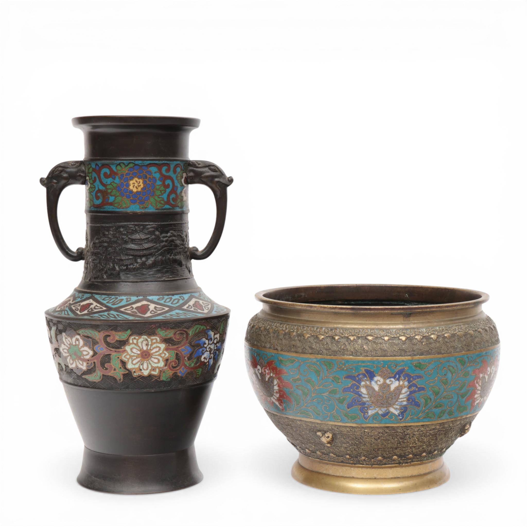 one a vase with two mask handles and the other a bowl decorated with a band of lotus scroll