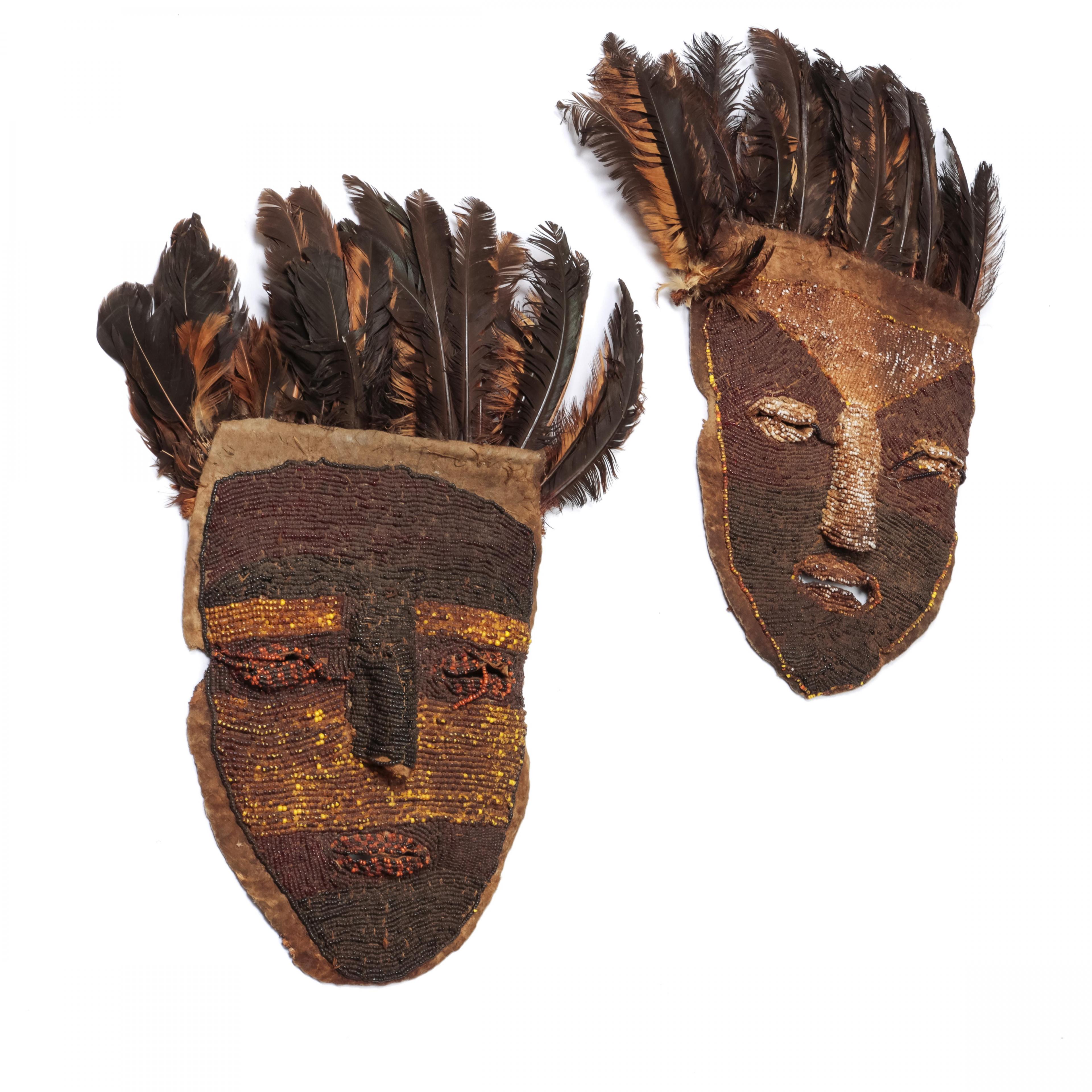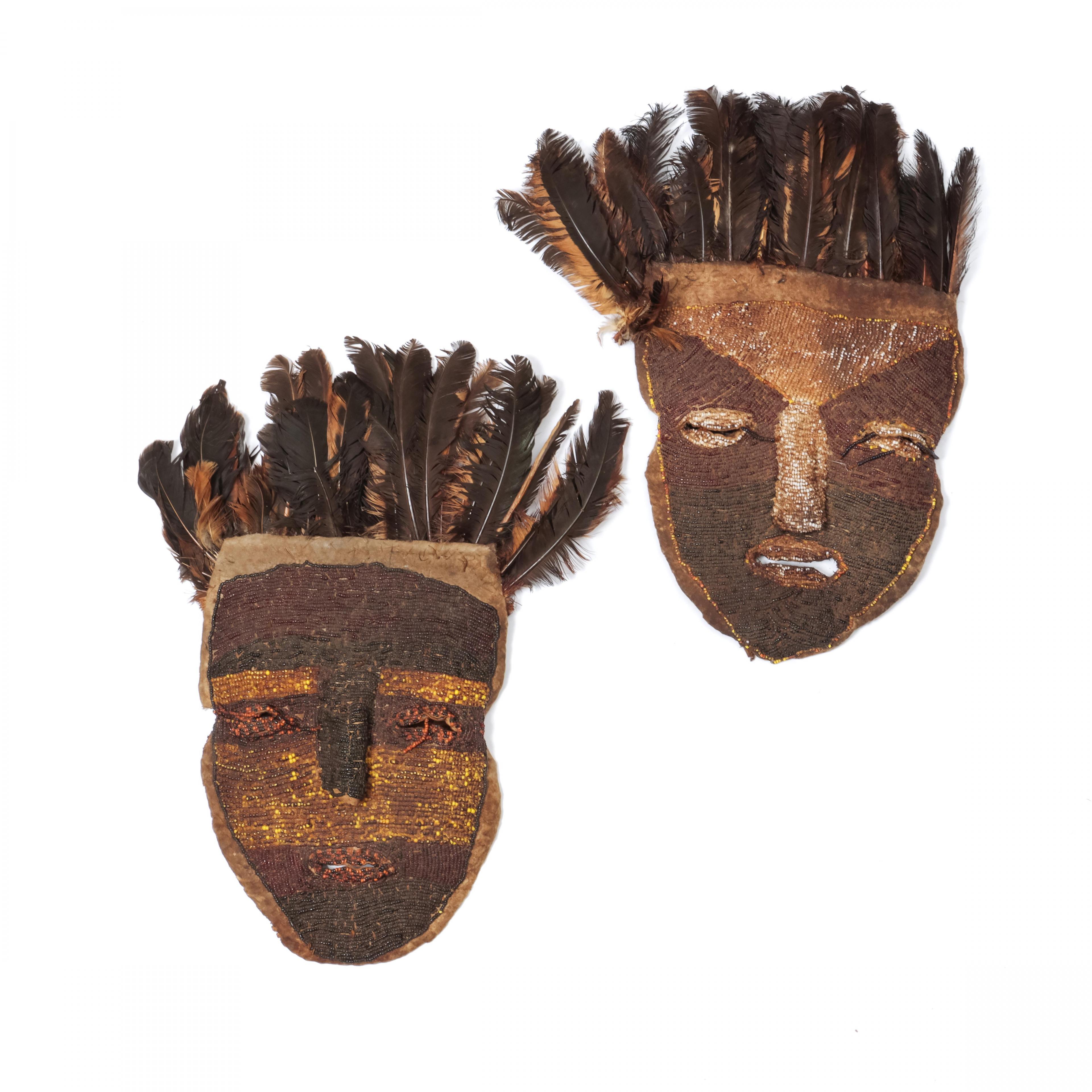 D.R. Congo, Tabwa, two beaded masks with feathers.