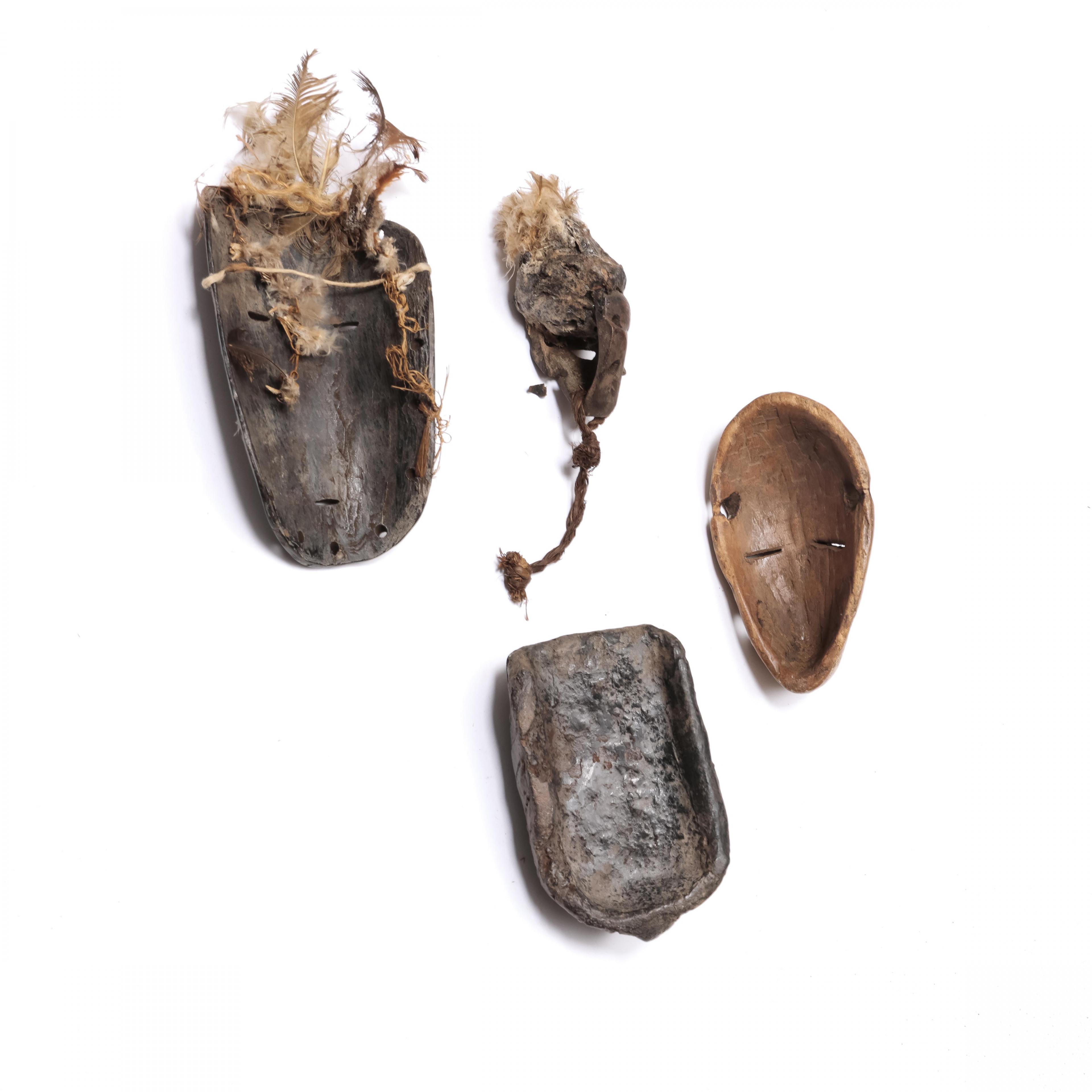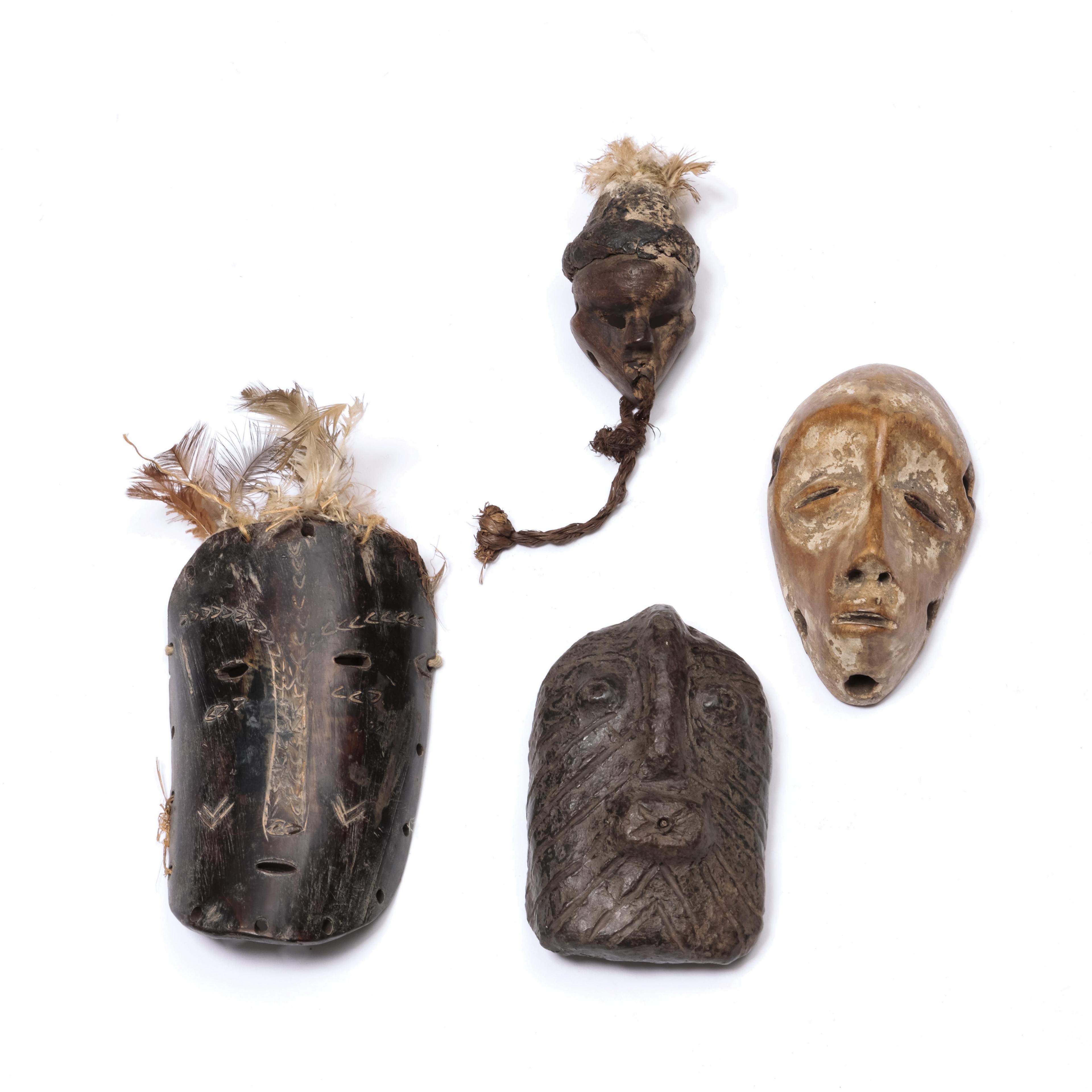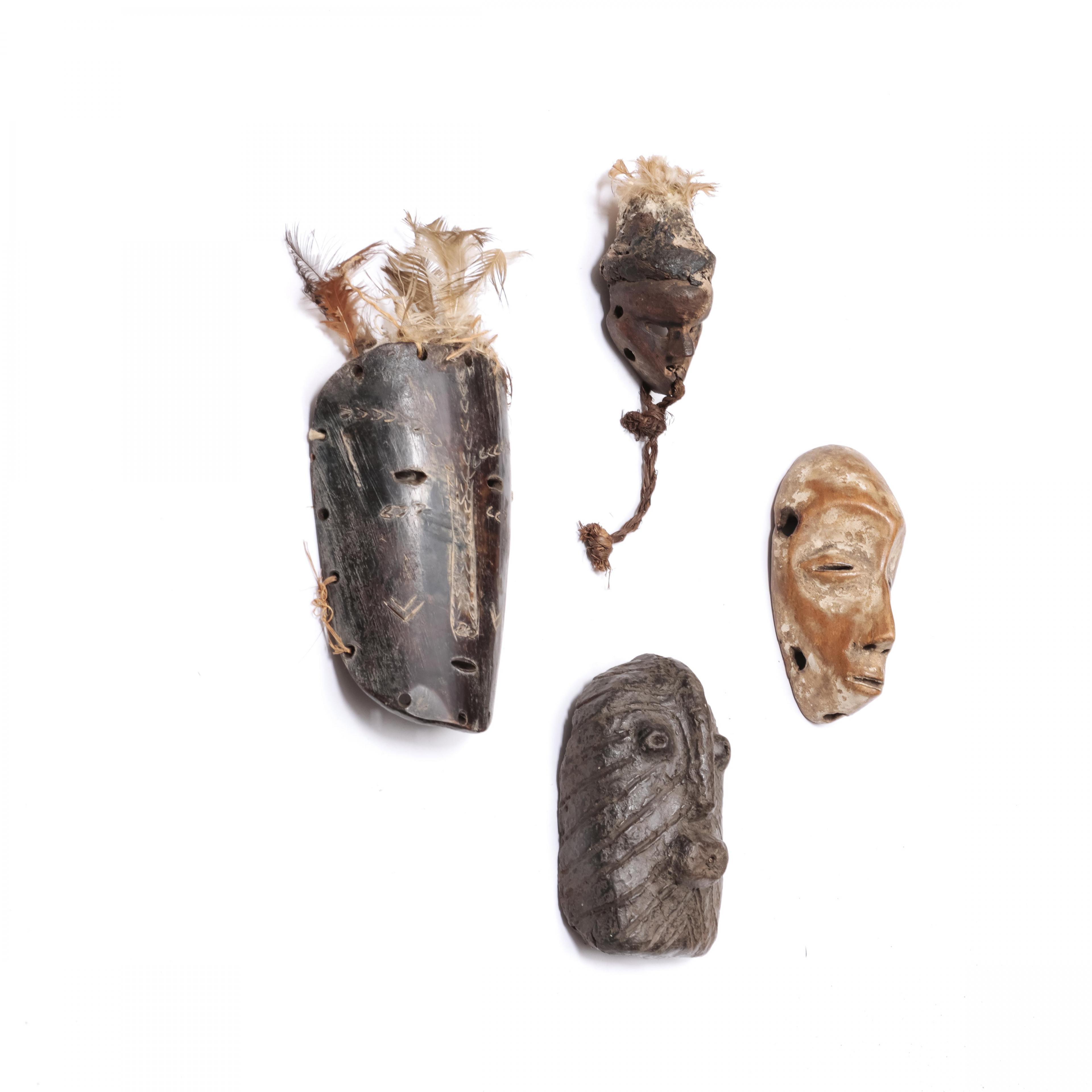 D.R. Congo, a Lega, miniature wooden mask, a Luba, terracotta mask, a Congo horn mask and Salampasu, a miniature mask.