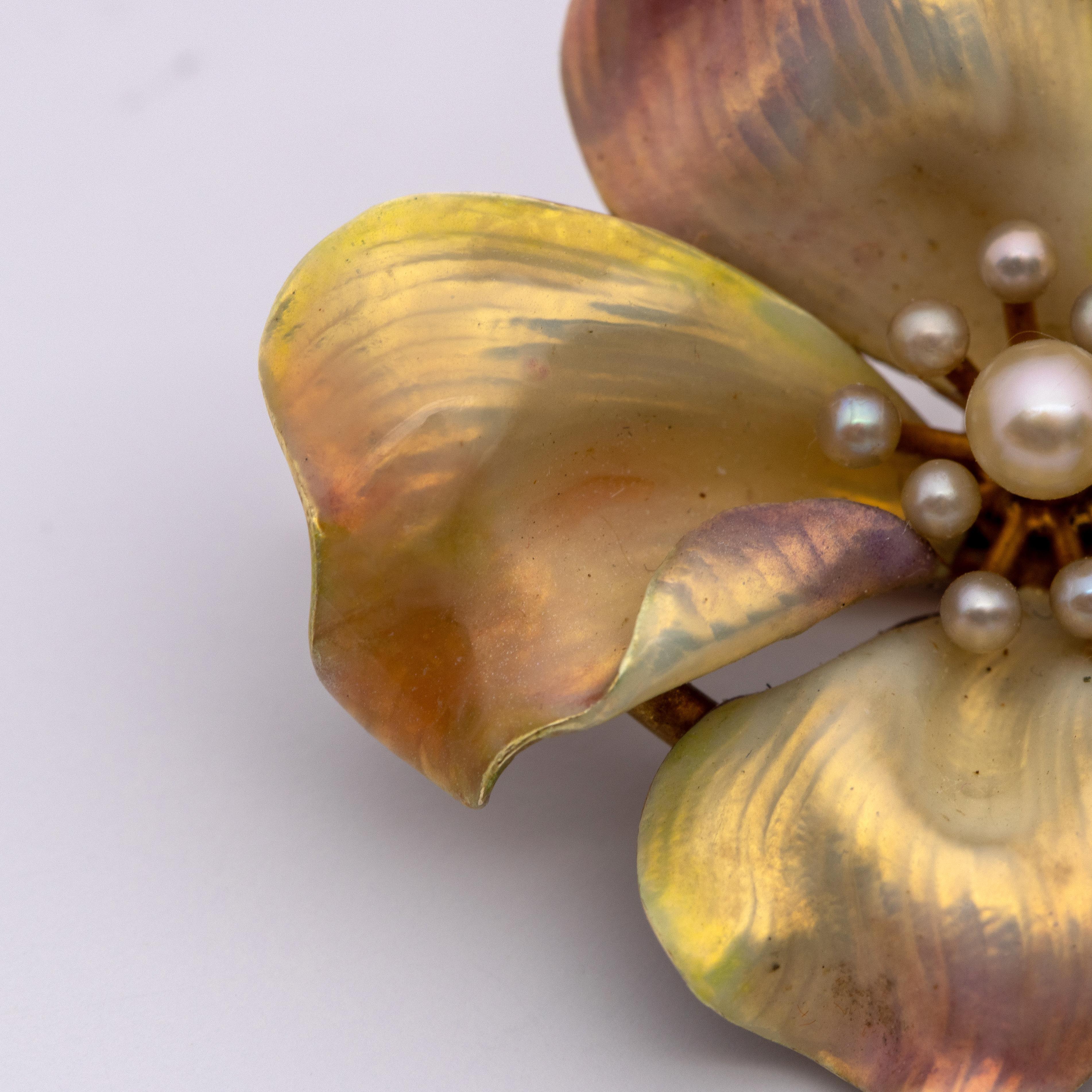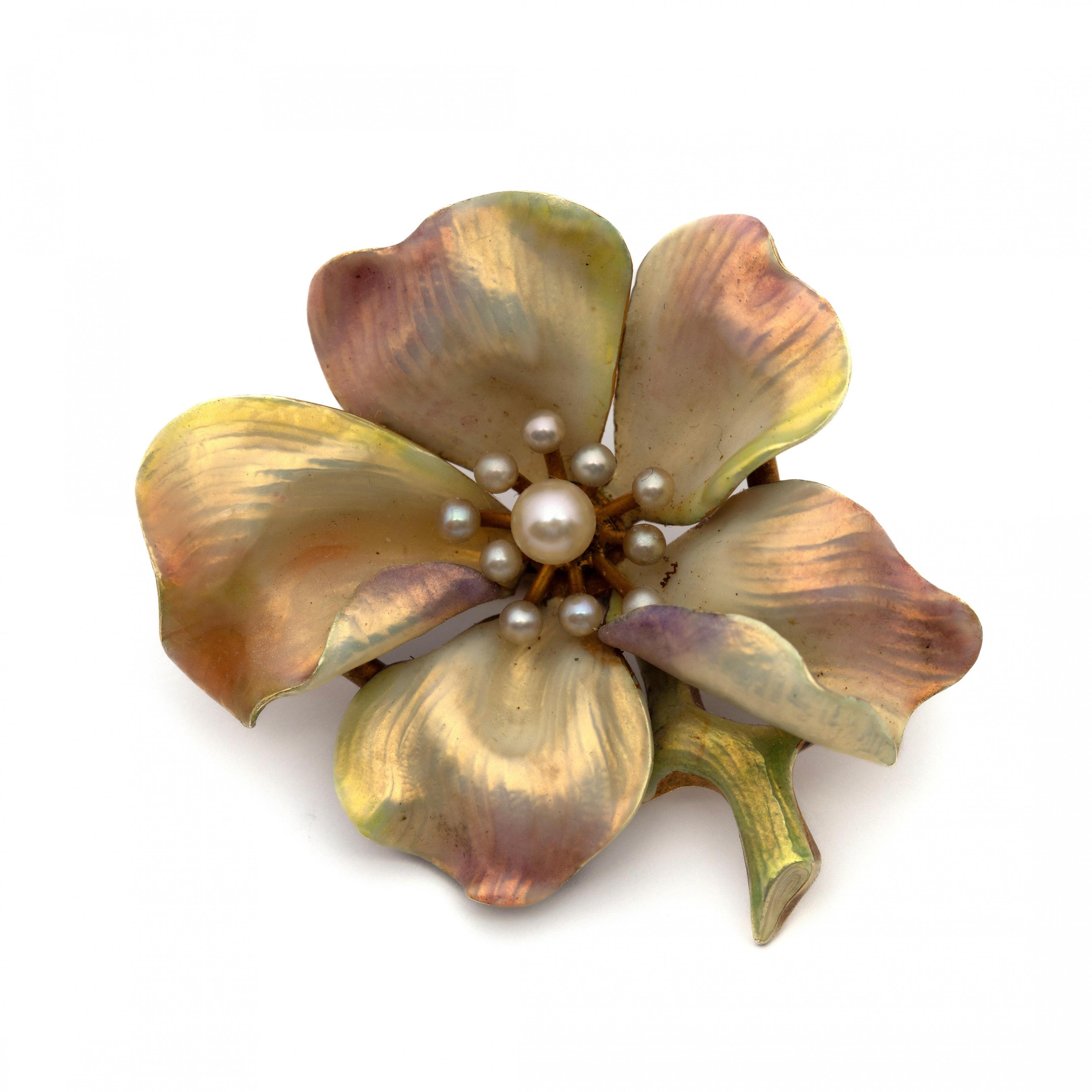 Depicting a dogwood flower with iridescent enameled petals and set with small white pearls. The c-shaped clasp with hallmark Whiteside & Blank, Newark, New York.