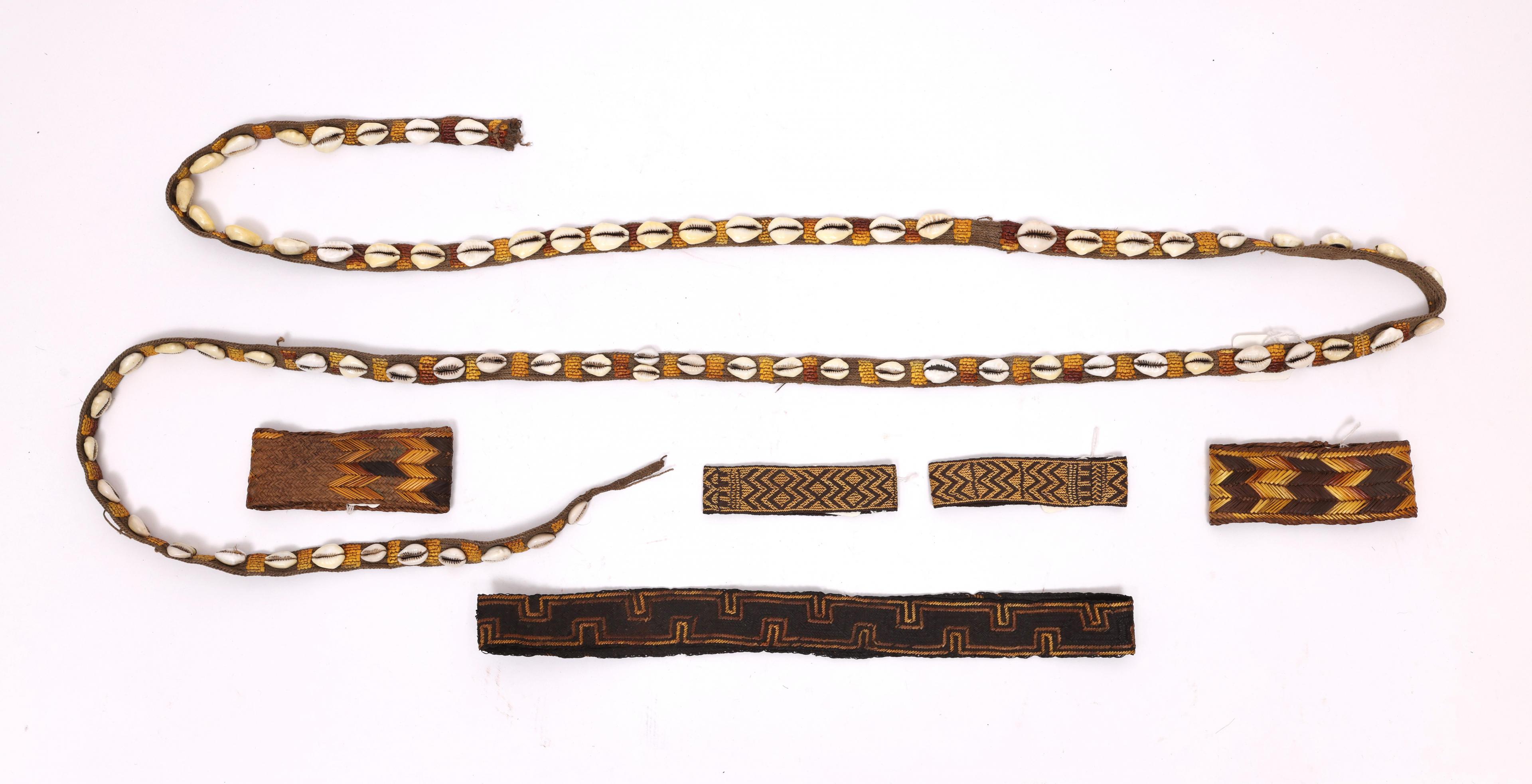 P.N. Guinea, Highlands, a collection of five braided plant fiber bands and a plant fiber band decorated with cowry shells.