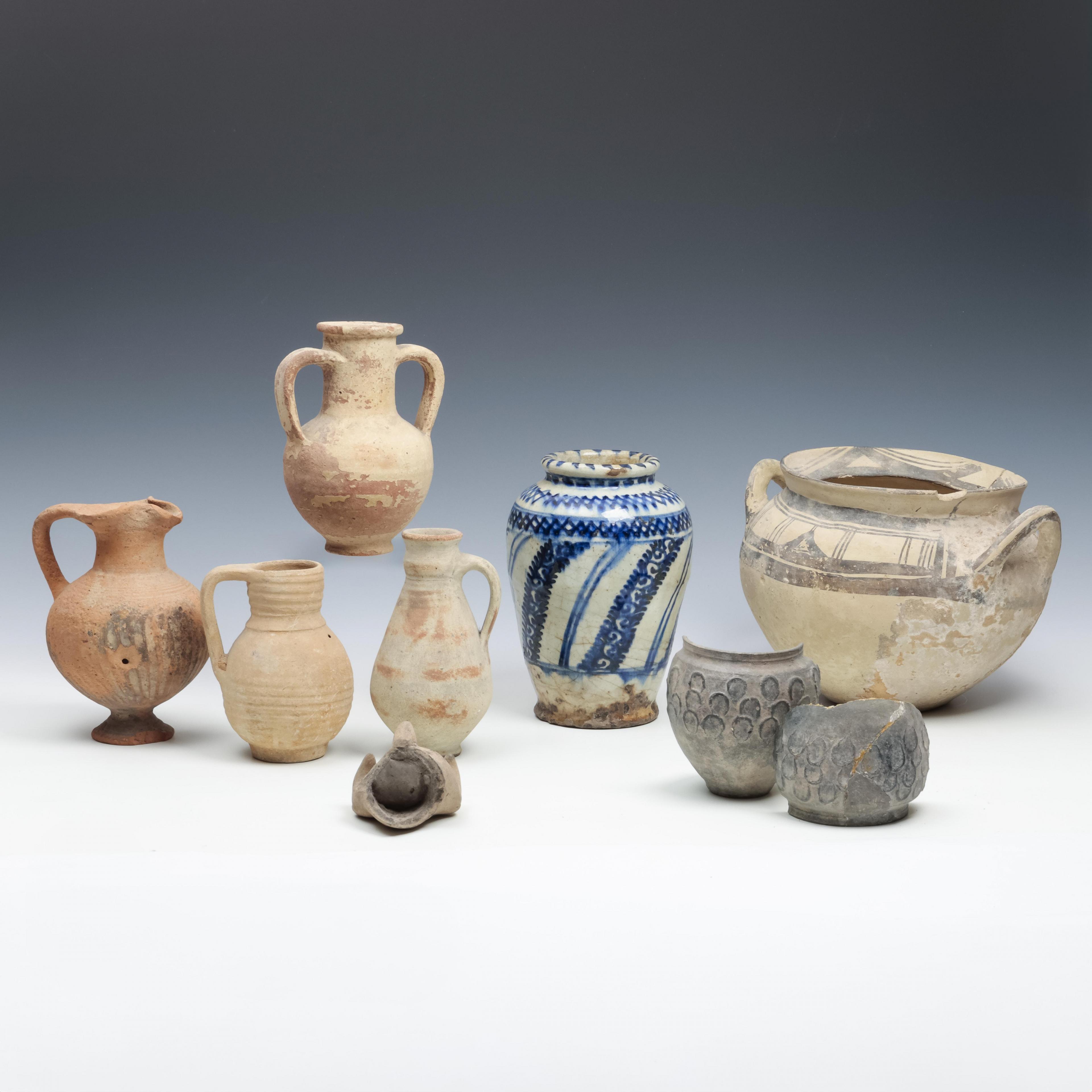 a.o. four Roman vases, ca. 2nd century, a Daunian terracotta pot (restored), a terracotta fragment of a statue and a Persian vase, 19th century (with damages and restorations)