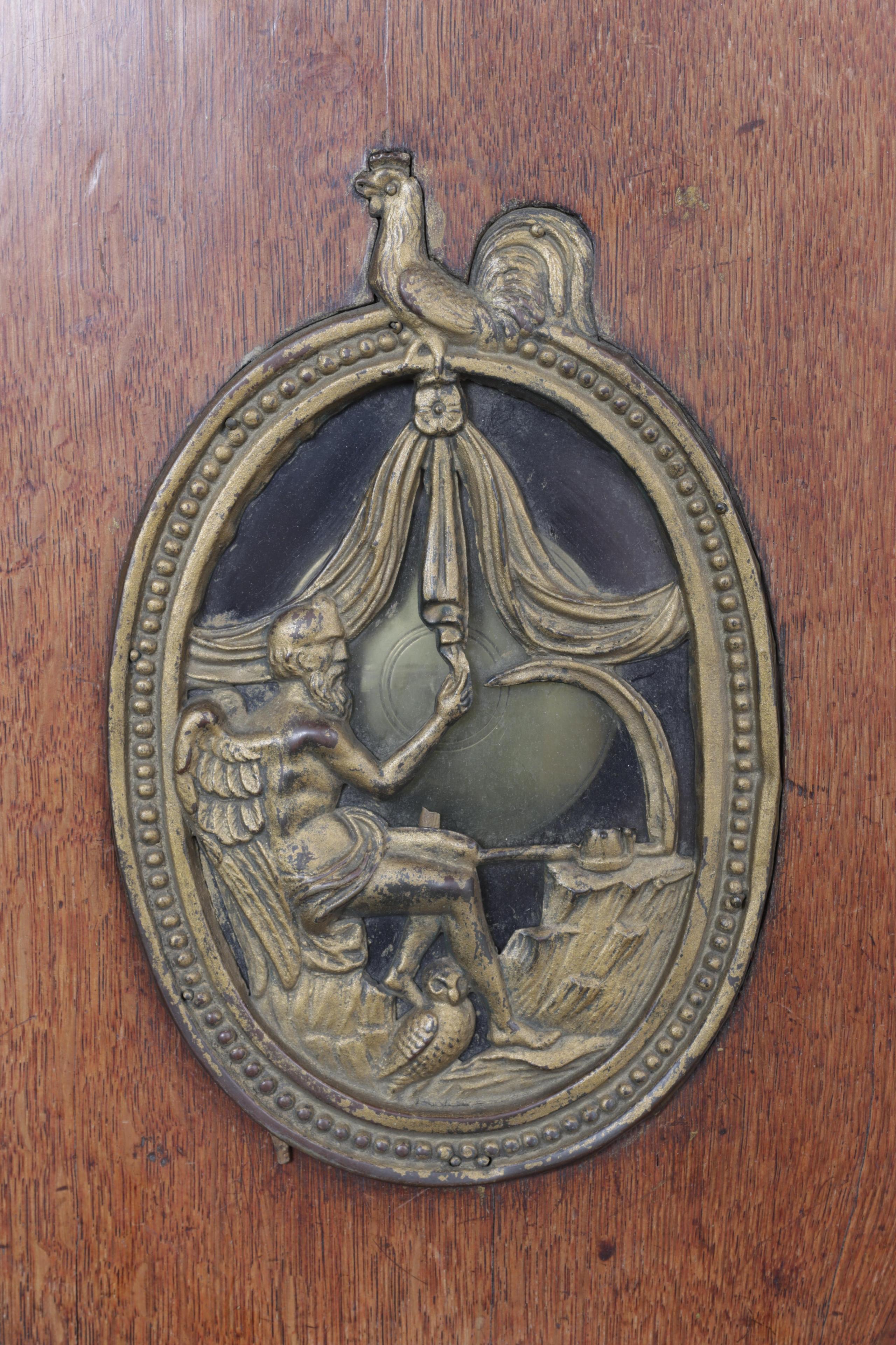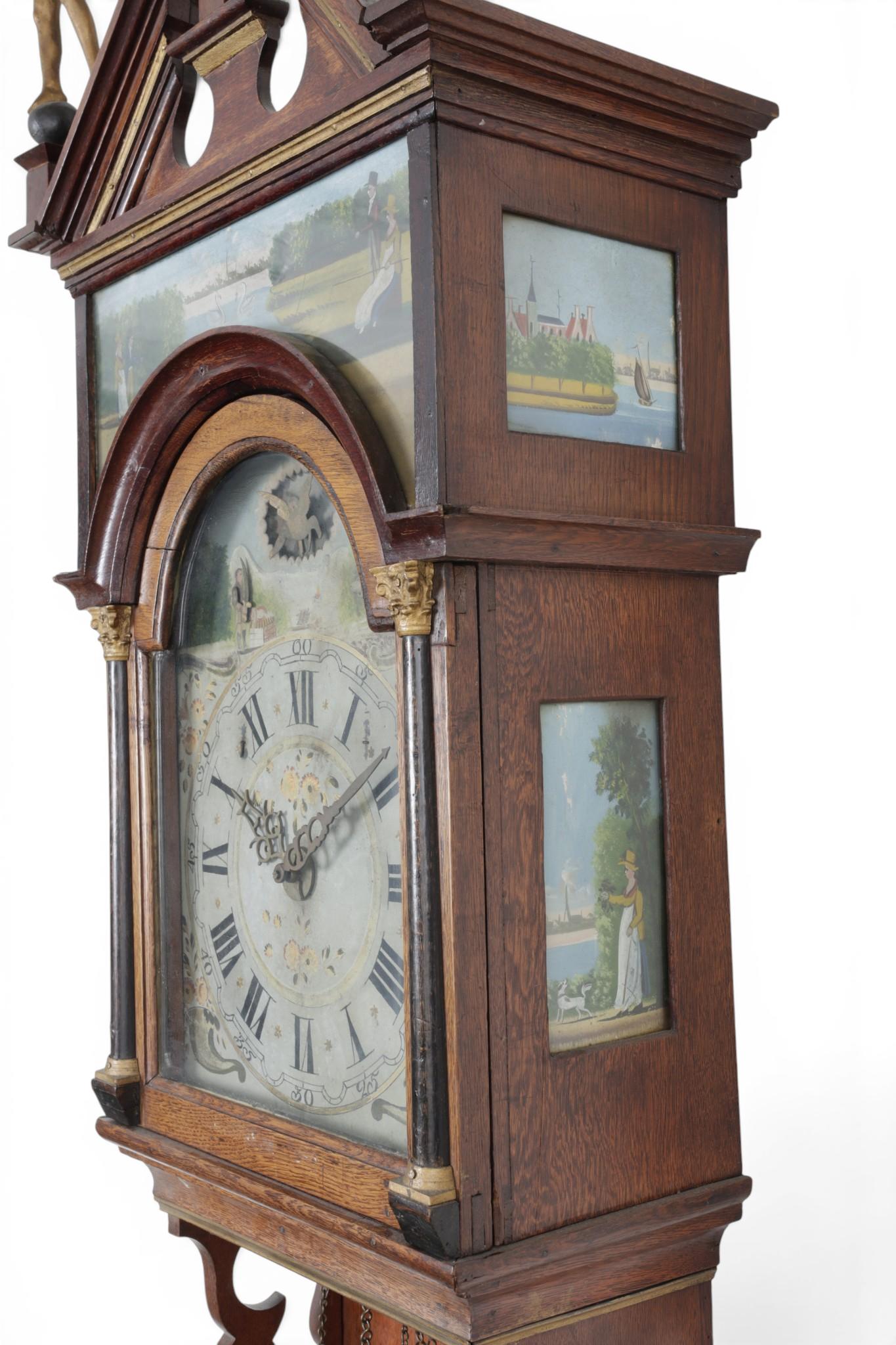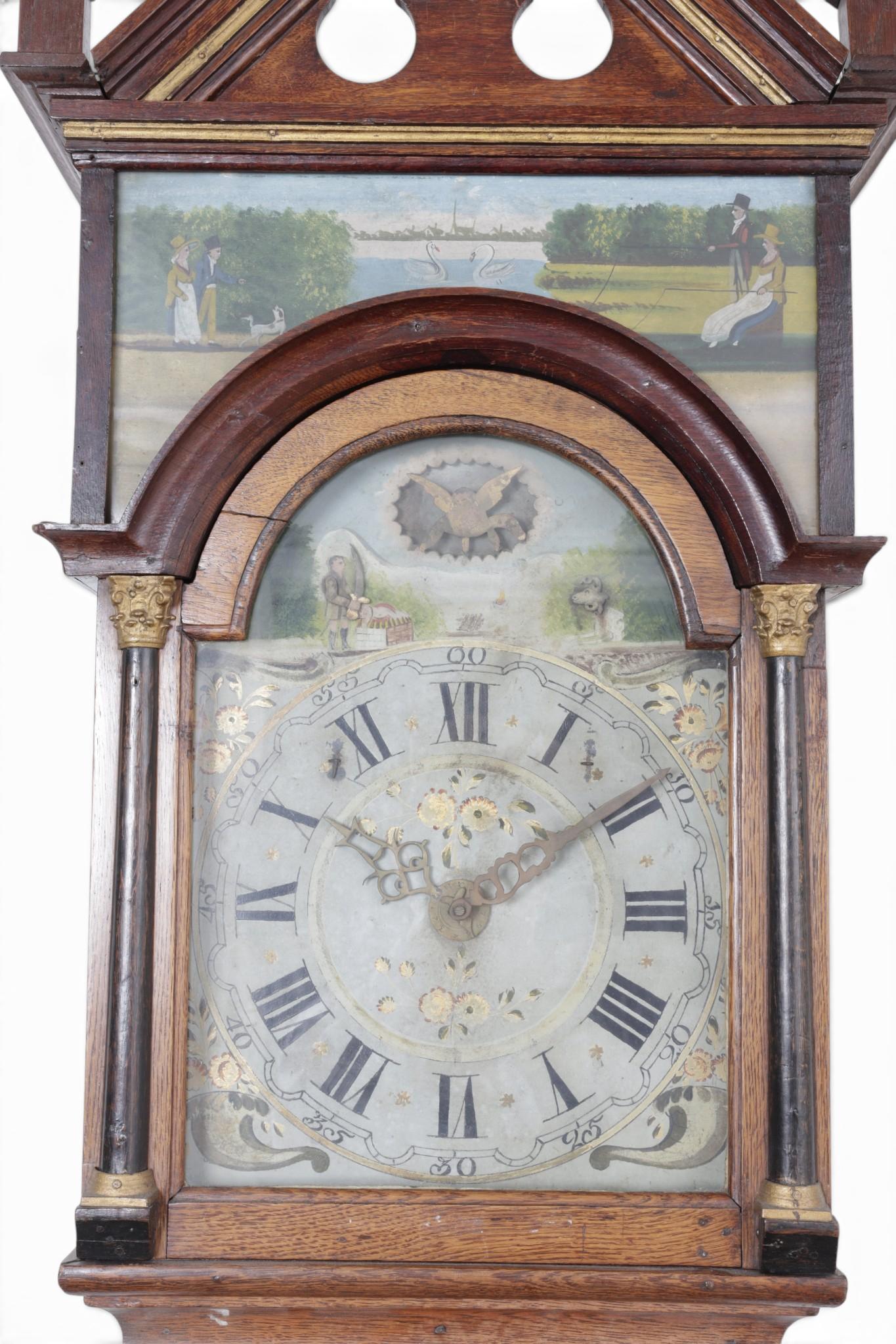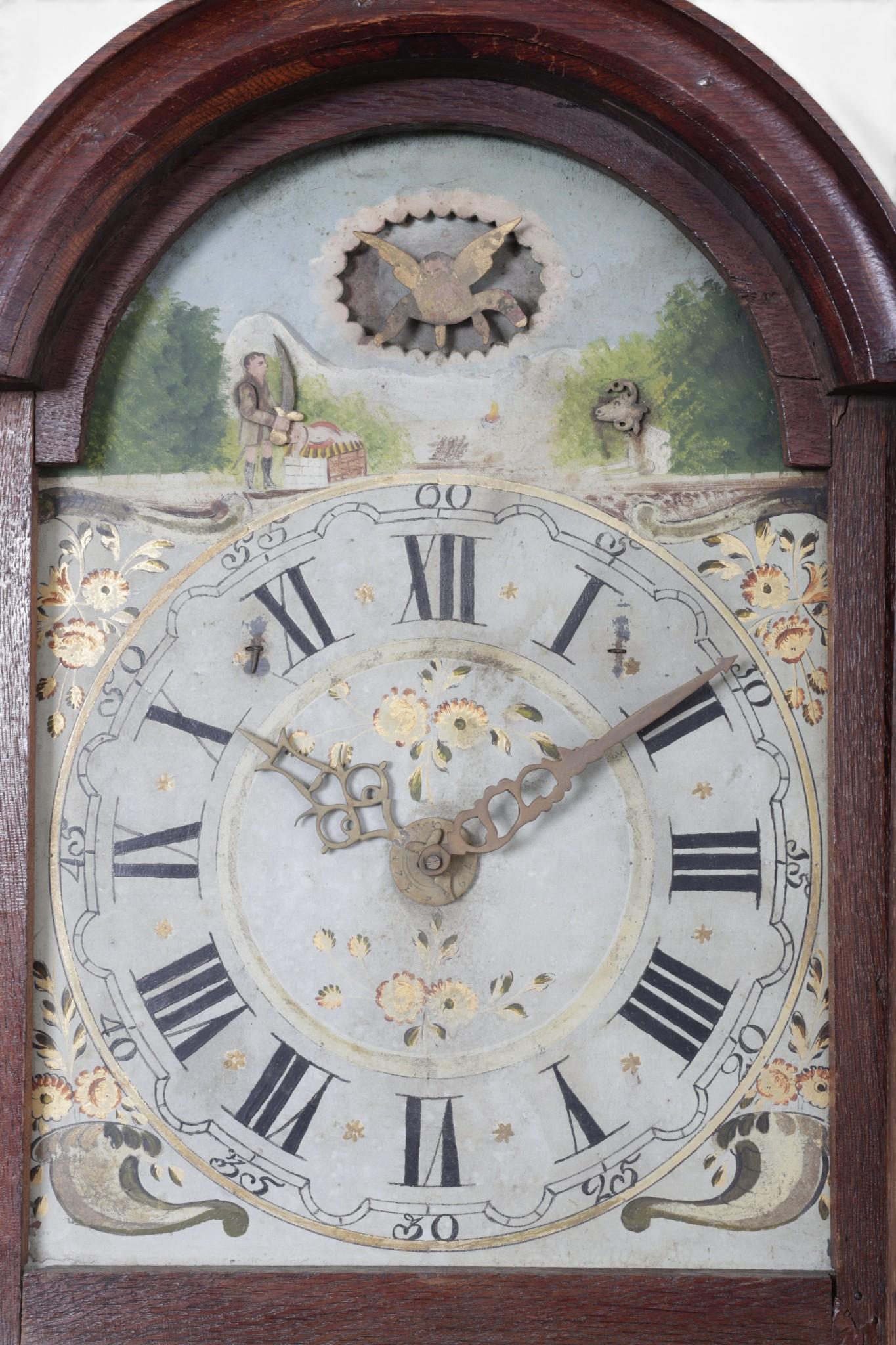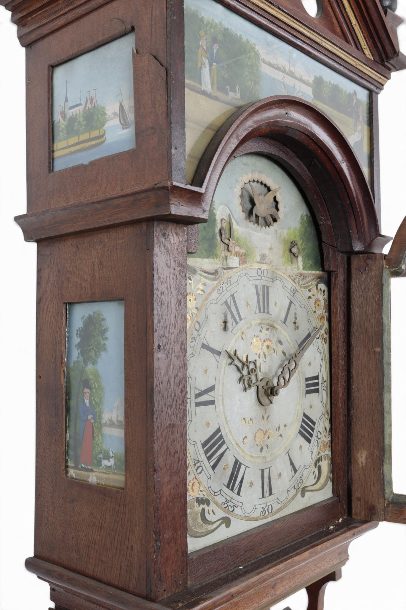 met beschilderde wijzerplaat, mechaniek en aanduiding van uren, minuten en wekker. In eikenhouten kast. De dubbele kap met beschilderde panelen, gebroken timpaan en drie verguld gestoken houten beelden. Met slinger, geen gewichten
